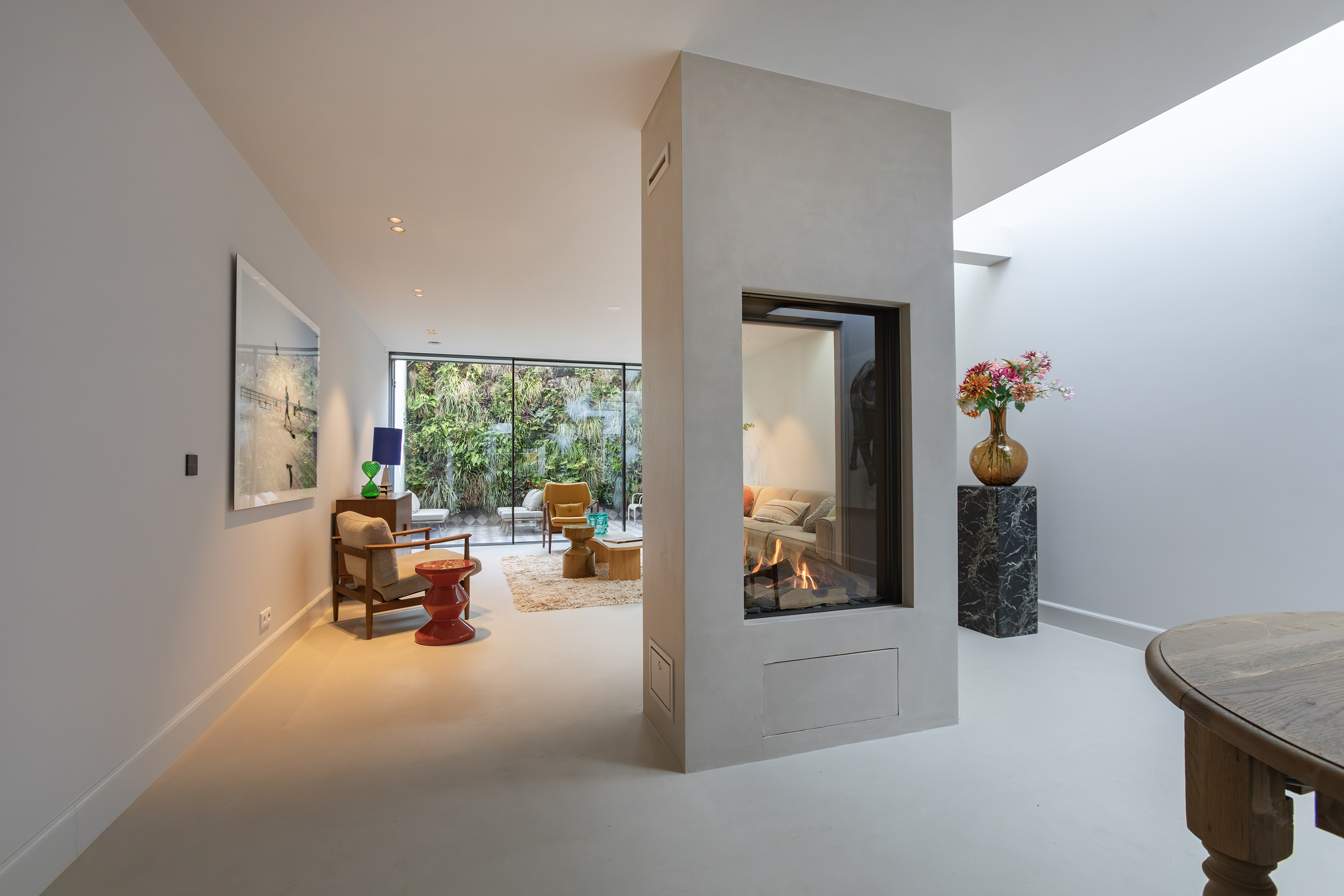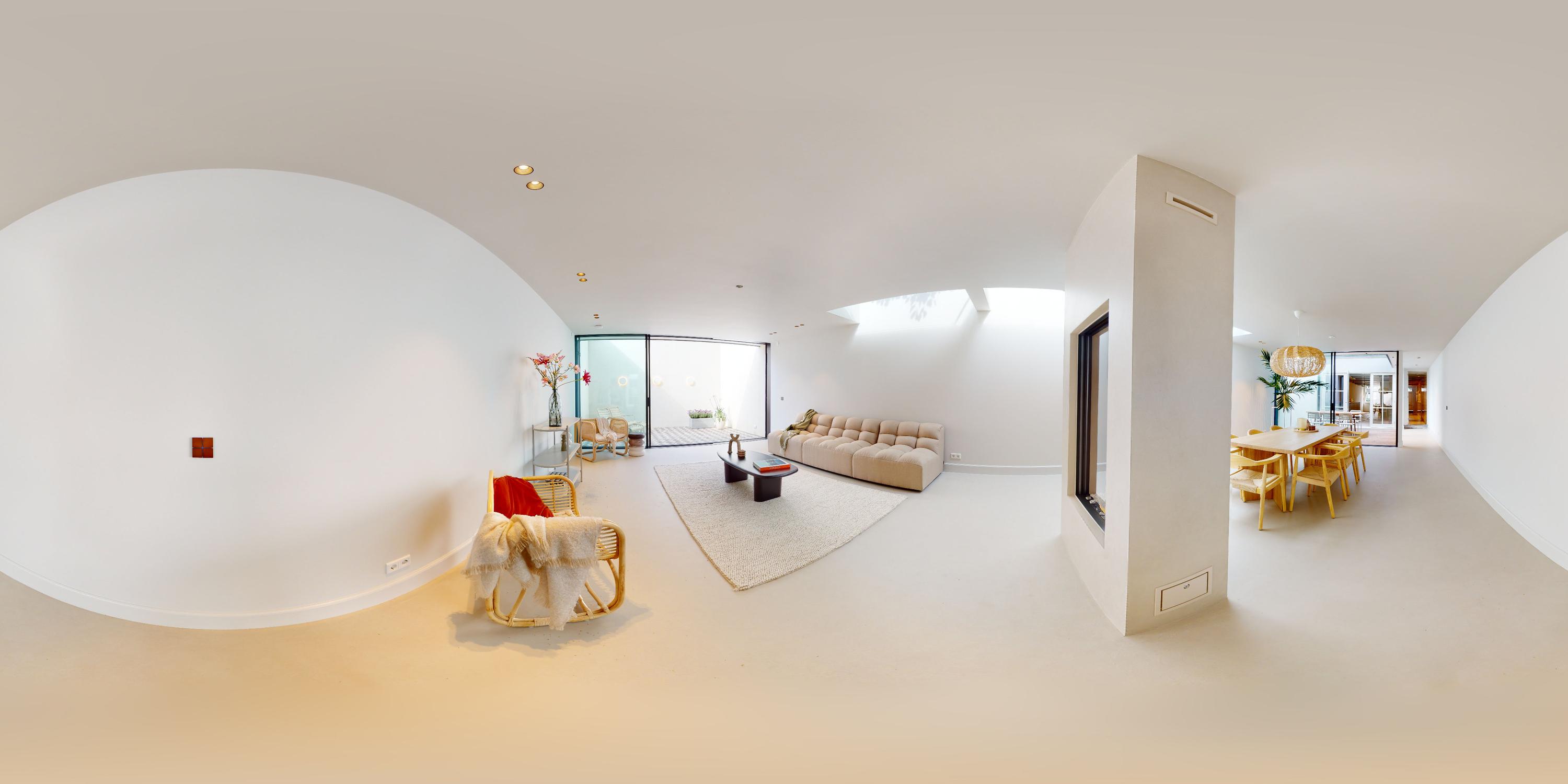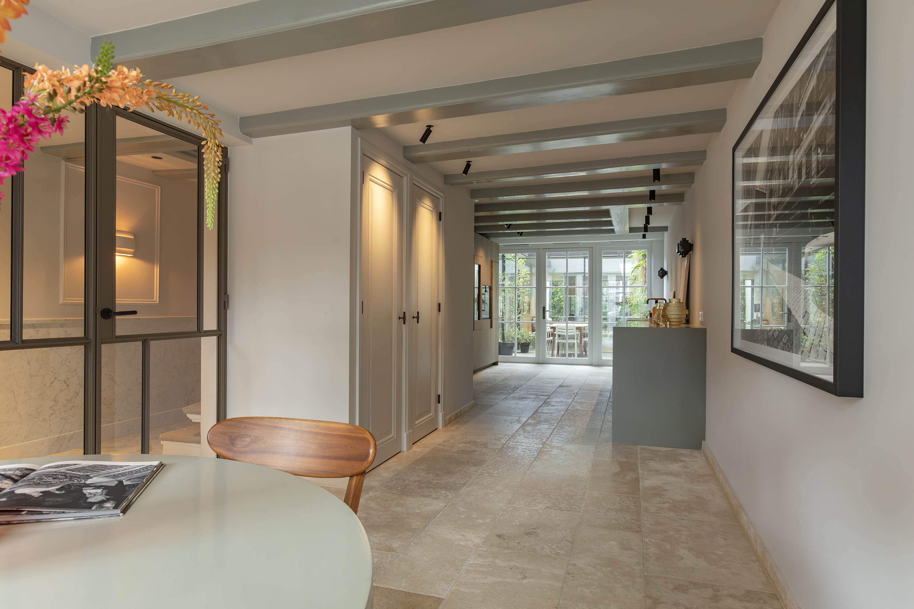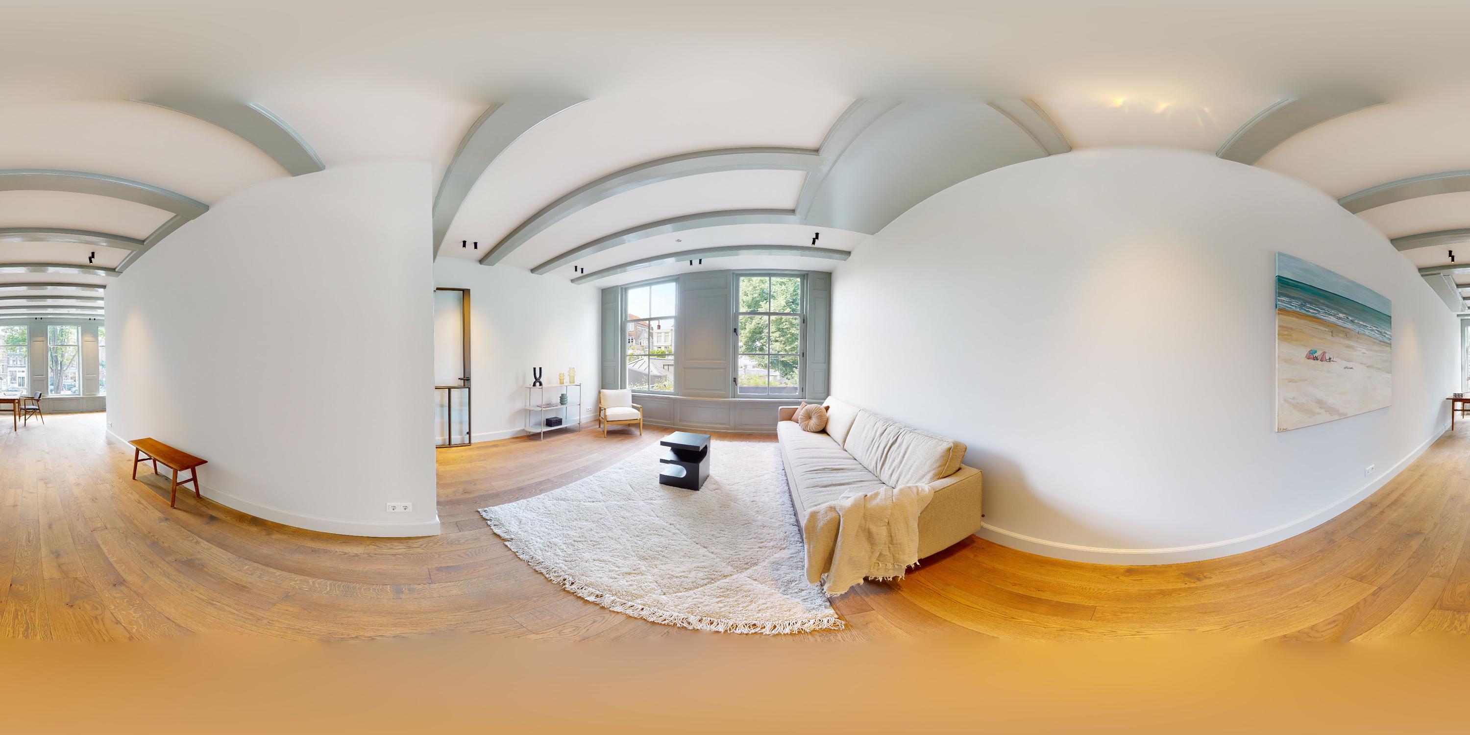 Middels een gangetje met zorgvuldig bewaard gebleven antieke witjes bereikt u de woonkamer. De woonkamer is uitgevoerd met een microcement vloer en schouw en is voorzien van een grote doorkijk gashaard en via een mooie schuifpui bereikt u de tweede patio welke is voorzien van authentieke tegels. Zowel de beide patio’s als de dakramen voorzien deze ruimte van veel licht. De begane grond heeft in totaal een lengte van maar liefst ruim 30 meter wat echt uniek te noemen is aan de gracht in Amsterdam.