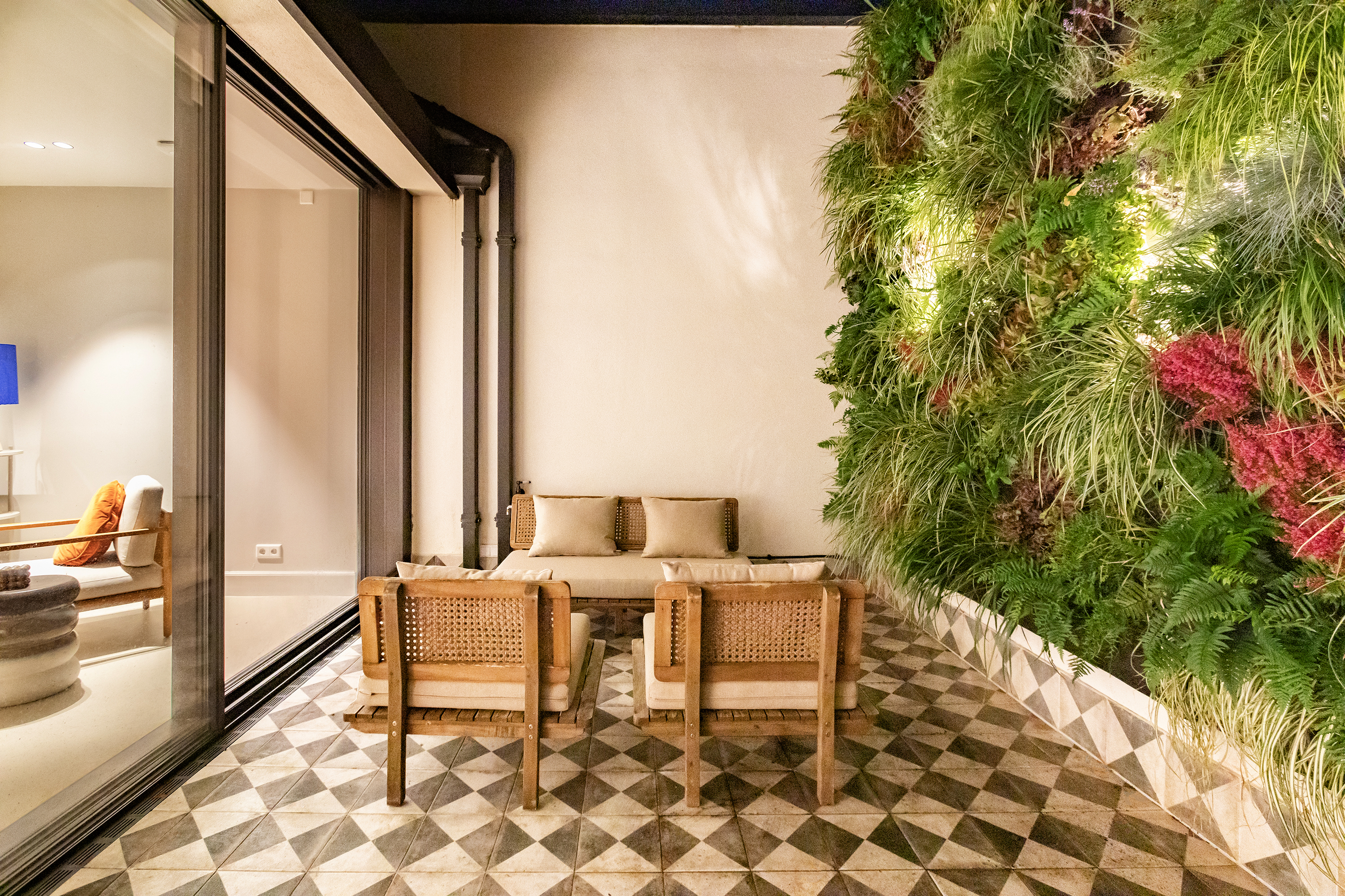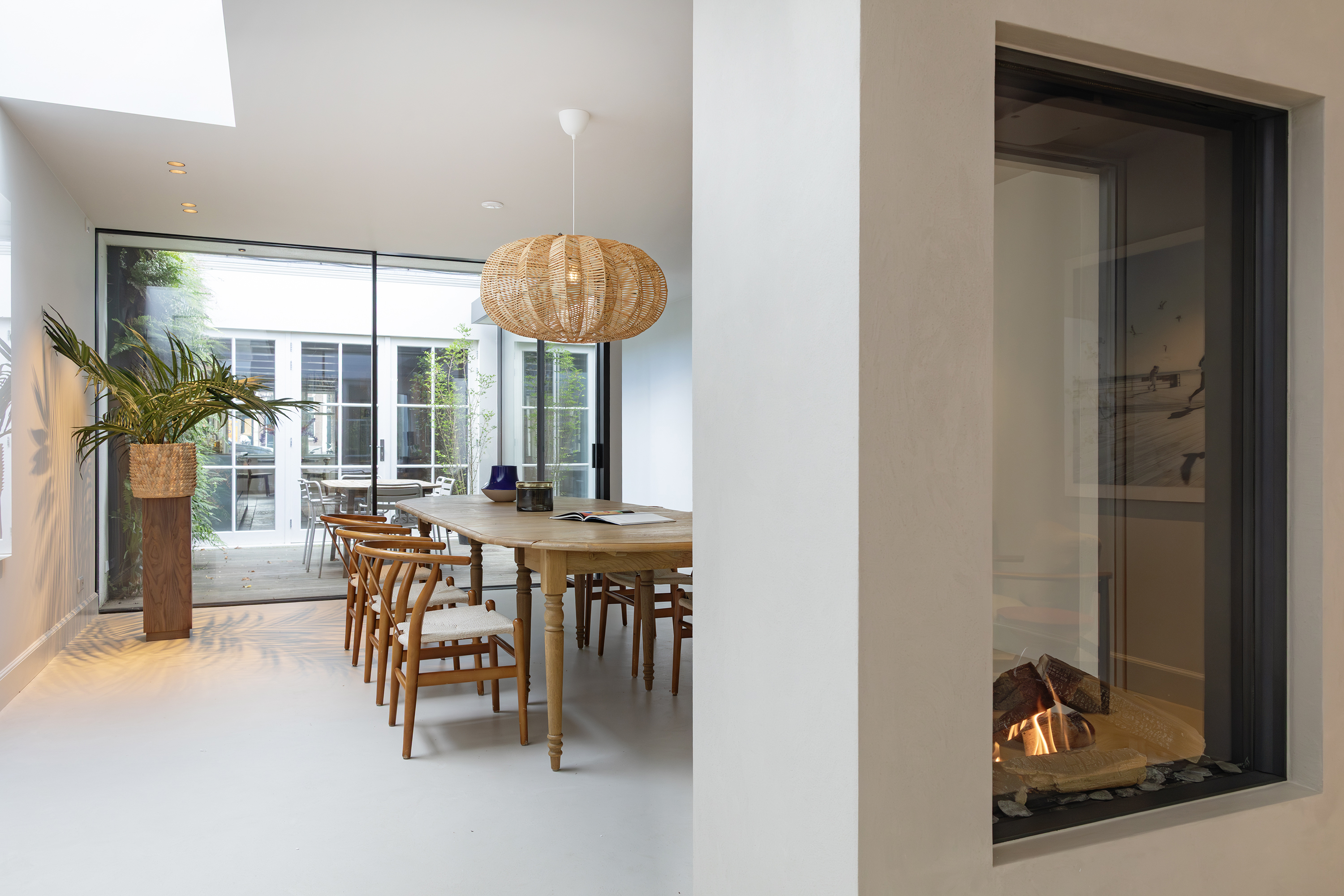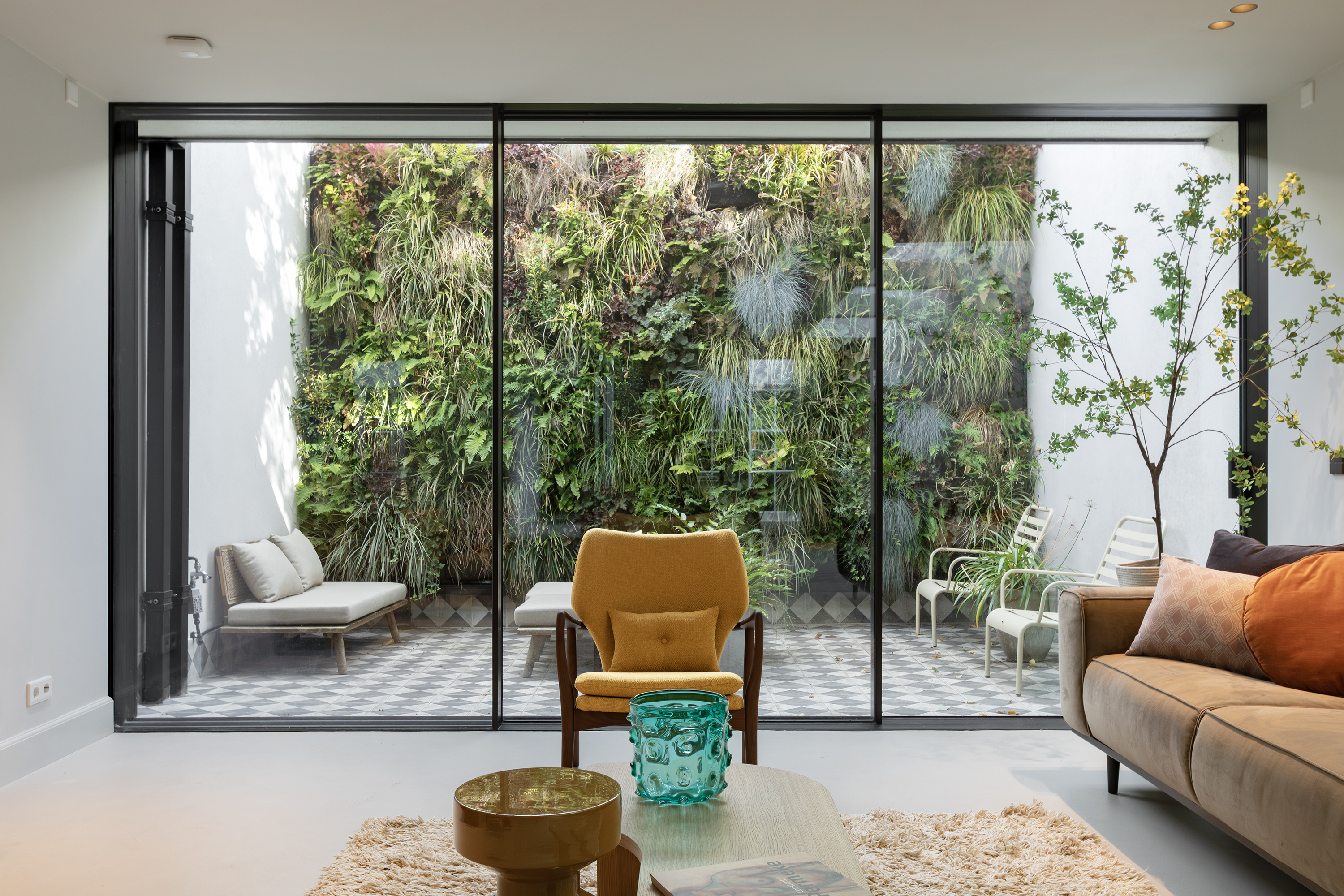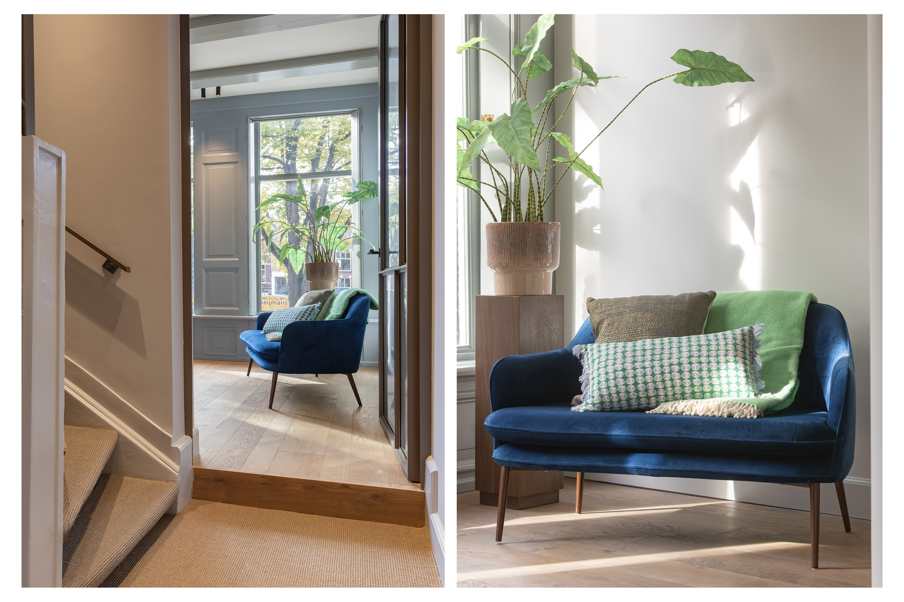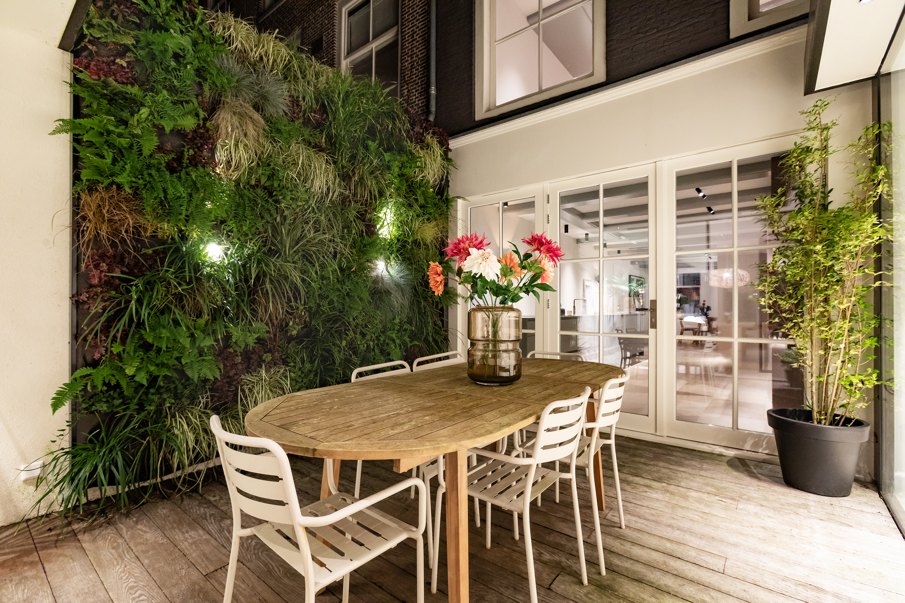 Middels een gangetje met zorgvuldig bewaard gebleven antieke witjes bereikt u de woonkamer. De woonkamer is uitgevoerd met een microcement vloer en schouw en is voorzien van een grote doorkijk gashaard en via een mooie schuifpui bereikt u de tweede patio welke is voorzien van authentieke tegels. Zowel de beide patio’s als de dakramen voorzien deze ruimte van veel licht. De begane grond heeft in totaal een lengte van maar liefst ruim 30 meter wat echt uniek te noemen is aan de gracht in Amsterdam.