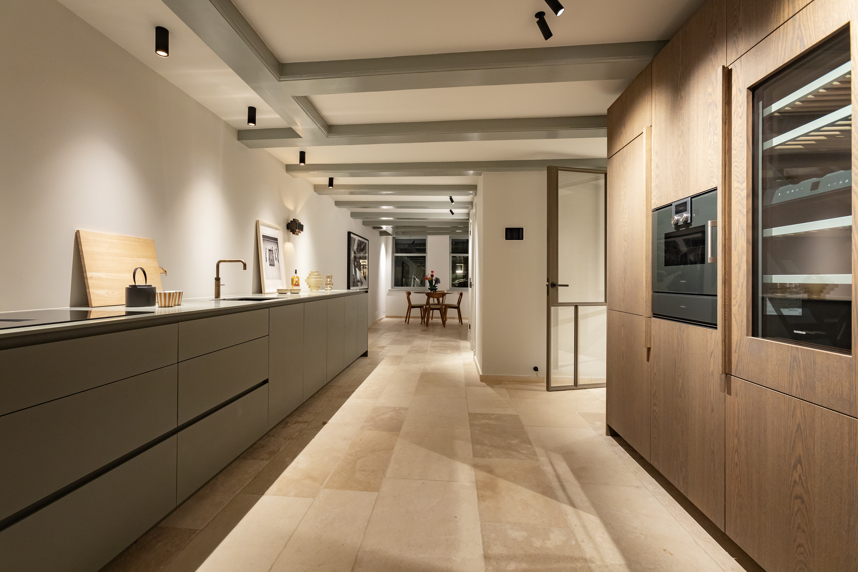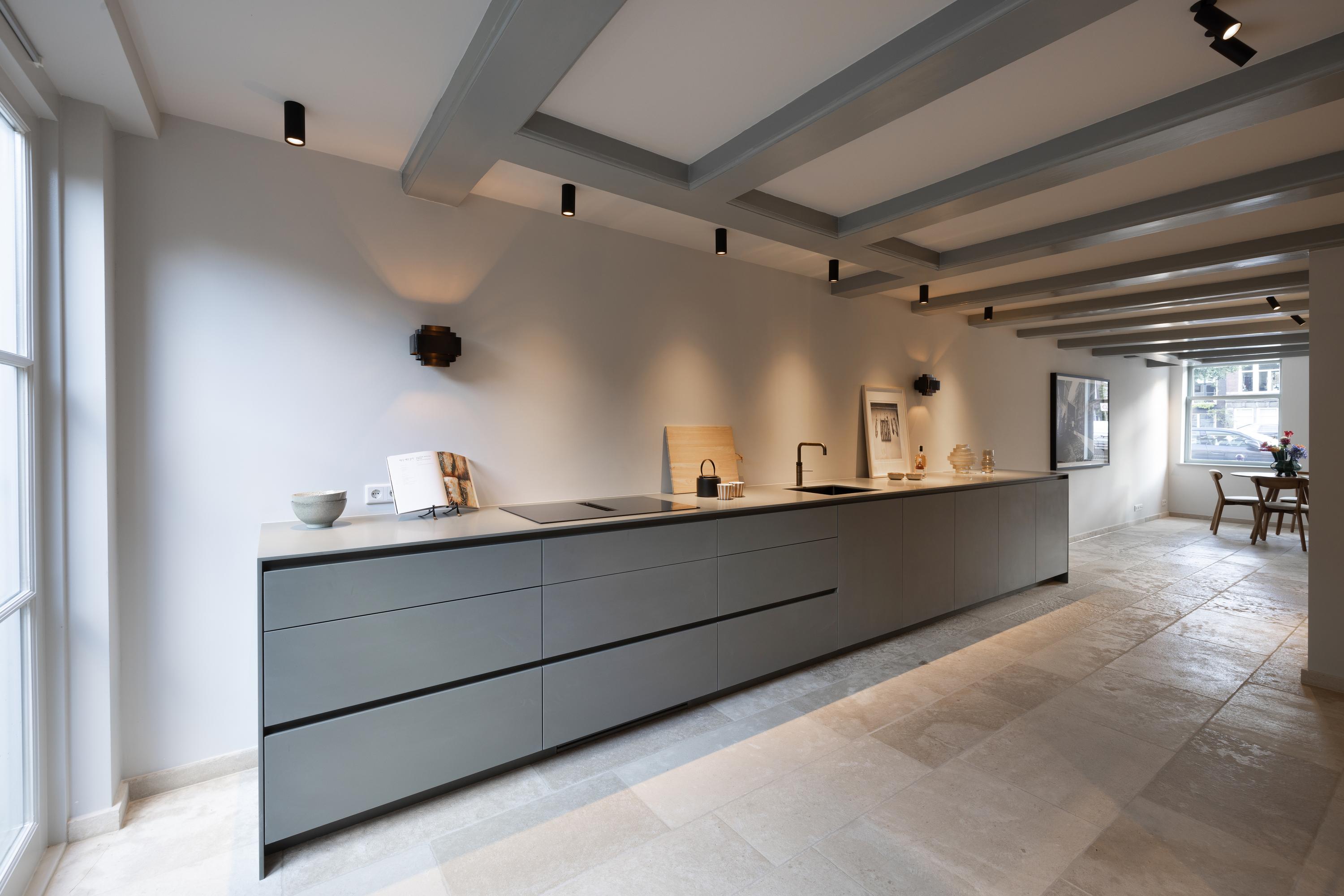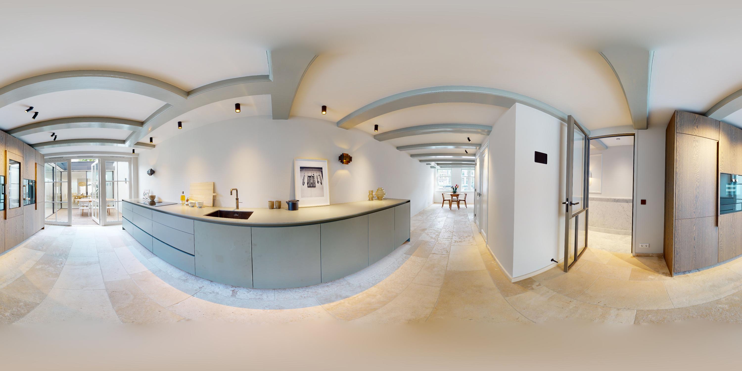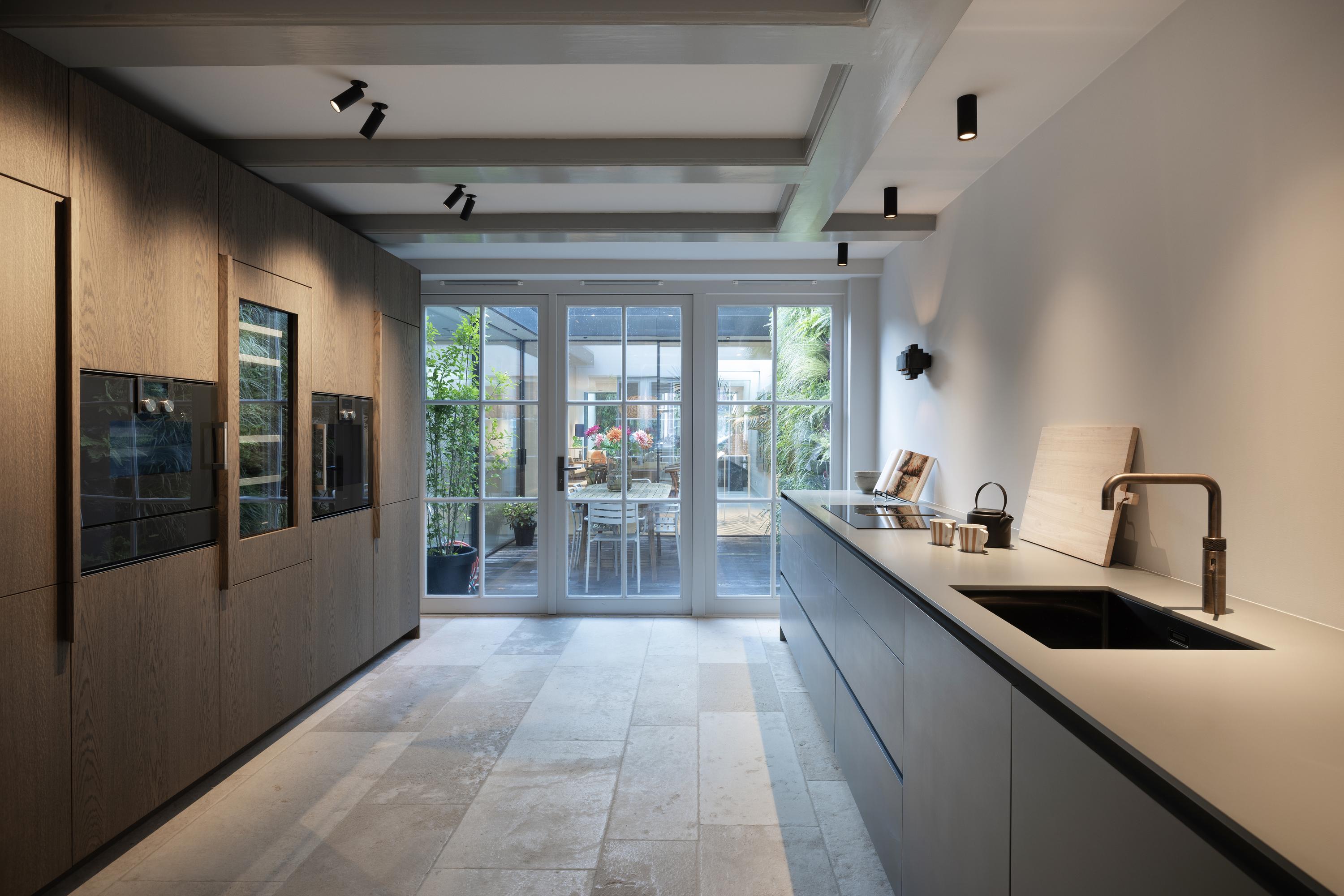 Middels prachtige stalen deuren met veel glas heeft u toegang tot de woonkeuken. Aan de voorzijde, het eetkamer gedeelte met uitzicht over de gracht middels grote raampartijen. De luxe afgewerkte keuken beschikt over alle denkbare Gaggenau inbouwapparatuur zoals een dubbele koelkast en vriezer, vaatwasser, wijnklimaatkast, (stoom)oven, warmhoud lade, spoelbak met Quooker kraan en inductiekookplaat met ingebouwd afzuigsysteem. Een ruime patio voorziet deze ruimte van bijzonder veel licht en deze patio is te bereiken vanuit zowel de keuken als de woonkamer.
