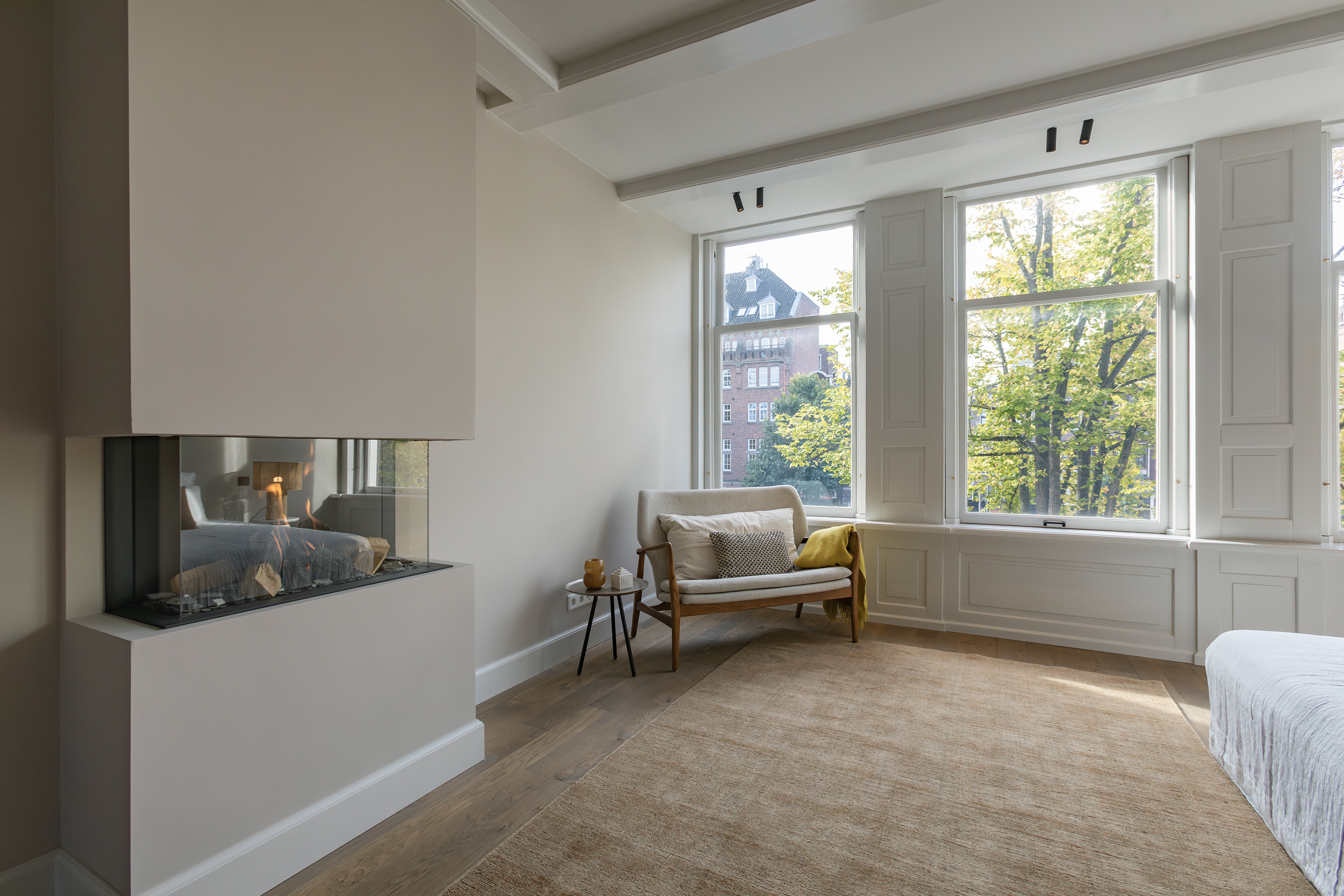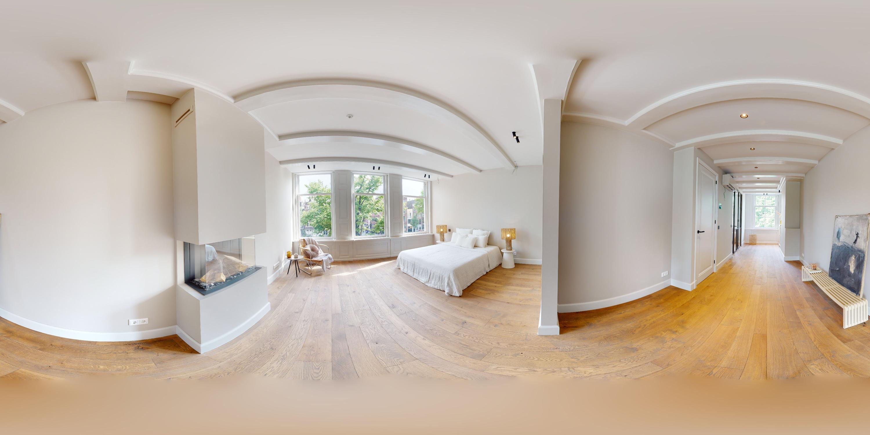 Deze gehele verdieping fungeert als master bedroom. Via de overloop bereikt u de riante slaapkamer die over de gehele verdieping doorloopt. Grote raampartijen aan de voorzijde bieden prachtig uitzicht over de gracht en voorzien de kamer van veel licht. De authentieke balken in het plafond en de gashaard zorgen voor een bijzonder luxe uitstraling. Aan de achterzijde, de luxe afgewerkte badkamer met vrijstaand ligbad, dubbele wastafel met op maat gemaakt meubel, toilet en inloopdouche.
