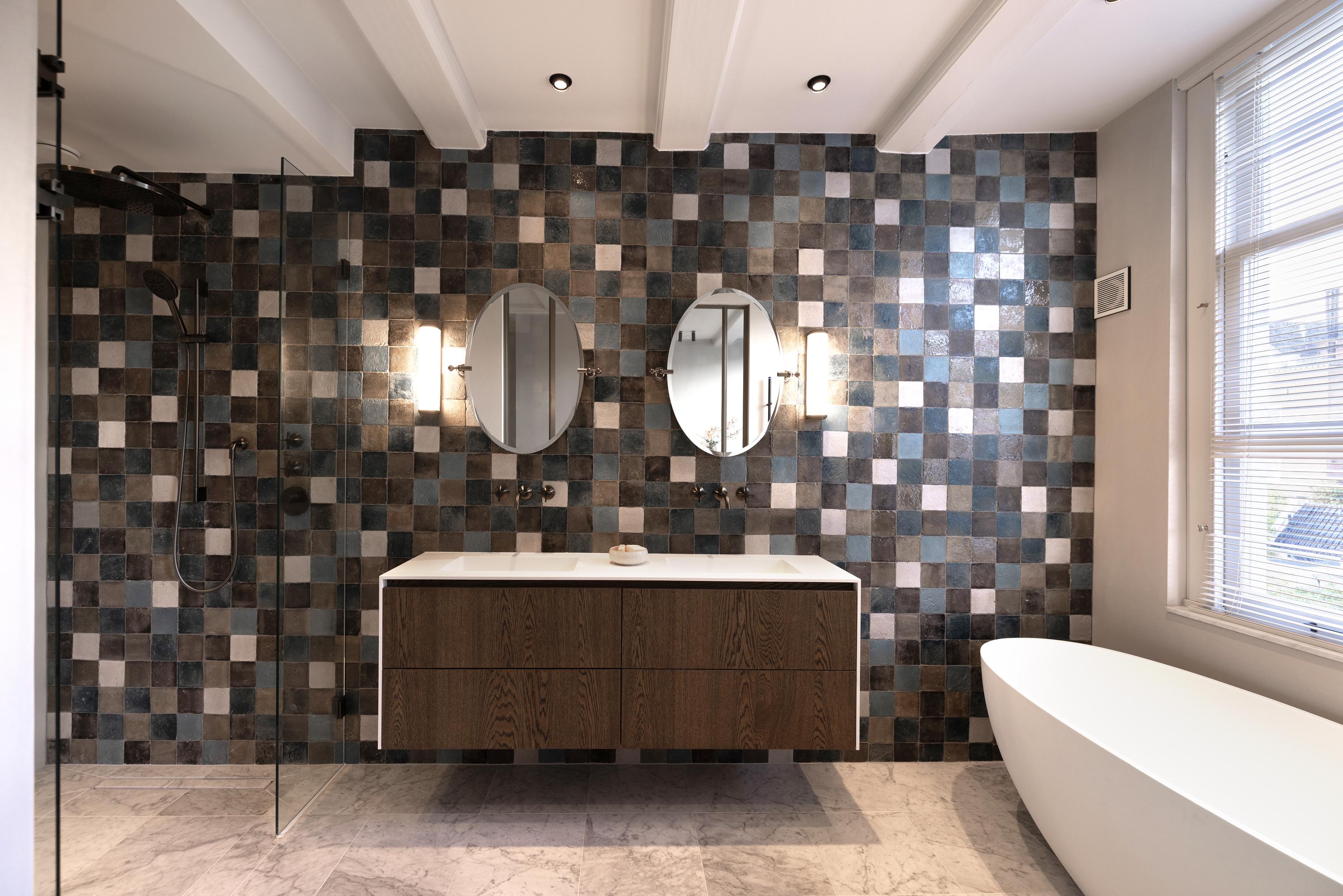 - Hoogwaardige uitgevoerde badkamers met authentieke tegel, microcement en Dornbracht kranen