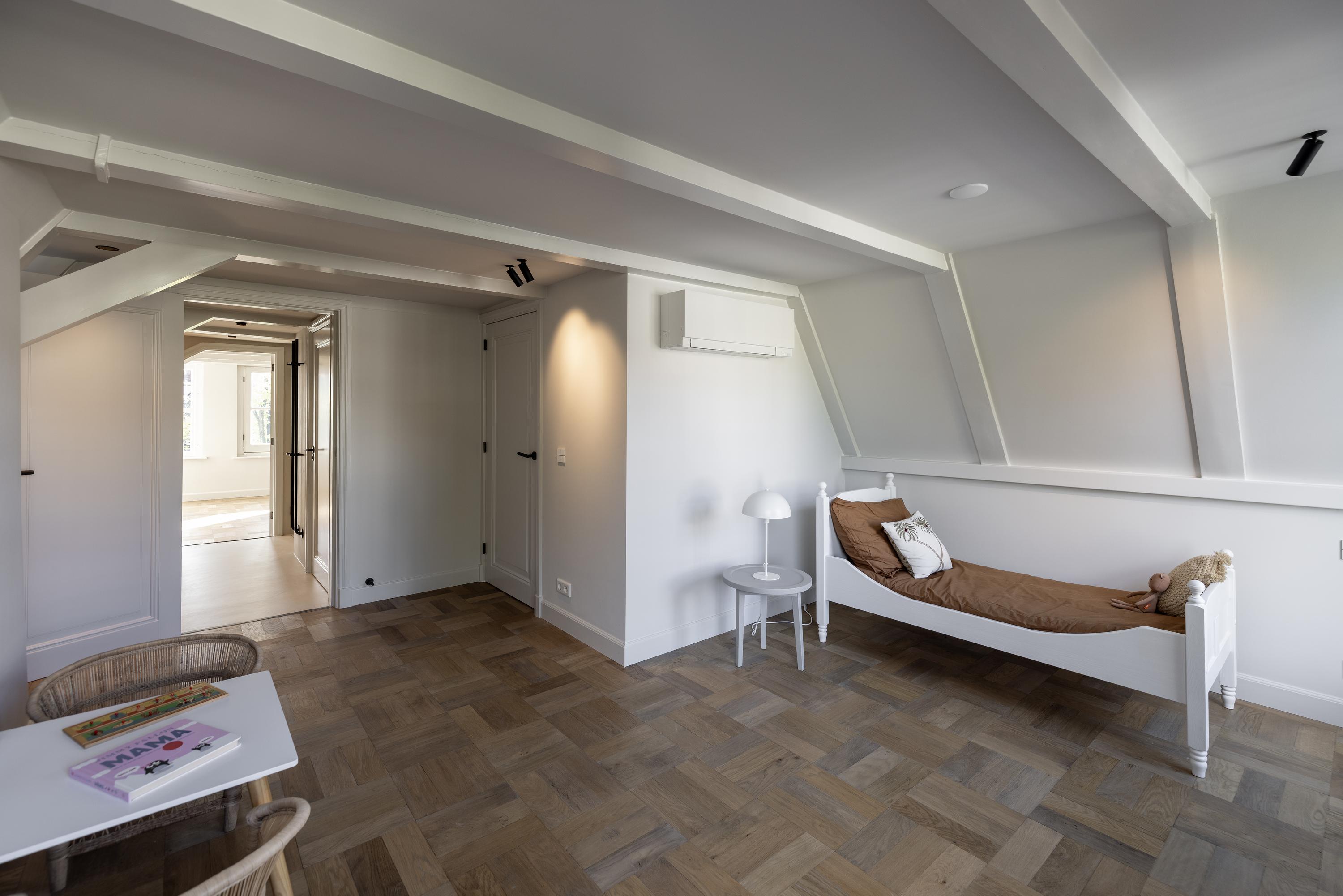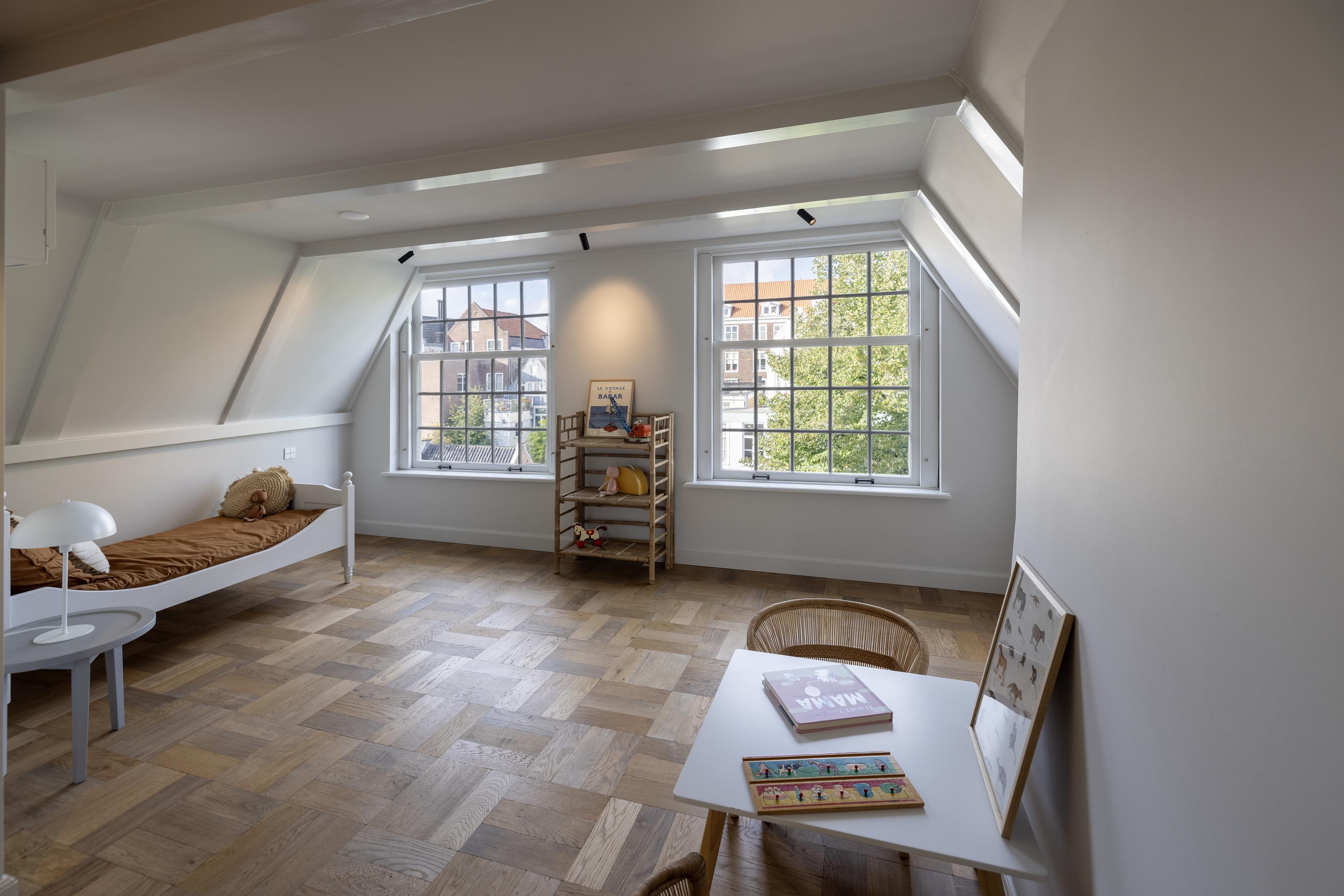 Deze gehele verdieping alsmede de tweede verdieping zijn voorzien van een prachtige Franse eikenhouten vloer uitgevoerd in verschillende breedtes.