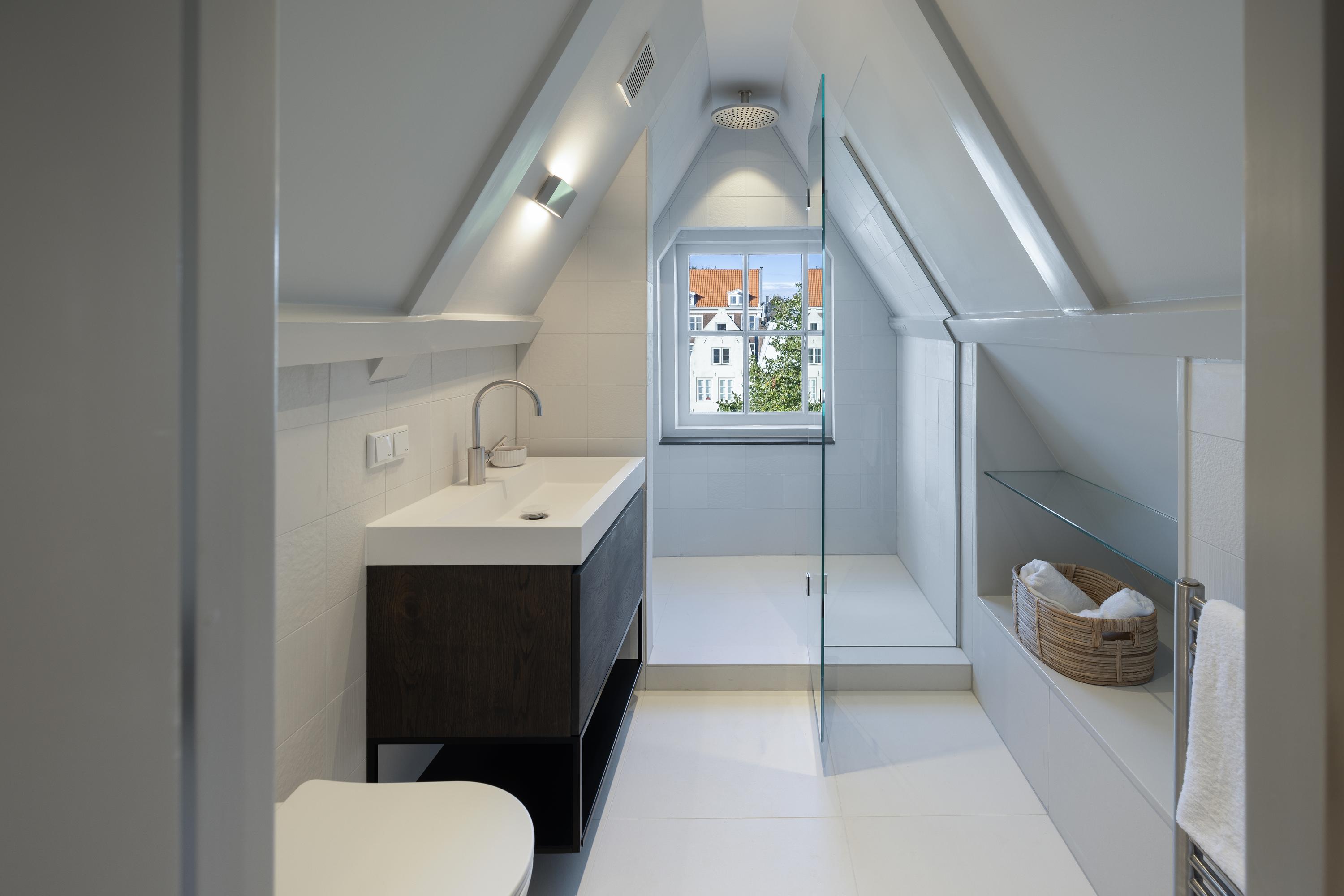 Middels een trap op de overloop op de vierde verdieping bereikt u de zolderetage van de woning. Hier treft u een goed bemeten slaapkamer, voldoende opbergruimte en een badkamer voorzien van een wastafel met meubel, toilet en douche.
