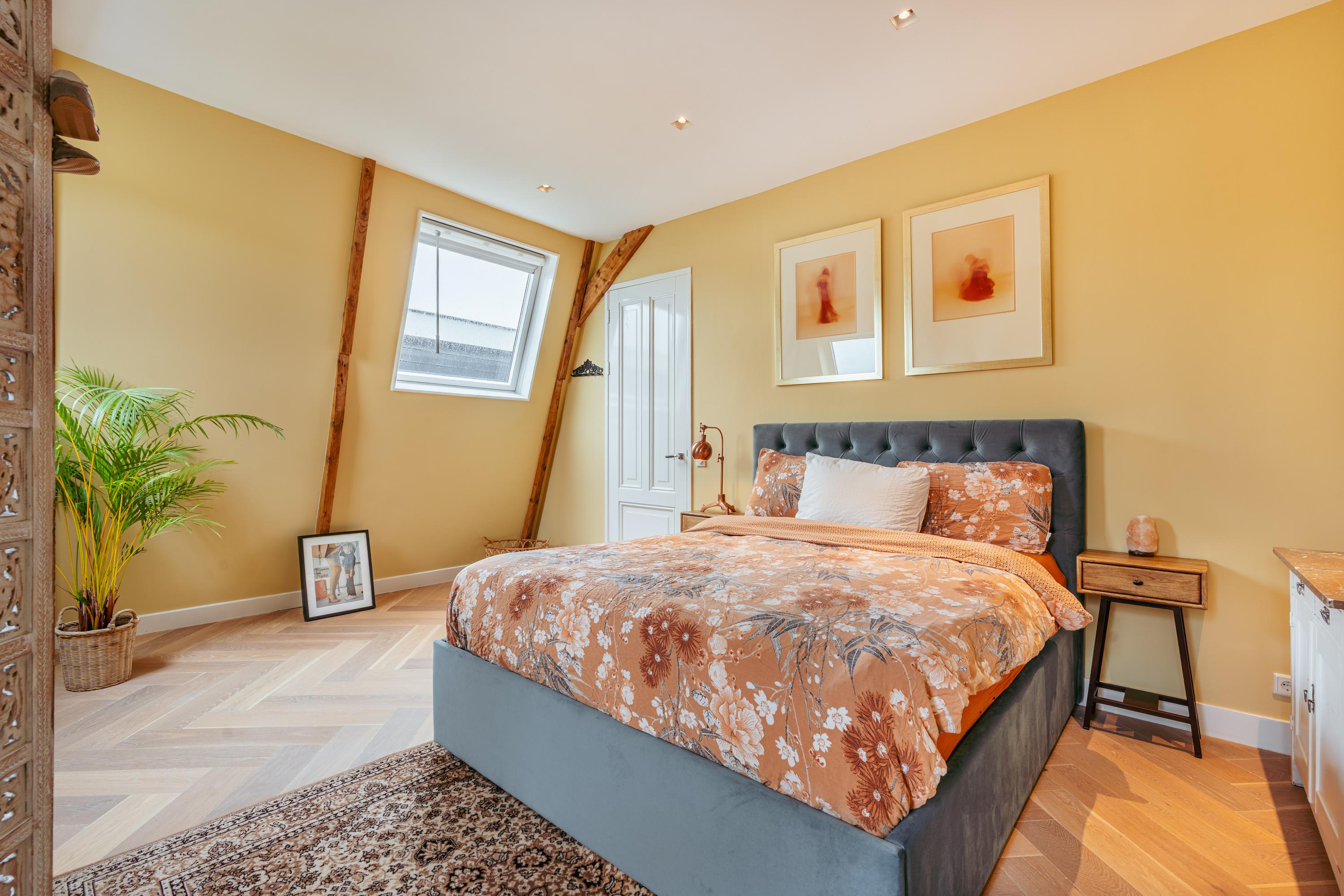 Aan de voorzijde bevindt zich de royale master bedroom, uitgevoerd in warme tinten en voorzien van karakteristieke houten balken. Dankzij het charmante boograam en de dakkapellen valt er veel licht naar binnen en is er een prachtig uitzicht op Artis. De kamer biedt ruimte voor een groot tweepersoonsbed, een garderobekast en een zit- of werkhoek.