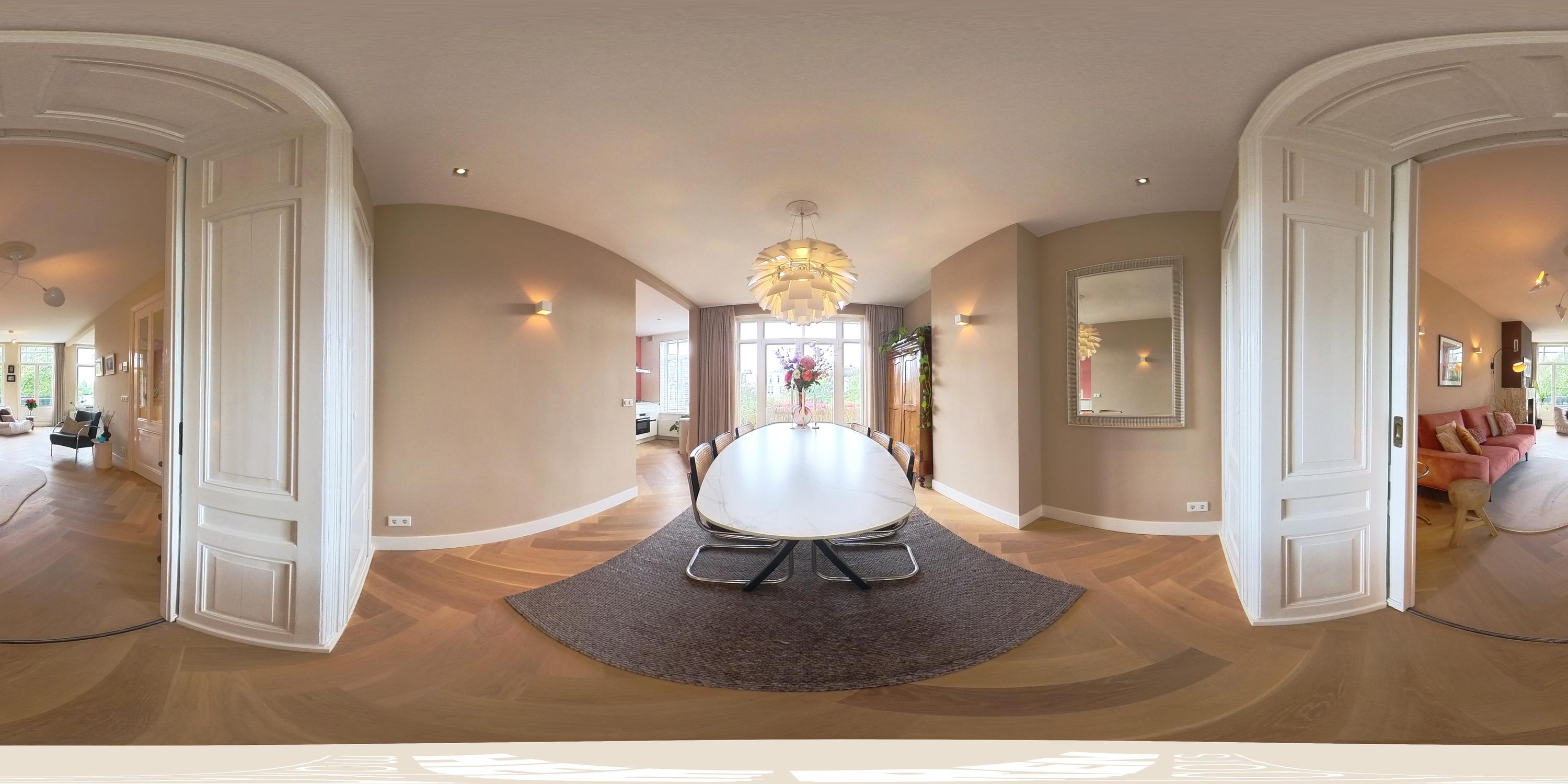 Via de originele, houten en-suite deuren bereikt u de eetkamer aan de achterzijde, waar u toegang heeft tot een tweede balkon waar u al vanaf 07:30 uur in de ochtend van de zon kan genieten. Aangrenzend ligt de moderne keuken, uitgevoerd in een frisse kleurstelling met strakke witte kasten en een royaal werkblad. De keuken is voorzien van alle gewenste inbouwapparatuur, waaronder een Quooker, combi-oven, vaatwasser, vijfpits-gasfornuis, koel-/vriescombinatie en een dubbele spoelbak. Een ideale plek voor kookliefhebbers en mensen die houden van gezellig tafelen.