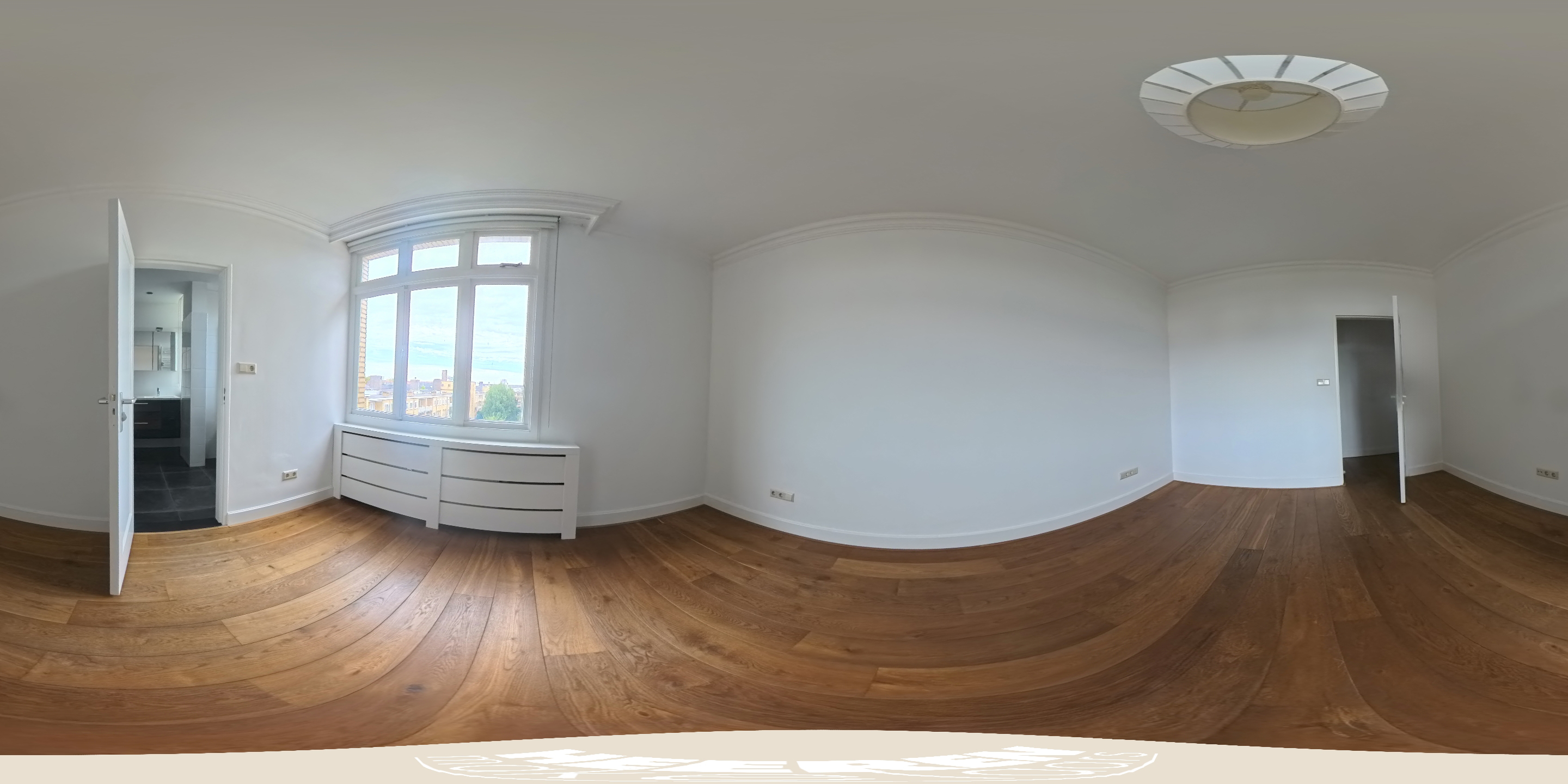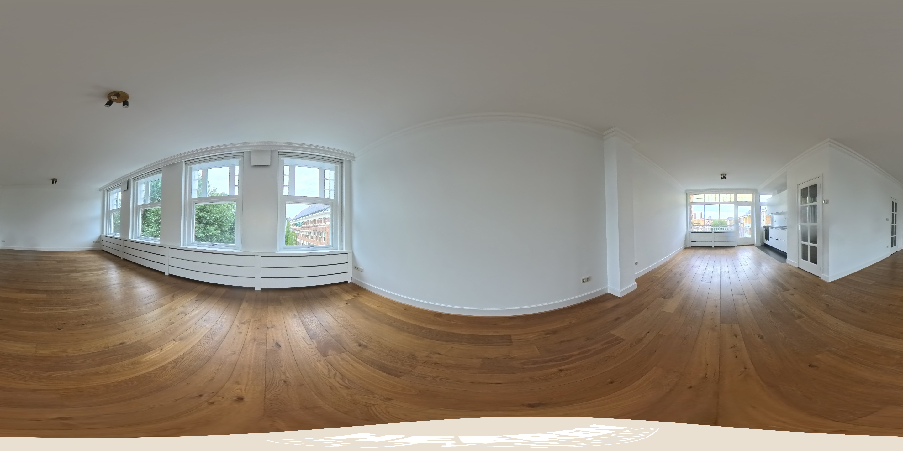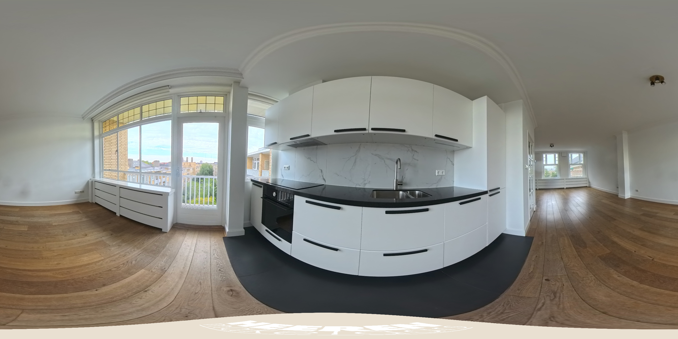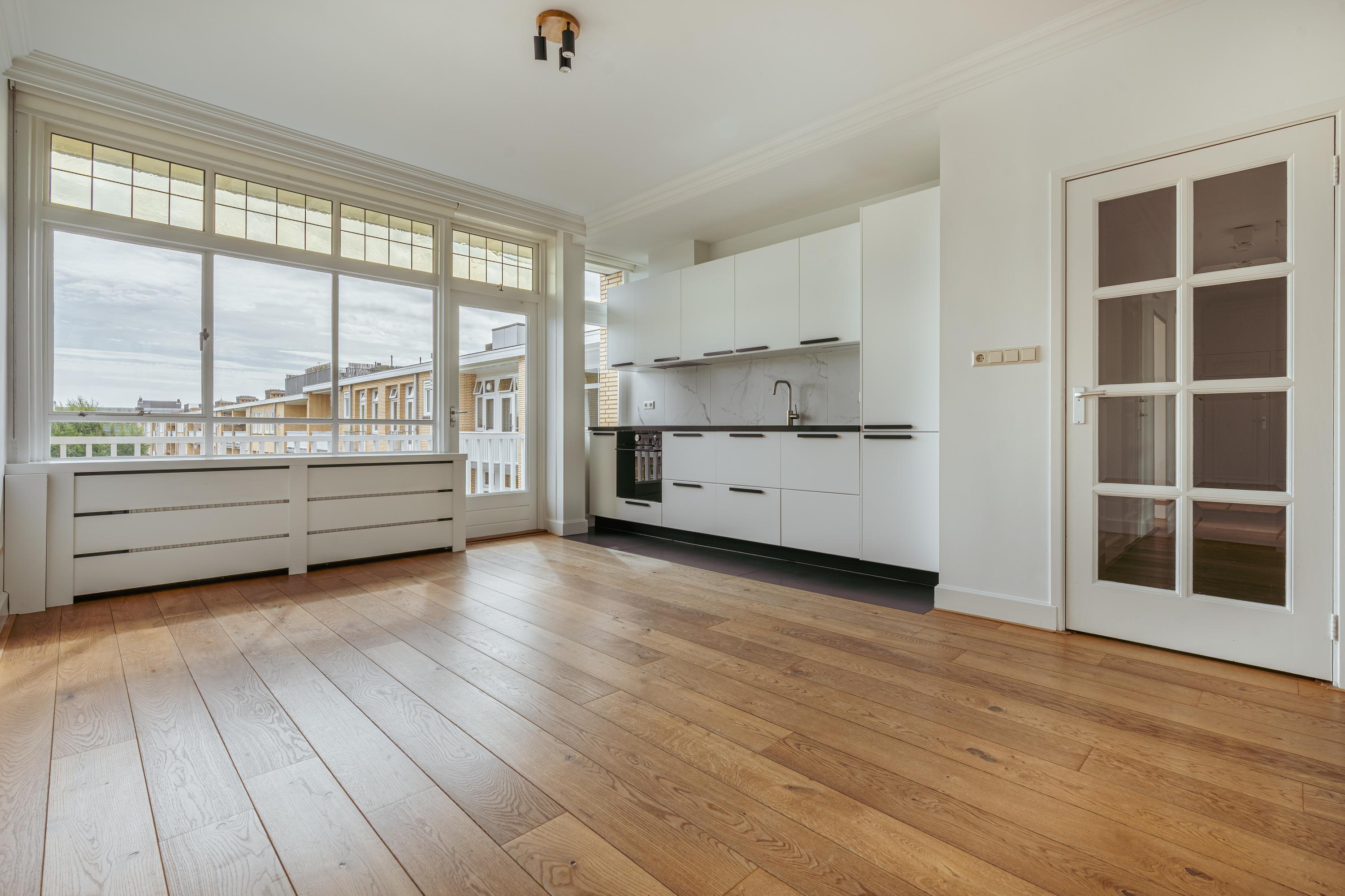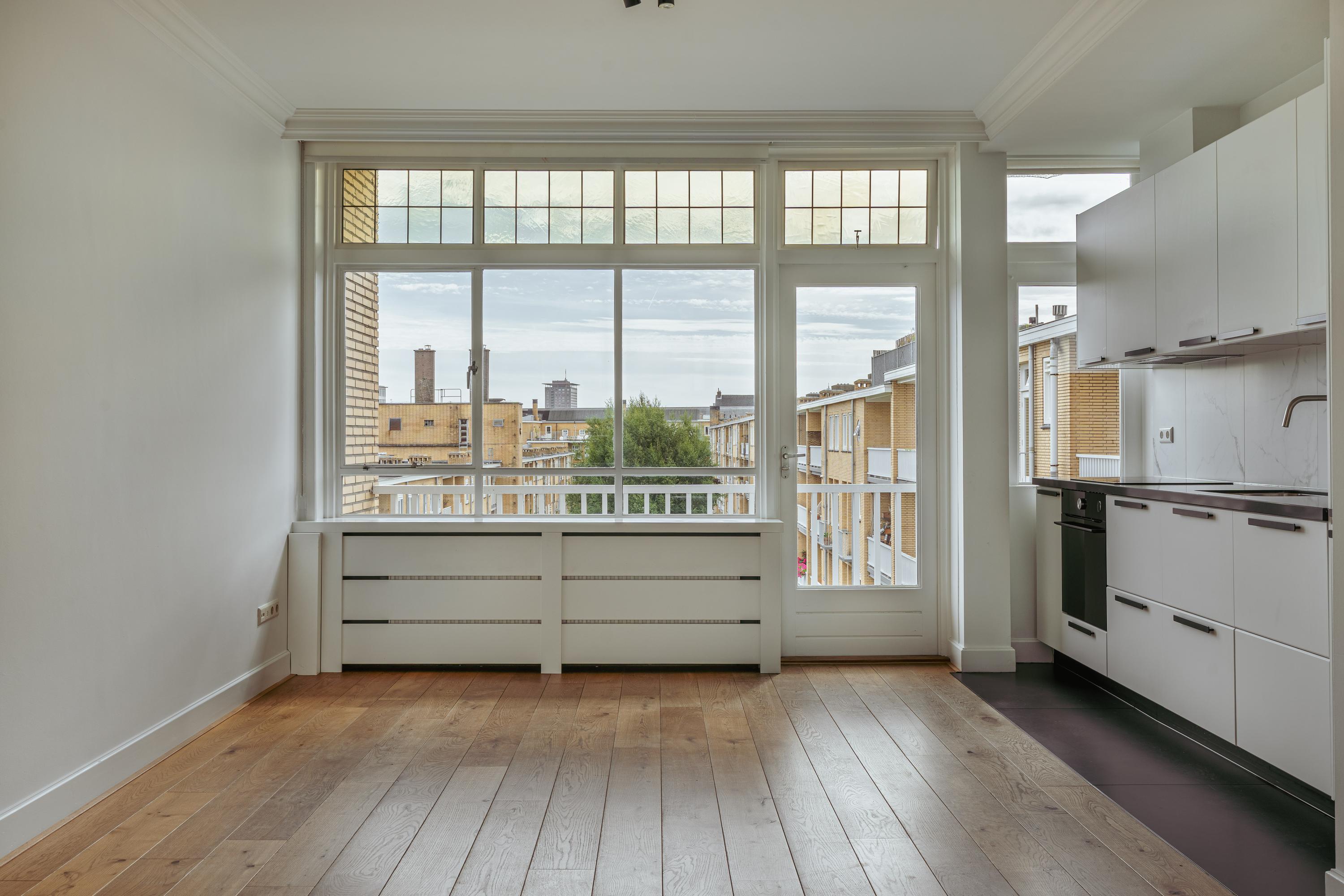 De lichte en indrukwekkend ruime woonkamer (ca. 39,5 m²) is gelegen aan de voorzijde van het pand en wordt gekenmerkt door grote raampartijen die voor veel licht zorgen met uitzicht over het groene en statige Minervaplein. De open woonkeuken is voorzien van diverse moderne inbouwapparatuur, waaronder een inductiekookplaat, combi-oven, vaatwasser, koelkast en vriezer. Vanuit de keuken heeft u toegang tot het balkon op het noord-oosten, een heerlijke plek om van de middag- en avondzon te genieten.