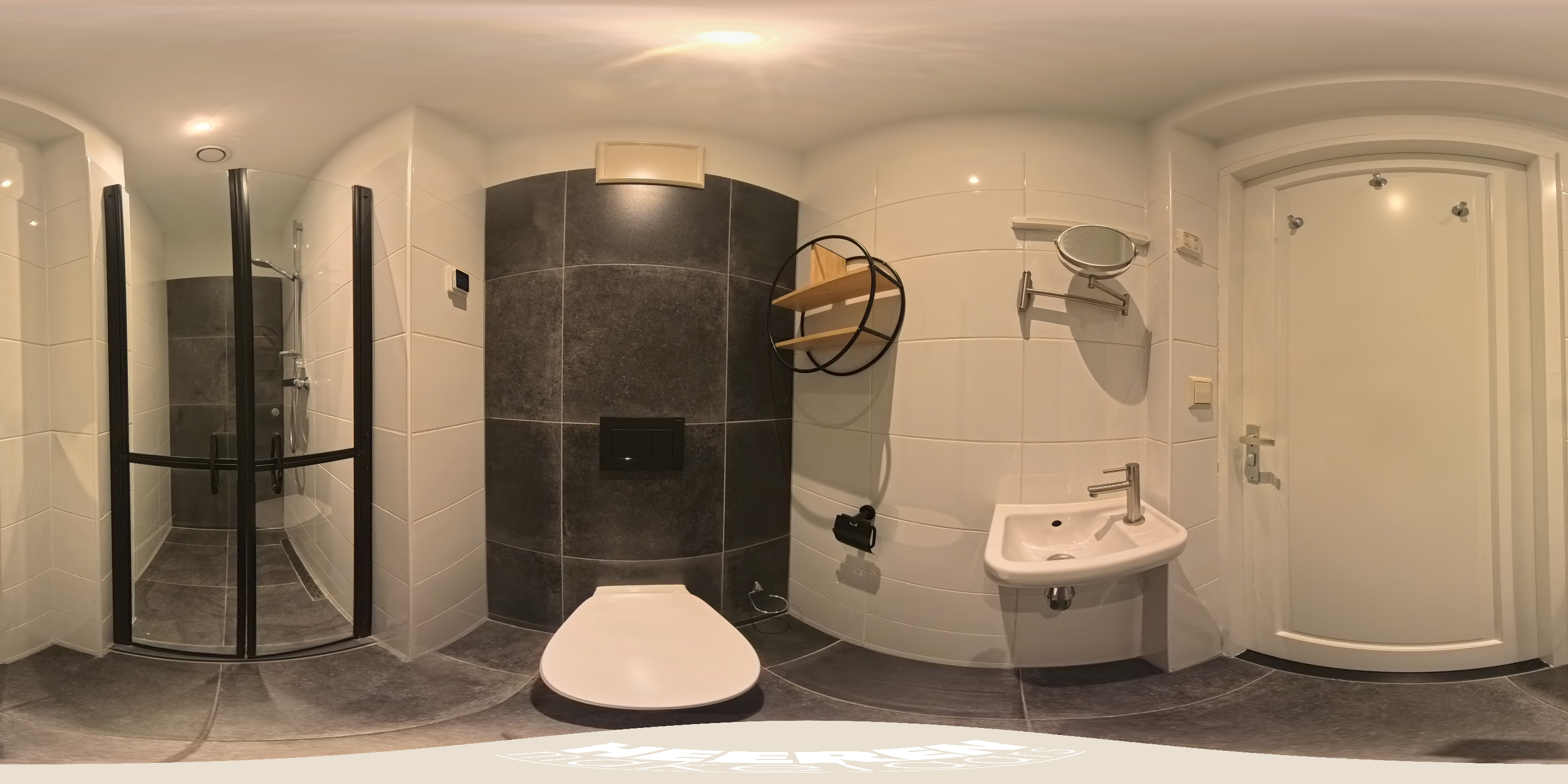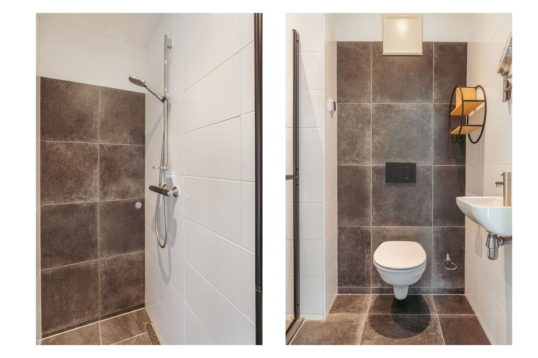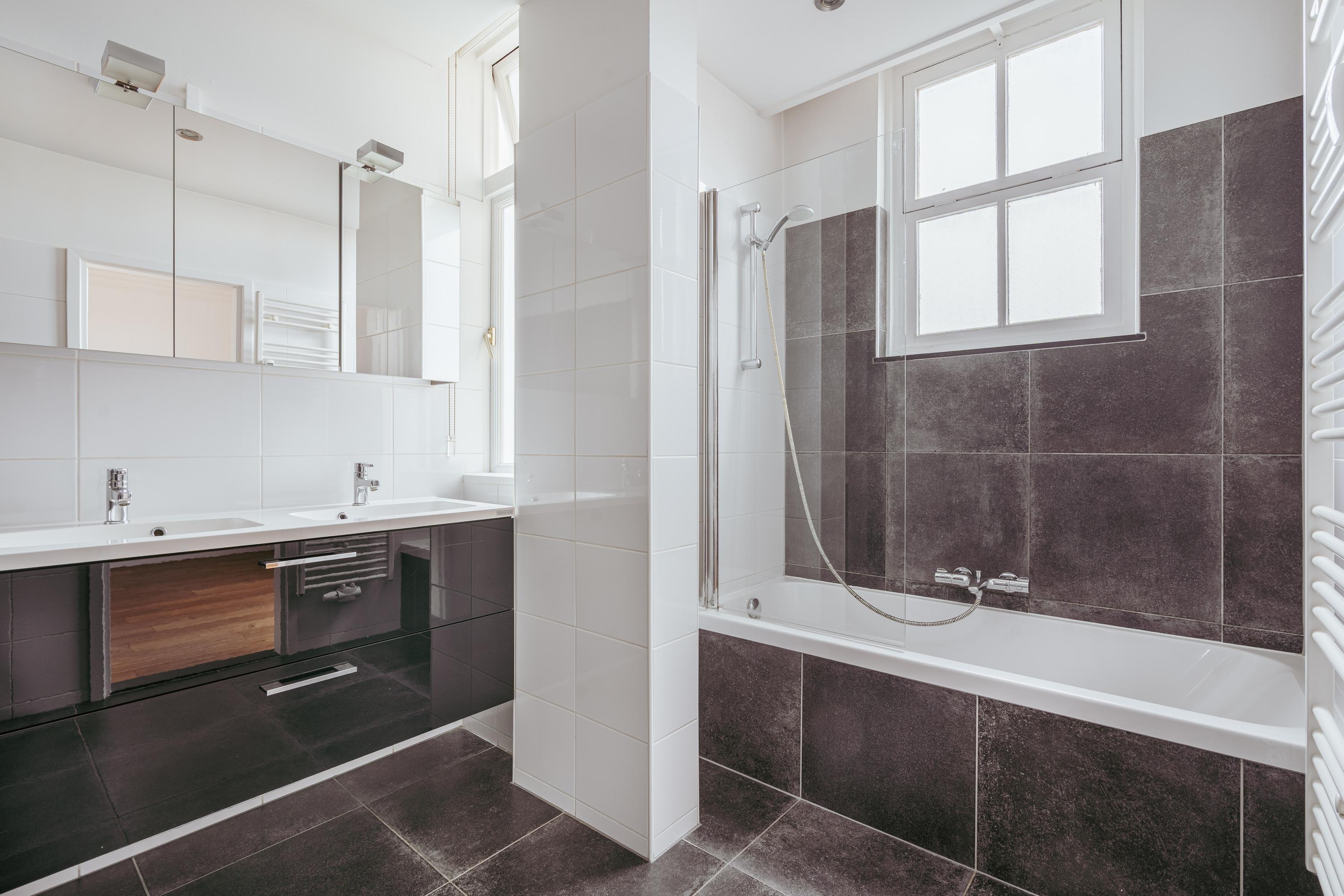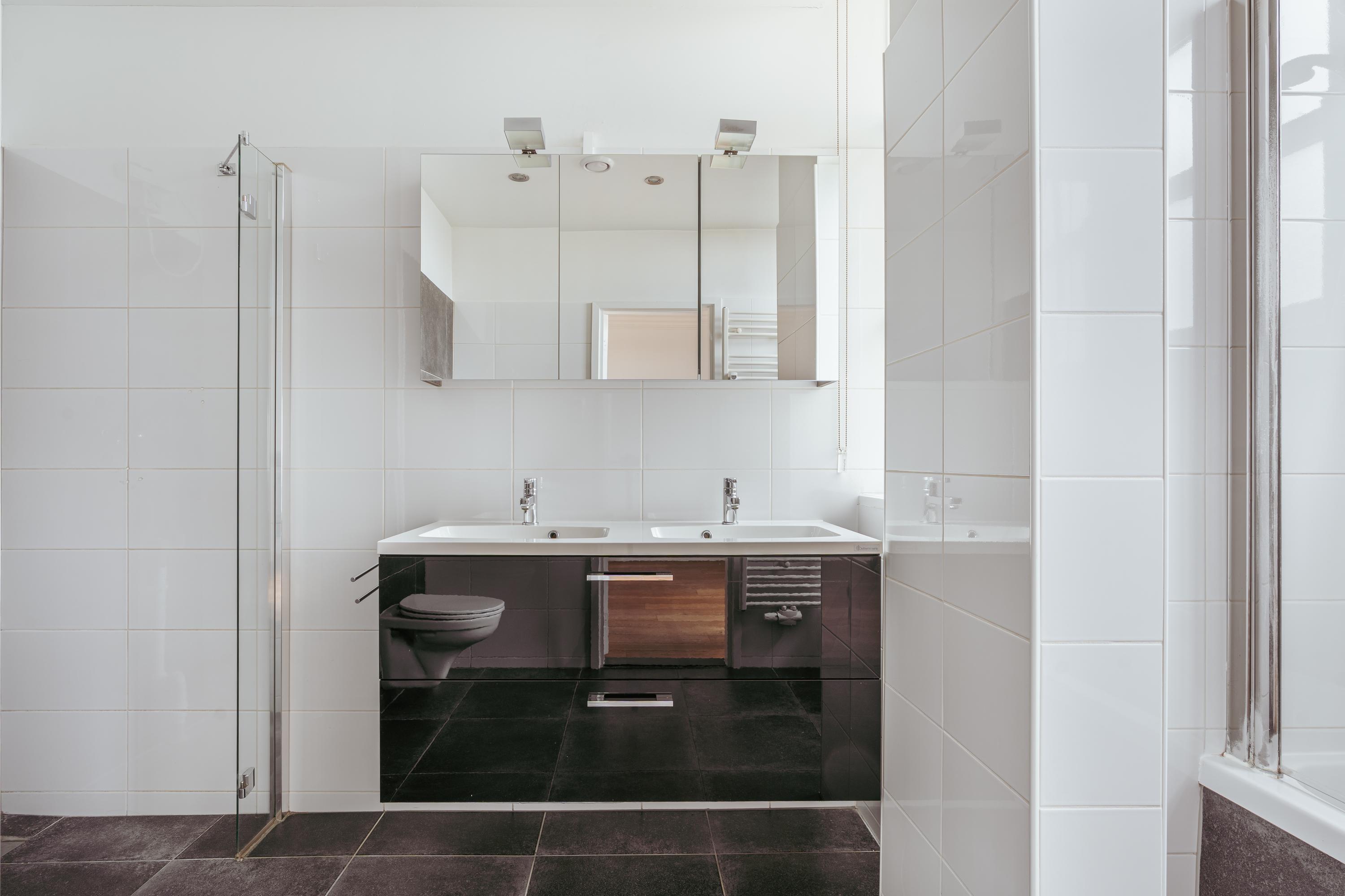 Centraal in de woning bevindt zich een tweede badkamer met toilet, wastafel en douche, bereikbaar vanuit de hal. Ook is er extra bergruimte aanwezig in de vorm van twee ingebouwde kasten naast de meterkast.