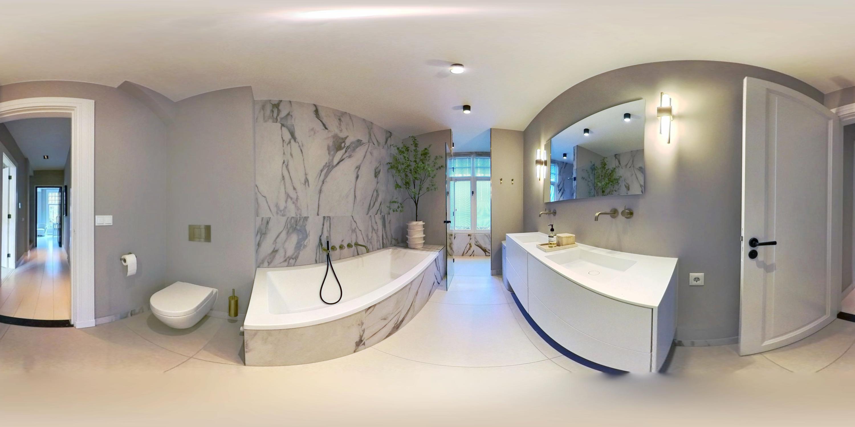 De tweede verdieping biedt wederom een ruime overloop, twee grote slaapkamers en badkamer. Beide kamers zijn voorzien van airconditioning en inbouwkasten, waardoor er volop opbergruimte is. De slaapkamer aan de achterzijde beschikt daarnaast over openslaande deuren naar het tweede balkon. De badkamer op deze verdieping is wederom stijlvol afgewerkt en voorzien van een inloopdouche, wastafel met meubel en toilet.