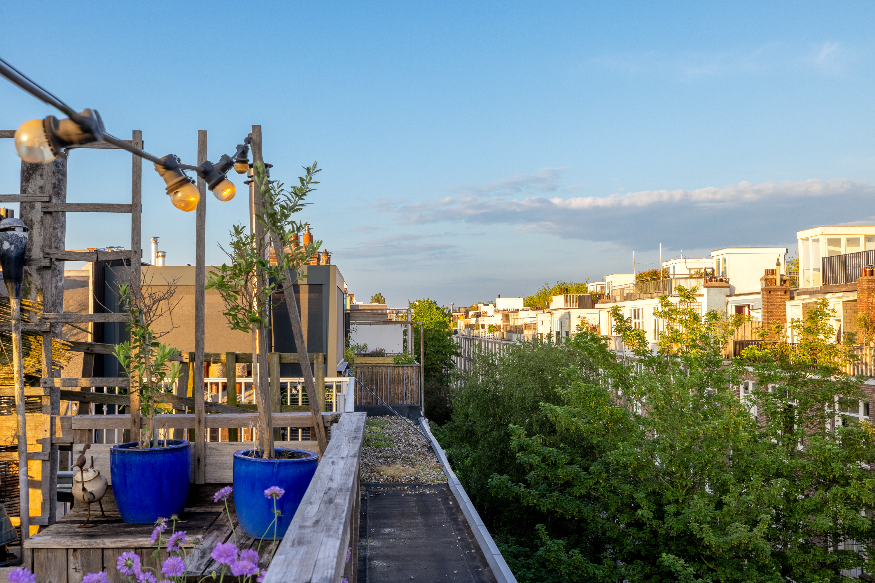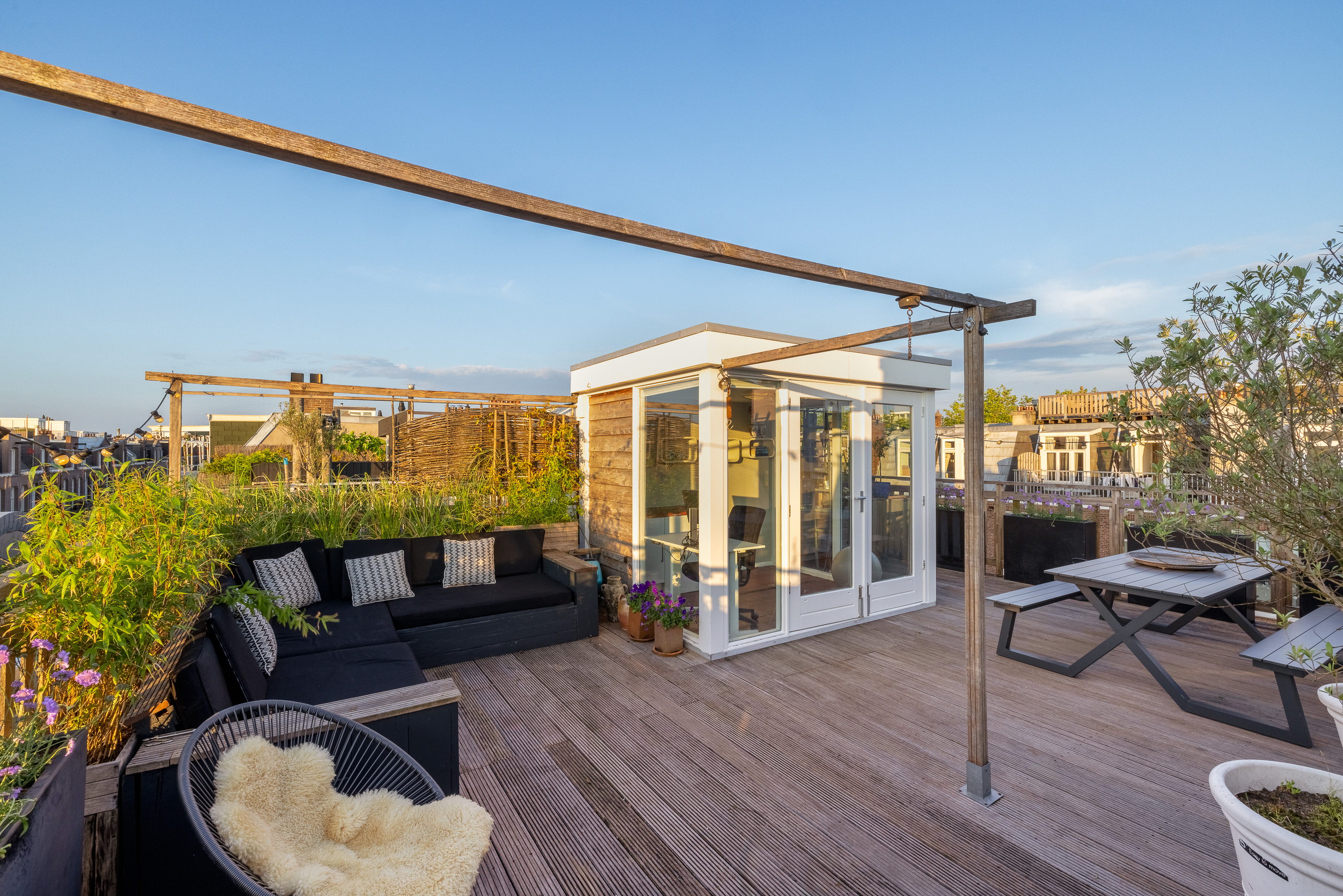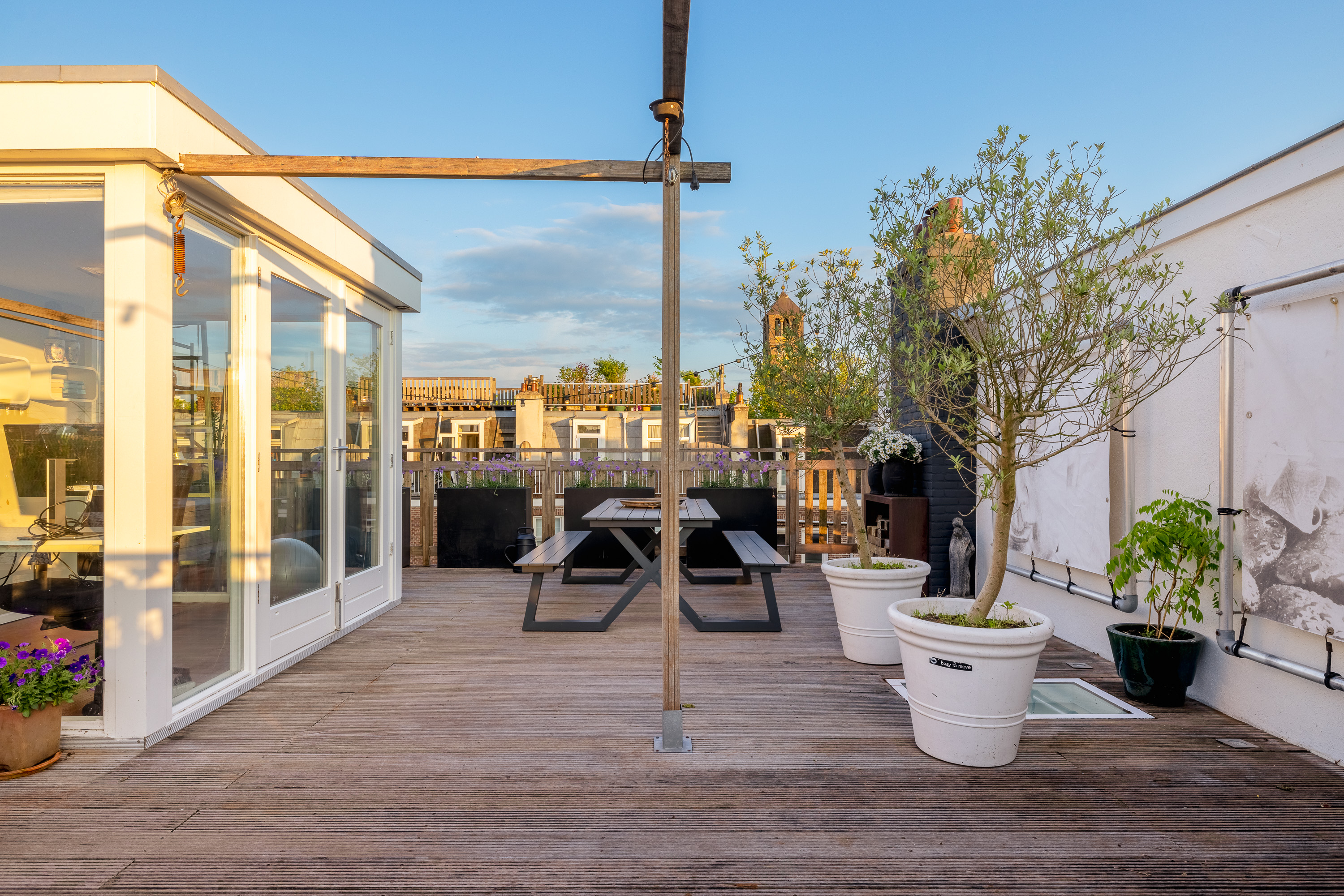 Hier krijgt u toegang tot het zeer ruime, gezellige en fraai afgewerkte dakterras. Op deze verdieping heeft u ook een wastafel en koeling tot uw beschikking. Handig is ook dat de toegang naar het dakhuis kan worden afgesloten, waardoor een fijne ruimte ontstaat van circa 6m². Kortom, genoeg ruimte voor het creëren van een home gym, bijvoorbeeld voor het beoefenen van yoga, of een heerlijke thuiswerkplek.