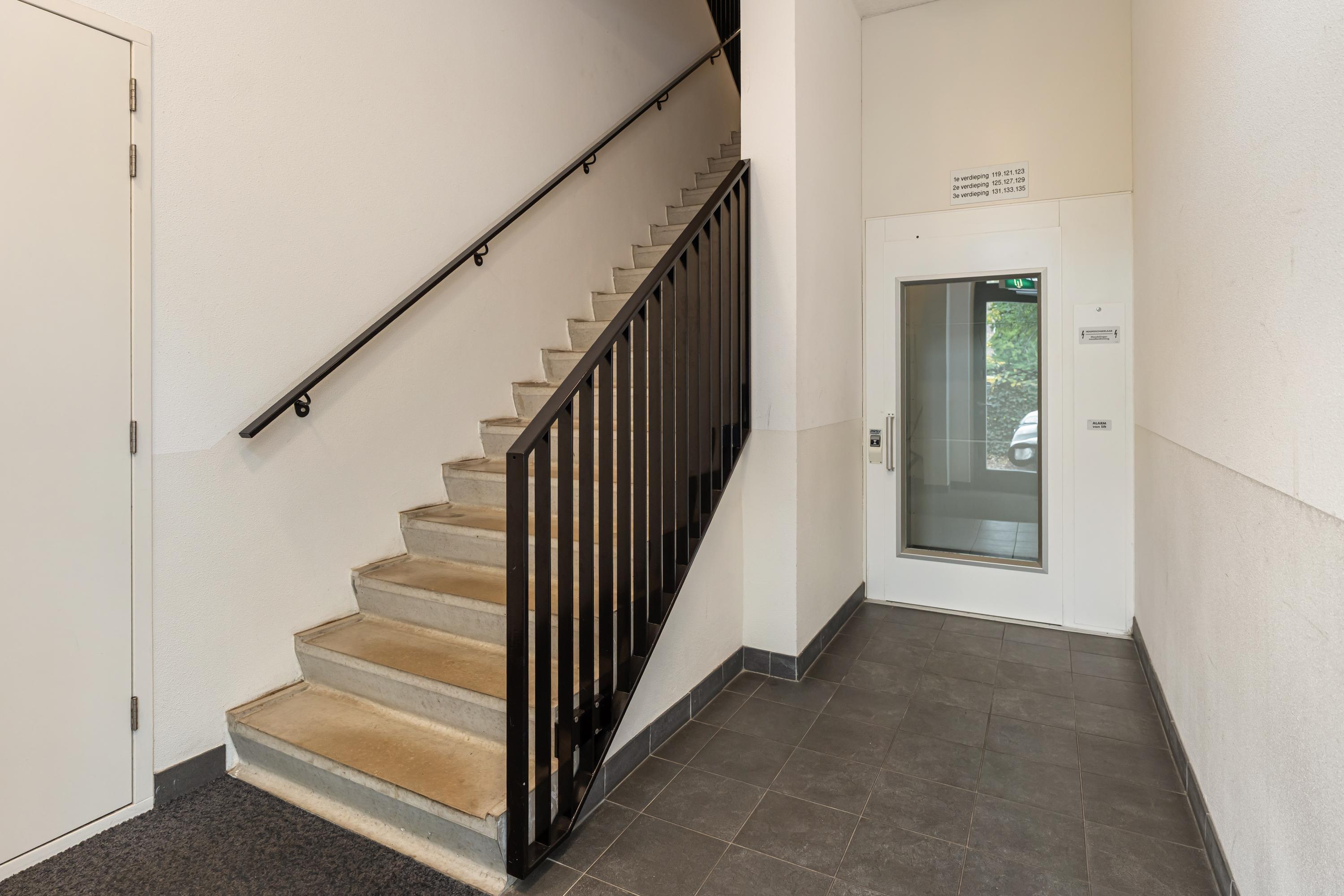 Via het goed onderhouden gemeenschappelijke trappenhuis met lift bereikt u de entree van het appartement. De ruime hal biedt toegang tot alle vertrekken en beschikt over een berging met wasmachine- en drogeraansluiting, evenals een separaat toilet met fontein.
