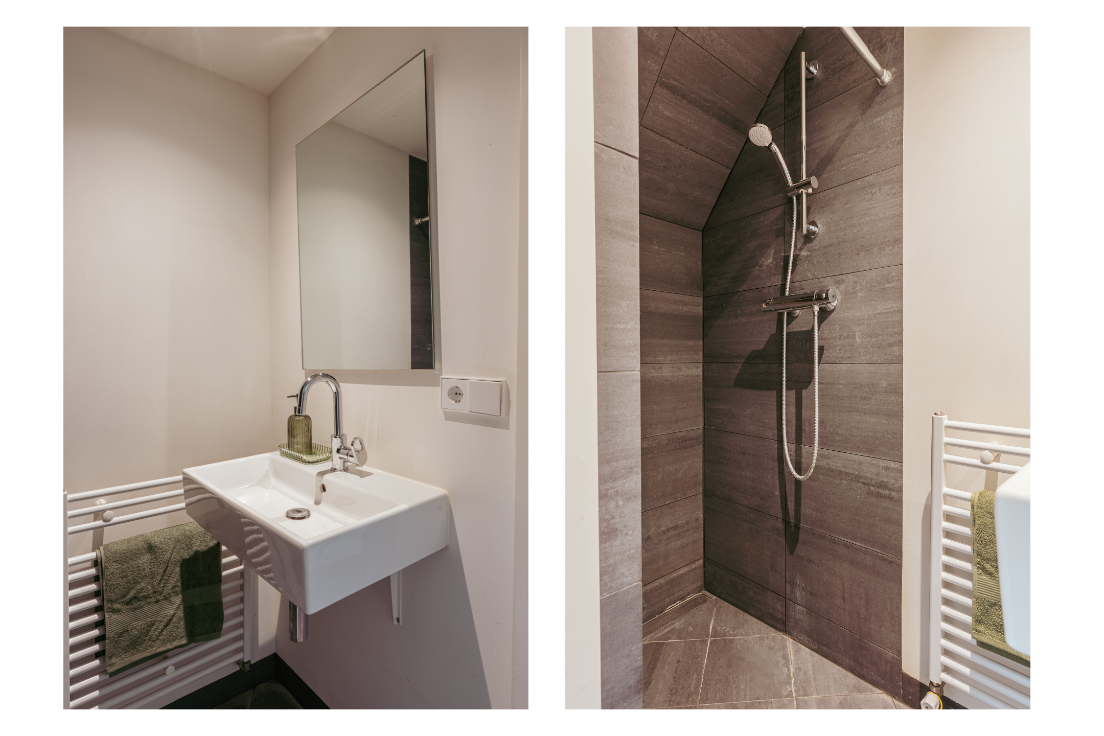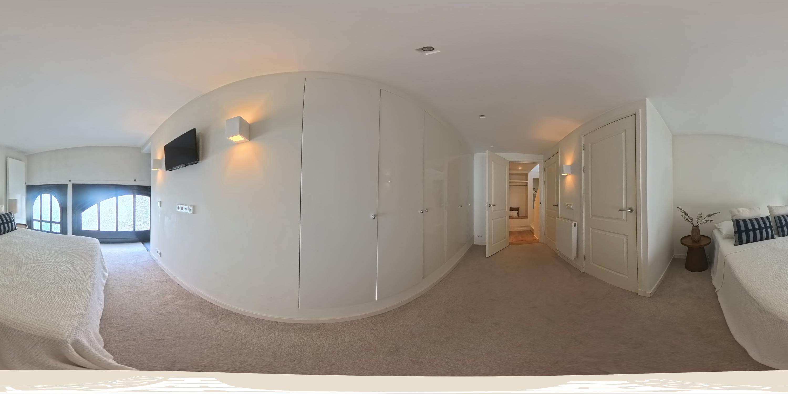 Via de open trap in de woonkamer loopt u naar de eerste verdieping, die eveneens een eigen entree heeft via het gemeenschappelijke trappenhuis. De ruime hal biedt voldoende plek voor een garderobe en extra kastruimte. Hier bevindt zich ook de eerste badkamer, uitgerust met een inloopdouche, wastafelmeubel en een separaat toilet met fontein. Aan de voorzijde ligt de royale master bedroom, voorzien van inbouwkasten, grote ramen en een en-suite badkamer met inloopdouche, wastafel en toilet. Aan de achterzijde bevindt zich de derde, goed bemeten slaapkamer met op maat gemaakte kasten en openslaande deuren naar het tweede balkon. Aangrenzend vindt u de wasruimte met gootsteen, die eveneens toegang biedt tot het balkon.