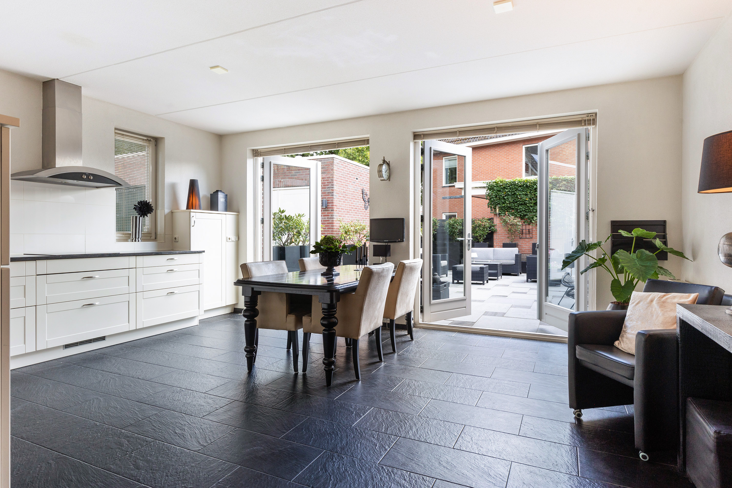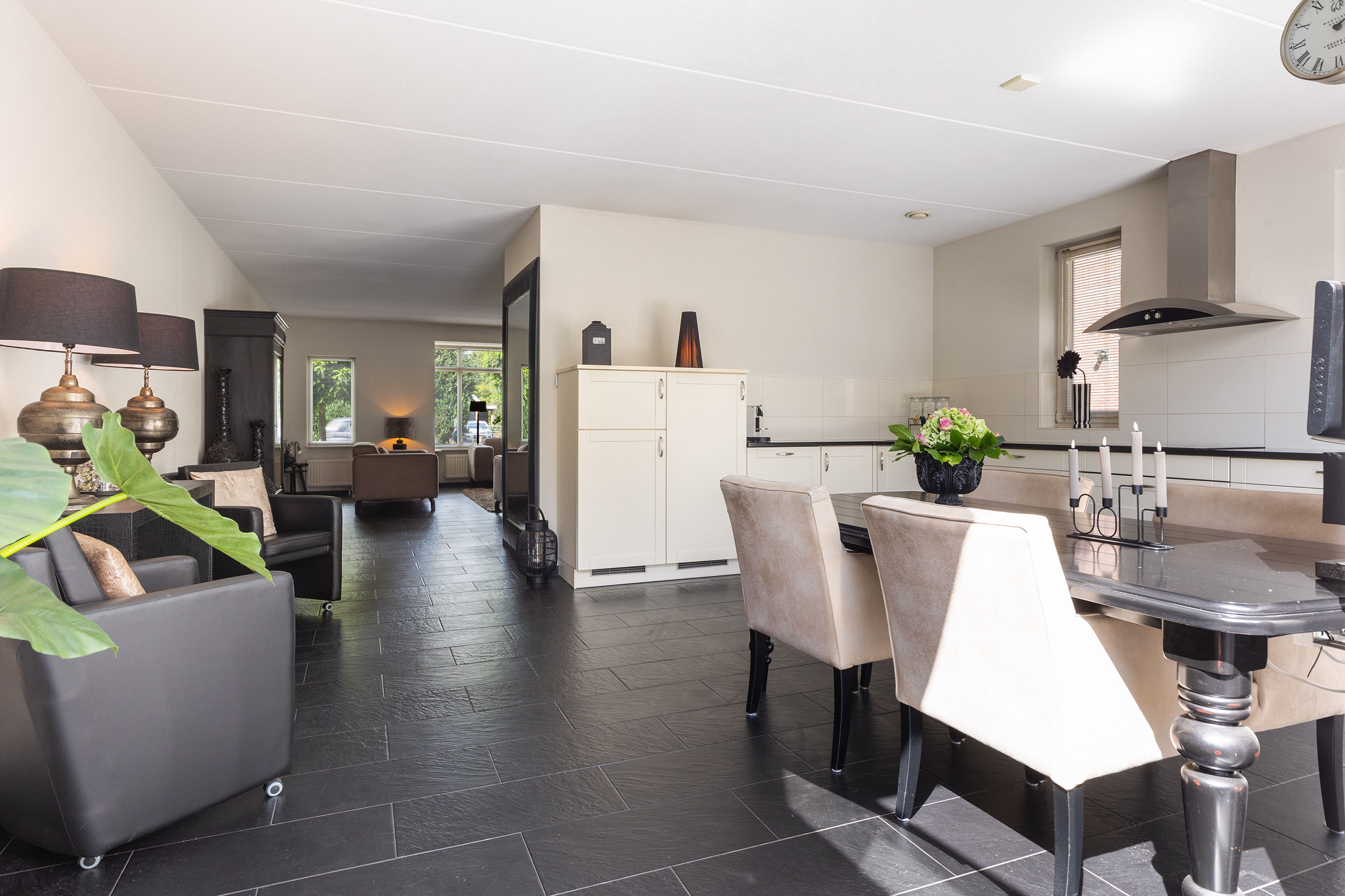 De lichte woonkamer met karakteristieke erker en stijlvolle gashaard vormt het hart van het huis. Dankzij de royale opzet en de vele raampartijen is dit een aangename plek om samen te zijn. Vanuit de woonkamer loopt u door naar de ruime woonkeuken (ca. 26 m²), waar plaats is voor een grote eettafel. De keuken is voorzien van diverse inbouwapparatuur en heeft openslaande deuren naar de tuin – ideaal om binnen en buiten naadloos met elkaar te verbinden.