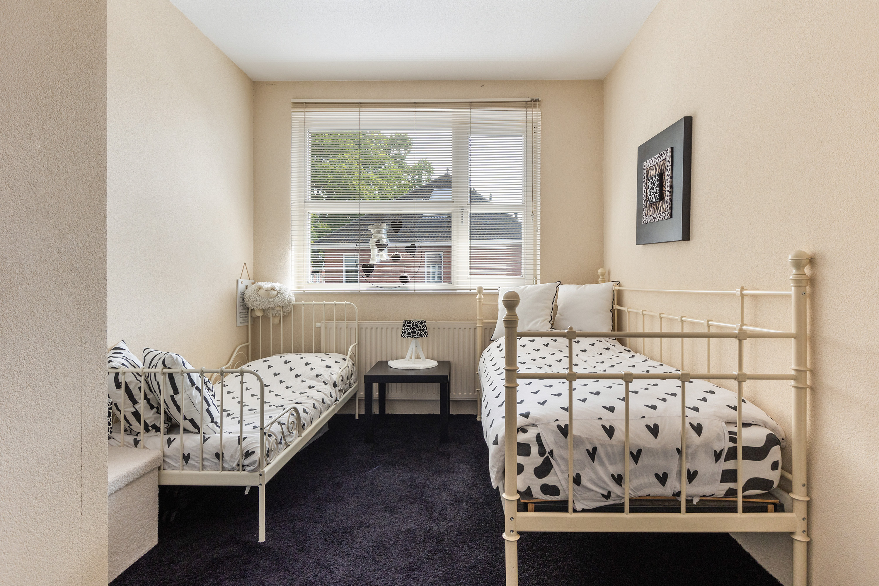 De overloop, voorzien van een zijraam, geeft toegang tot drie slaapkamers en de badkamer. De ouderslaapkamer aan de voorzijde is royaal bemeten en biedt ruimte aan een tweepersoonsbed én een grote garderobekast. Ook de tweede slaapkamer bevindt zich aan de voorzijde en is momenteel in gebruik als kantoor, maar kan eenvoudig weer dienstdoen als slaapkamer. De derde slaapkamer aan de achterzijde kijkt uit op de tuin.