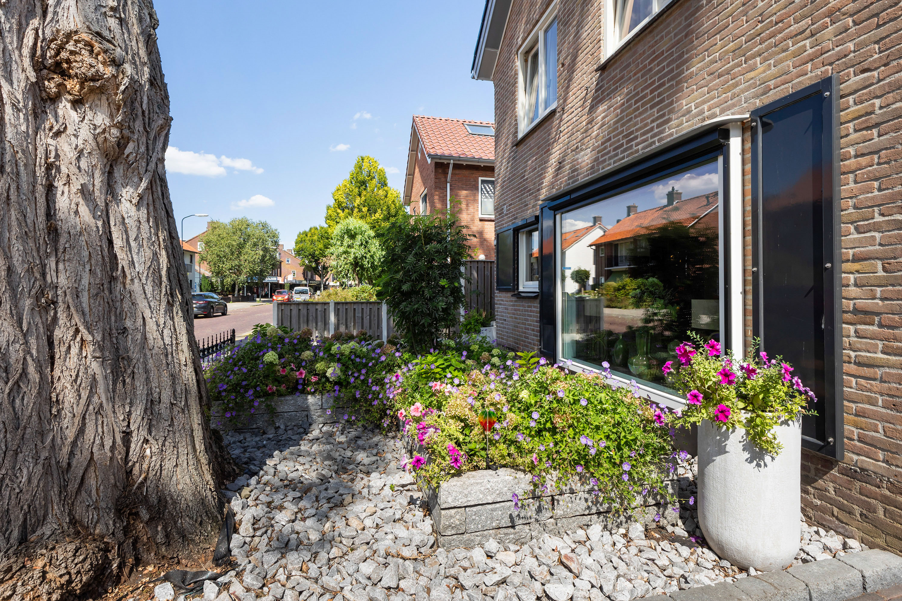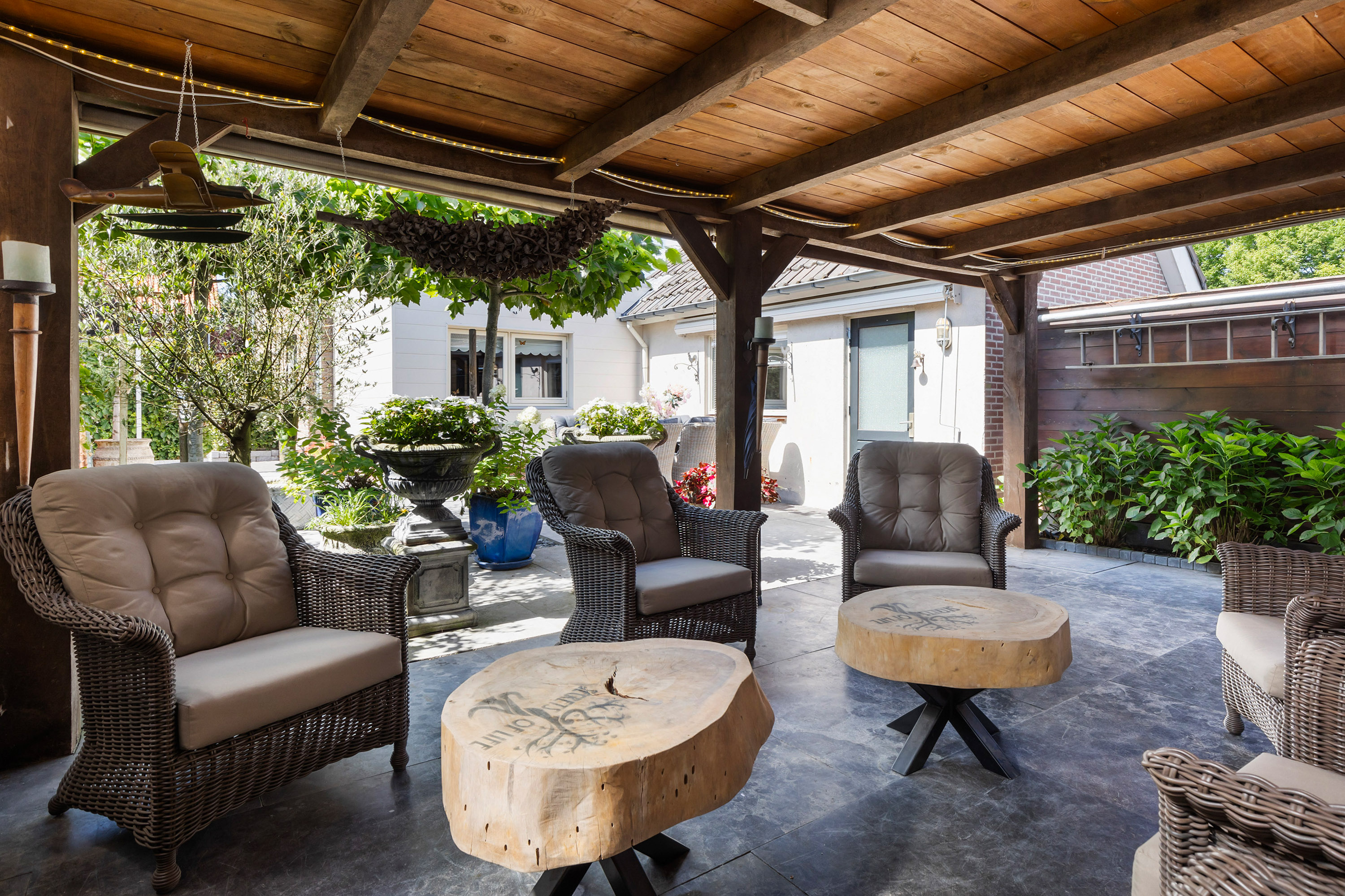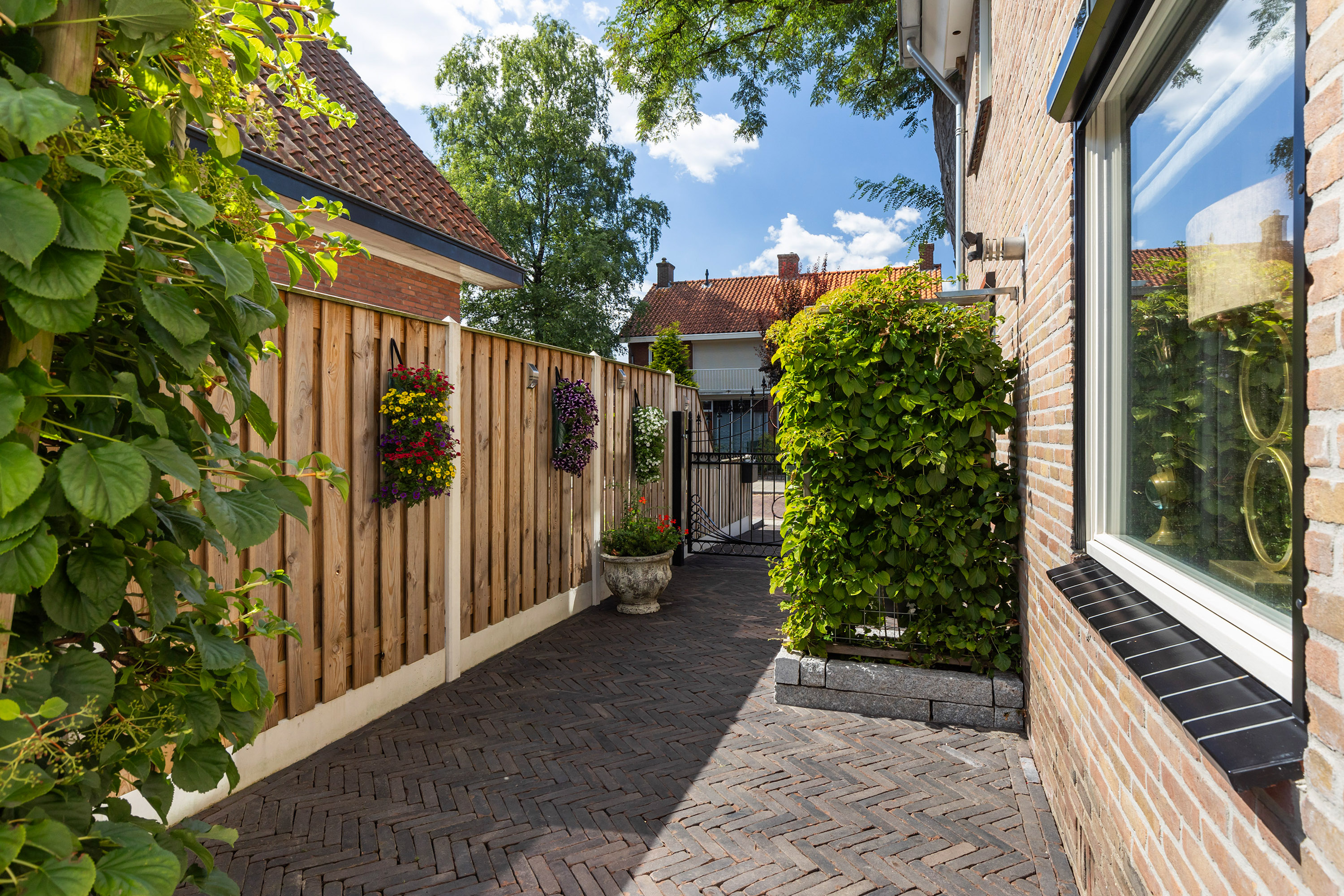 De buitenruimte is minstens zo aantrekkelijk. De fraai aangelegde tuin beschikt over terrassen van blauw hardsteen, granieten plantenbakken en diverse zitplekken. Aan de achterzijde staat een houten schuur met bergvliering met daarvoor een exclusieve veranda vervaardigd uit een robuust eikenhouten constructie en een met EPDM afgewerkt dak: een heerlijke plek om te genieten van het buitenleven en gezelligheid. De erfafscheidingen zijn recent vernieuwd in samenwerking met de buren en bestaan uit schuttingen met betonpalen en hout. Aan de voorzijde siert een acaciaboom de tuin, terwijl een smeedijzeren hekwerk met afsluitbare poort zorgt voor een stijlvolle entree. De royale oprit met klinkerbestrating en carport biedt plaats aan meerdere auto’s.