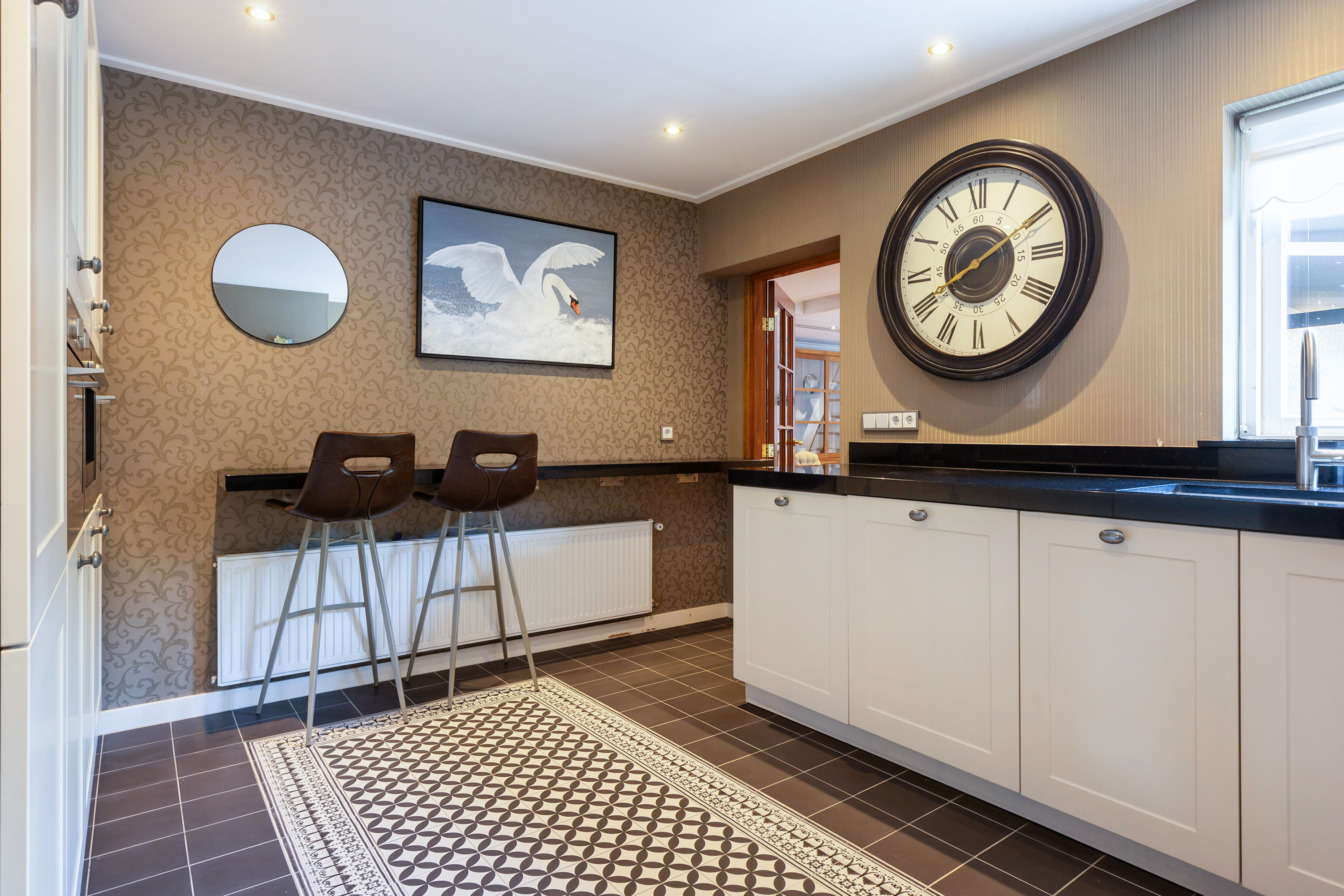 De keuken is een ware blikvanger: een luxe landelijke opstelling met granieten werkblad, een sfeervolle Portugese tegelvloer met elektrische vloerverwarming en hoogwaardige inbouwapparatuur: een combi-stoomoven, combimagnetron, vaatwasser, grote koelkast en een inbouw-koffiezetapparaat. Het 90 cm brede en luxe 5 pits gasfornuis heeft een ingebouwde oven. Hierboven is in de schouw een afzuigunit ingebouwd. De vele kasten en de hoekkast met een dubbel uitzwenkplateau geven handige bergruimte. Tevens is er een granieten eetbar aanwezig waar u gezellig kunt zitten, of kunt genieten van een maaltijd of drankje. Via de keuken is er directe verbinding naar zowel de woonkamer als de achtergelegen tuinkamer.