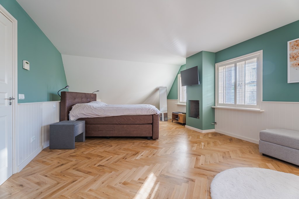 De slaapkamers alsmede de overloop zijn voorzien van dezelfde in visgraat gelegde parketvloer.