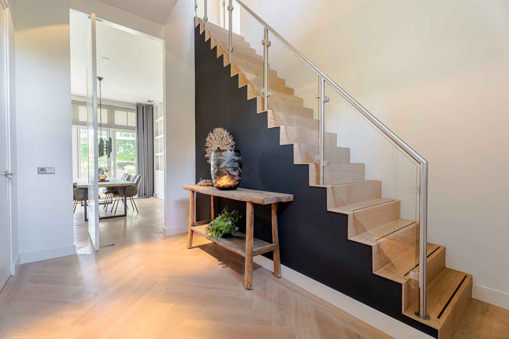 Middels de keurig aangelegde voortuin bereikt u de statige entree van de woning. Bij binnenkomst is direct duidelijk dat er goed is nagedacht over de zichtlijnen in en rond de woning. De hal is voorzien van een meterkast, een toiletruimte, een vestiaire, een trapopgang voor toegang tot de verdieping en biedt toegang tot de woonvertrekken.