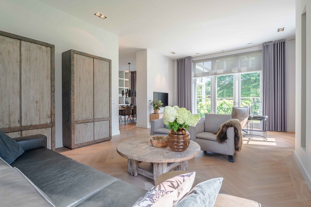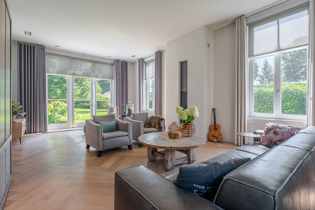 De zitkamer is voorzien van een parketvloer, een ingebouwde gashaard, inbouwverlichting en een tuindeur. Door de grote raampartijen aan zowel de voor, zij-als achterzijde is er veel natuurlijke lichtinval en heeft u een heerlijk uitzicht op de tuin.