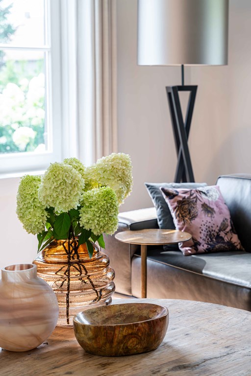 De begane grond is gecompartimenteerd in drie leefruimtes die doormiddel van een openverbinding een geheel vormt. Wat meteen opvalt is de hoeveelheid daglichttoetreding. Dit zorgt, in combinatie met de hoge plafonds, voor een aangenaam gevoel.