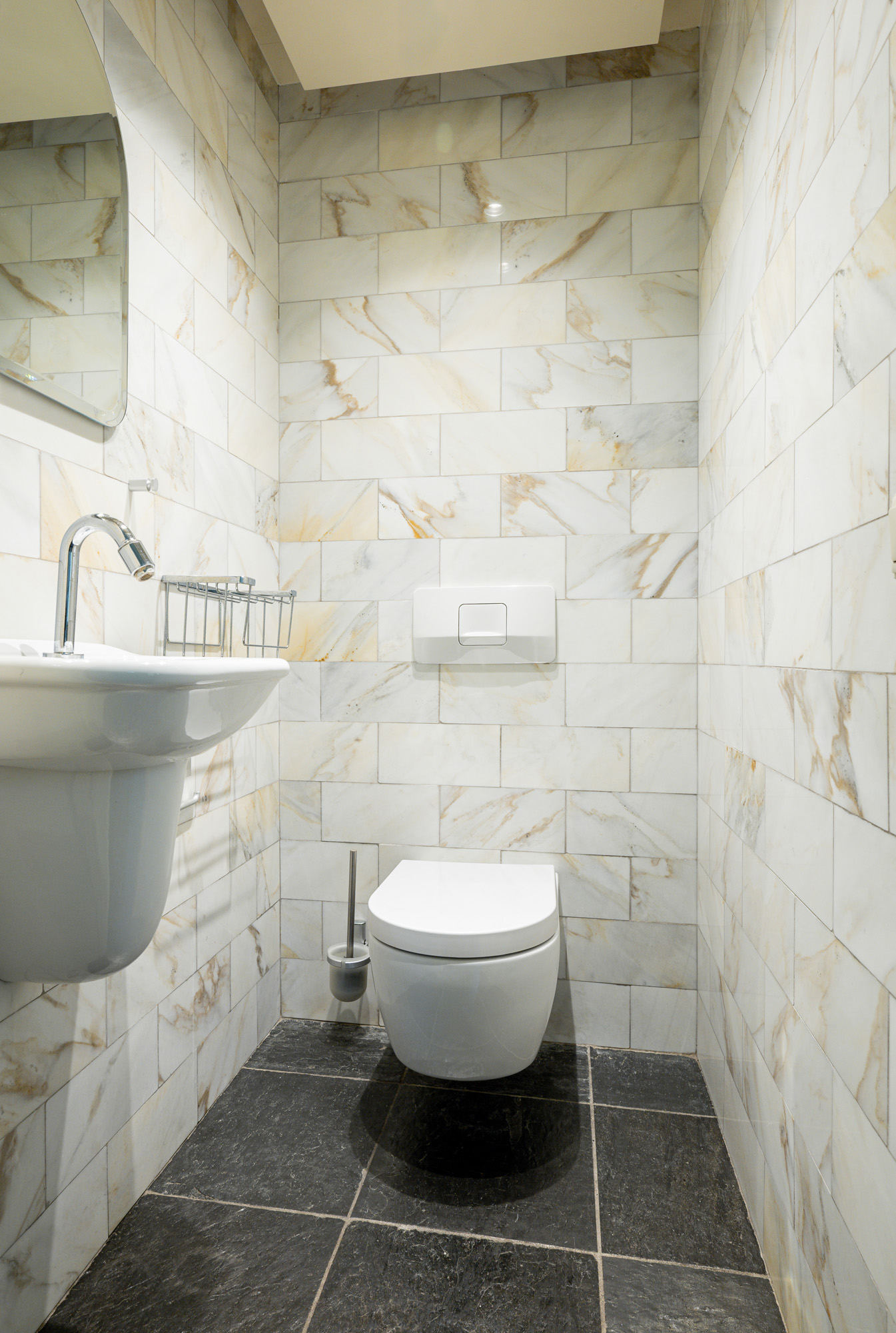 De toiletruimte is stijlvol afgewerkt met natuurstenen betegeling en voorzien van een wandcloset met inbouwreservoir, alsmede een fonteintje.