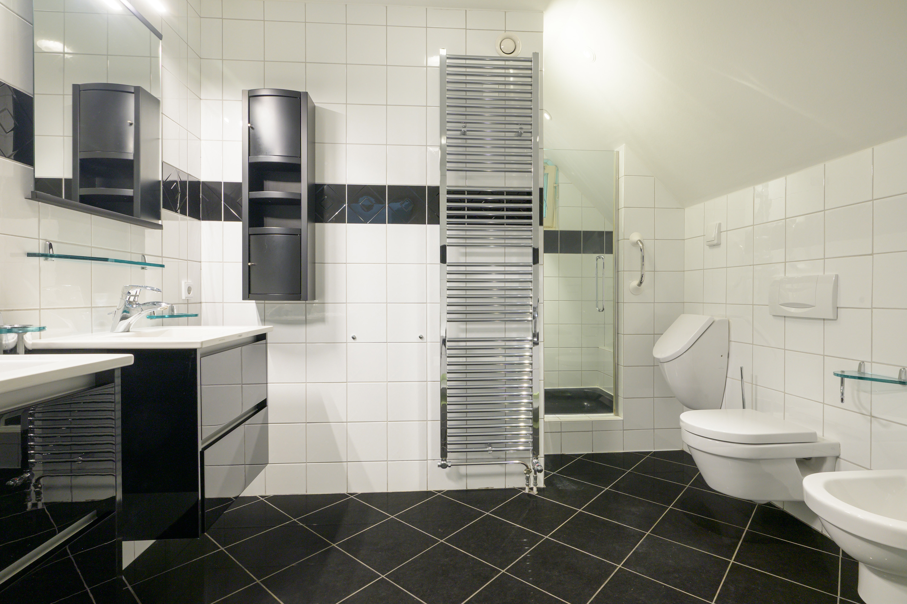 De badkamer is uitgerust met een ligbad, een wandcloset met inbouwreservoir, een urinoir, een bidet, een inloopdouche, een designradiator en een dubbele wastafel, geïntegreerd in een meubel. De badkamer is ook rechtstreeks te betreden vanuit de gang.