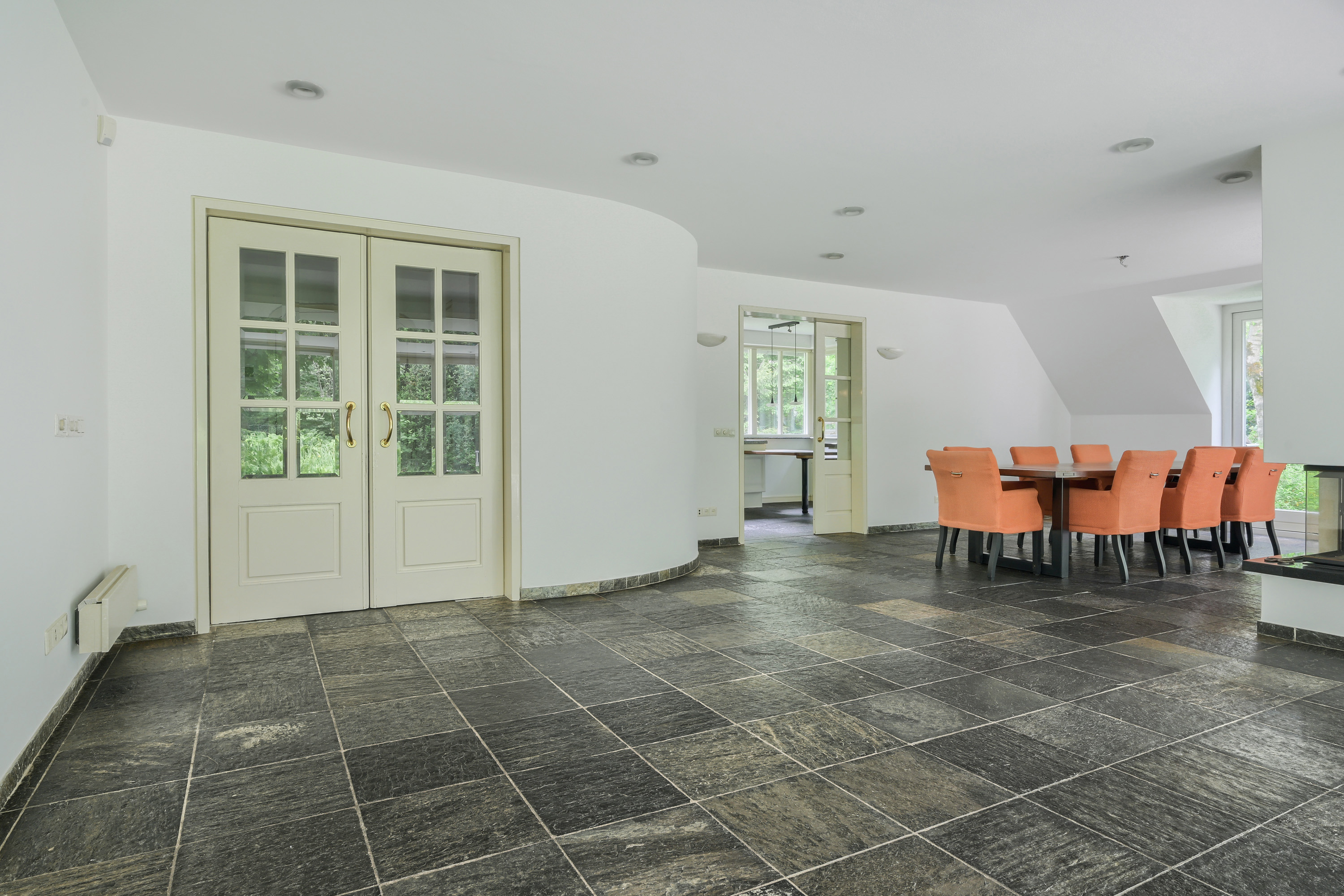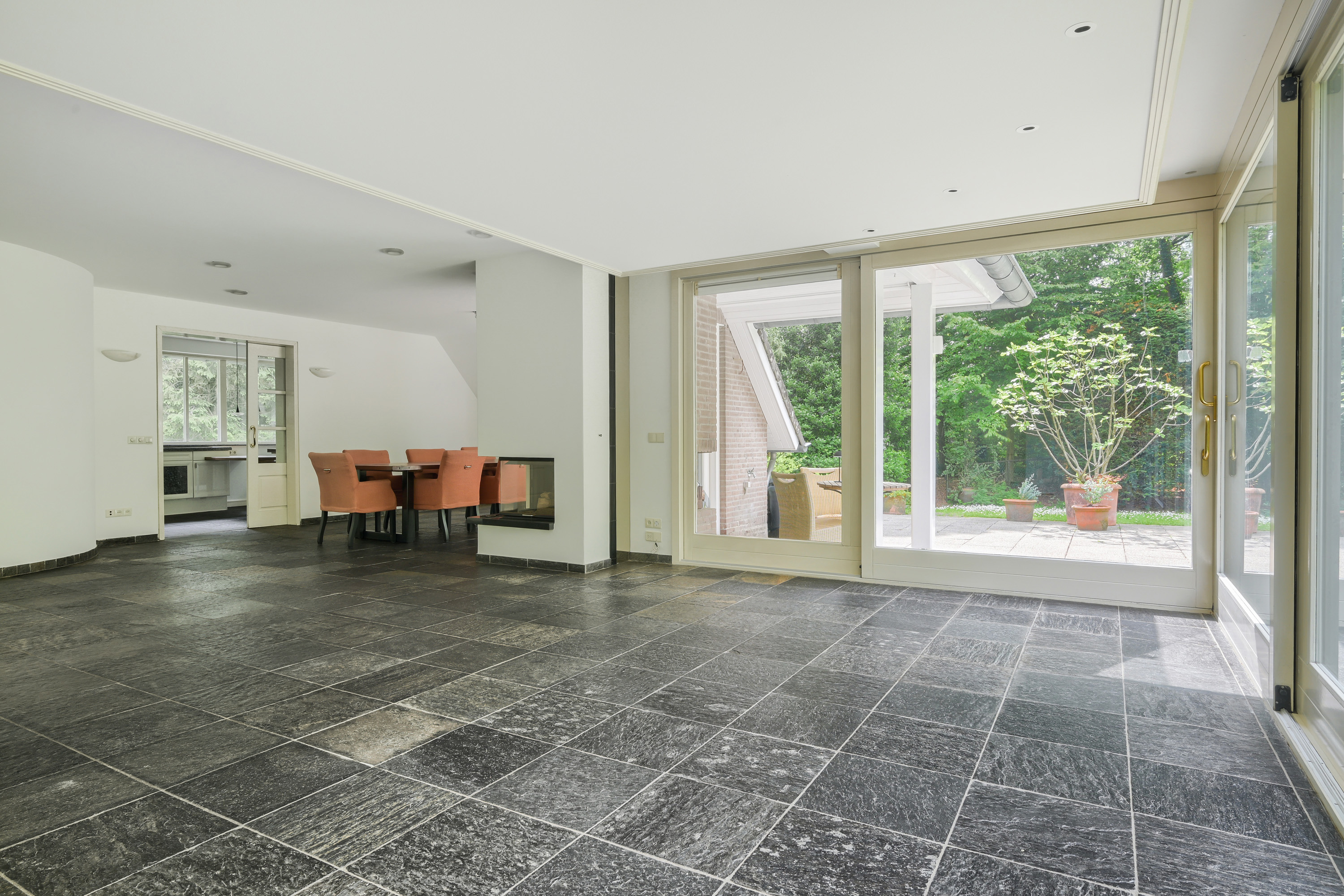 Tussen de zit- en eetkamer is een sfeervolle open haard gesitueerd, welke beide vertrekken op harmonieuze wijze met elkaar verbindt.