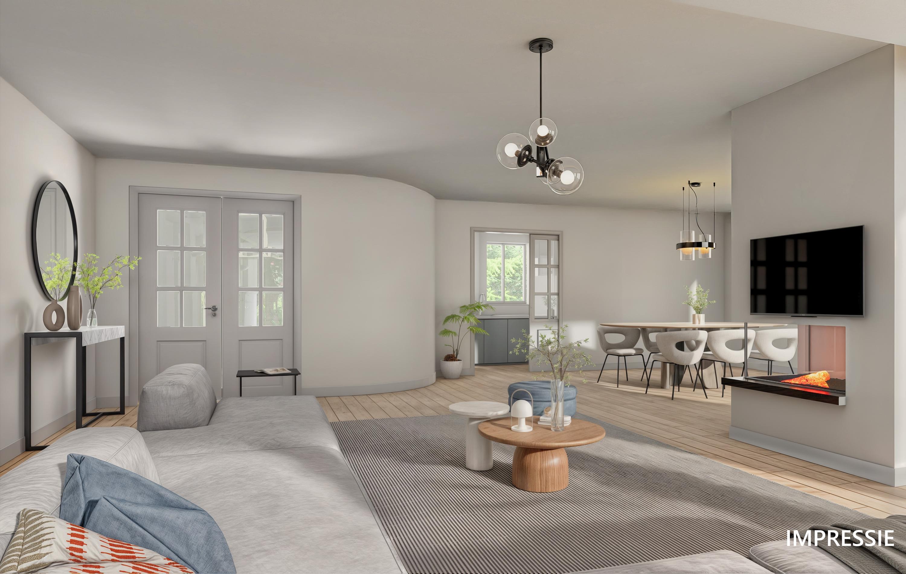 De woonkamer vormt het hart van de woning en is georiënteerd op de achtertuin. De ruimte is onderverdeeld in meerdere compartimenten: