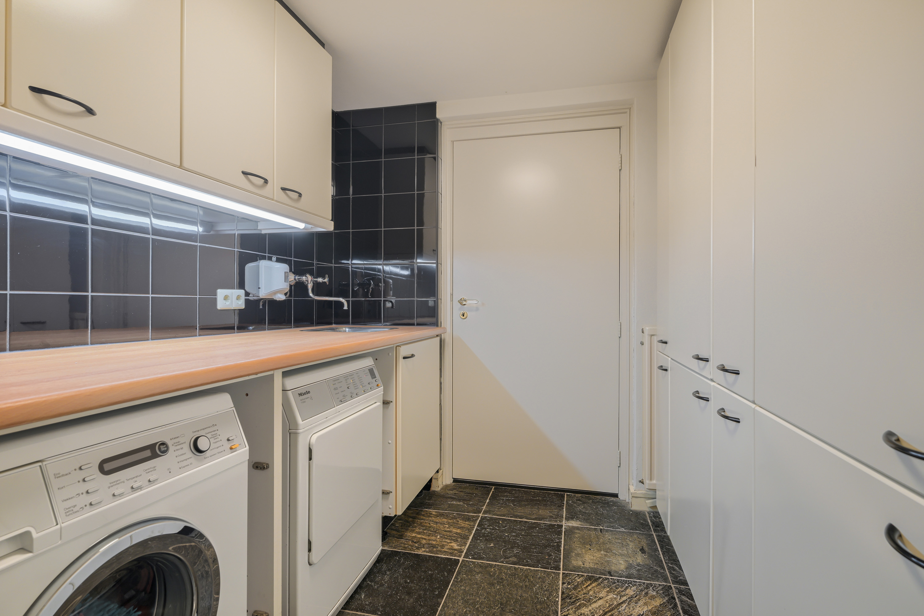 Aan de ene zijde bevindt zich een op maat gemaakt wandmeubel. Aan de andere zijde treft u een werkblad met RVS spoelbak, voorzien van bovenkasten. Tevens zijn hier de aansluitingen voor wasapparatuur gesitueerd.