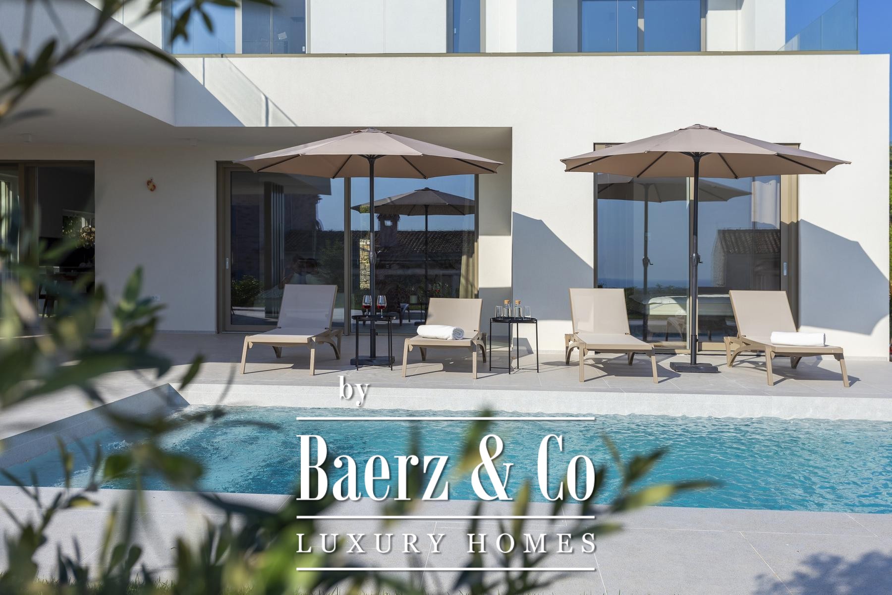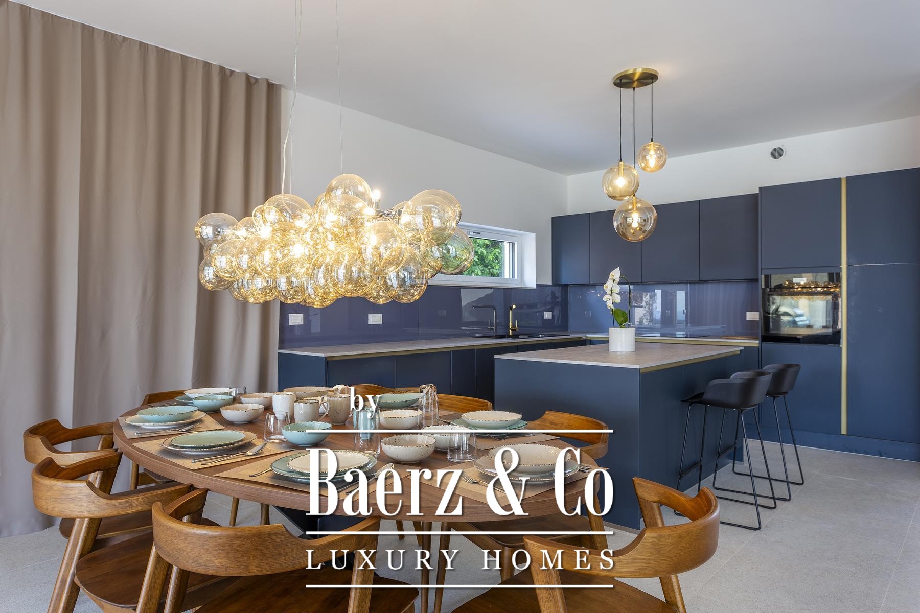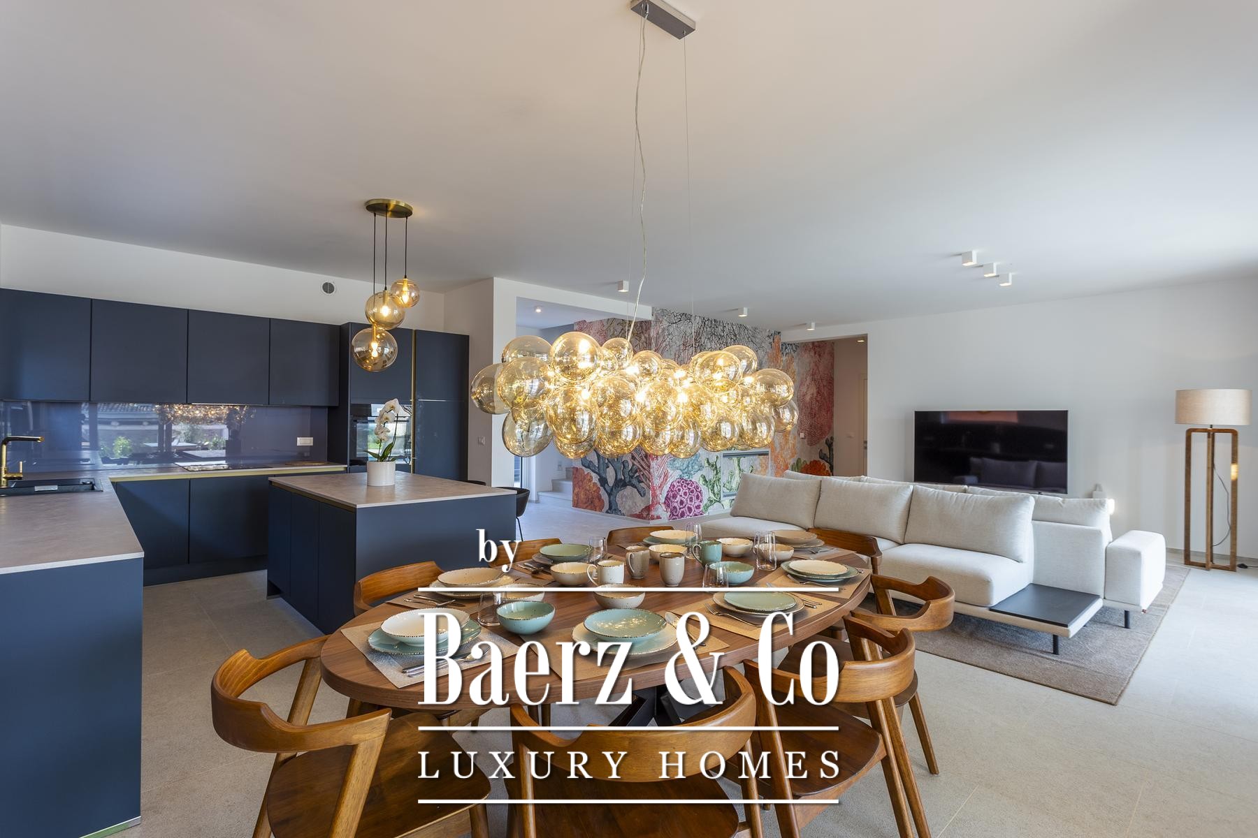 De open living verbindt een eetkamer met een volledig uitgeruste keuken, voorzien van hoogwaardige apparatuur van internationaal erkende merken. Het in opdracht vervaardigde designmeubilair in de lounge biedt optimaal comfort en een direct uitzicht op zee. De kamerhoge beglazing laat overvloedig daglicht binnen en loopt naadloos over in een royale overdekte terrass, ideaal voor het ontvangen van gasten, omgeven door verzorgde tuinen, een zwembad van 30 m² en adembenemend zeezicht. Een buitenbarbecue maakt het buitenleven compleet.