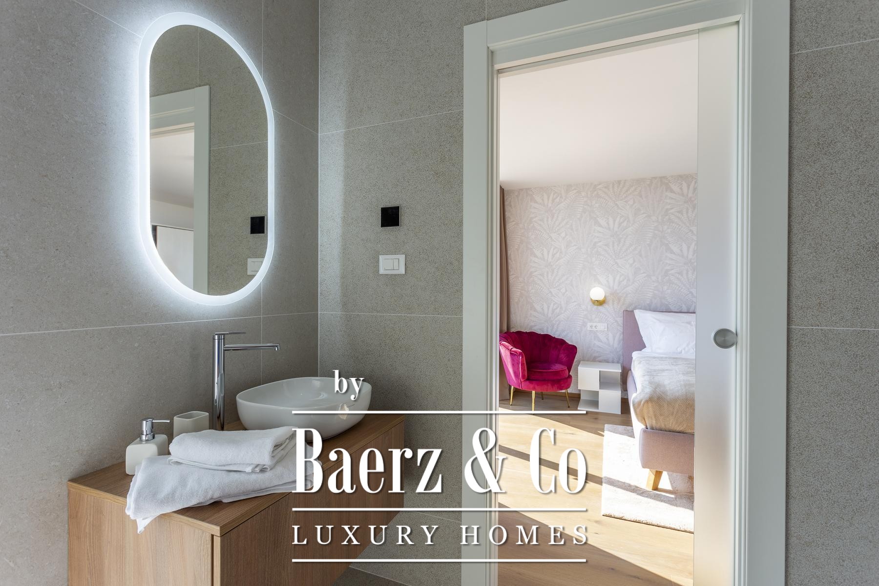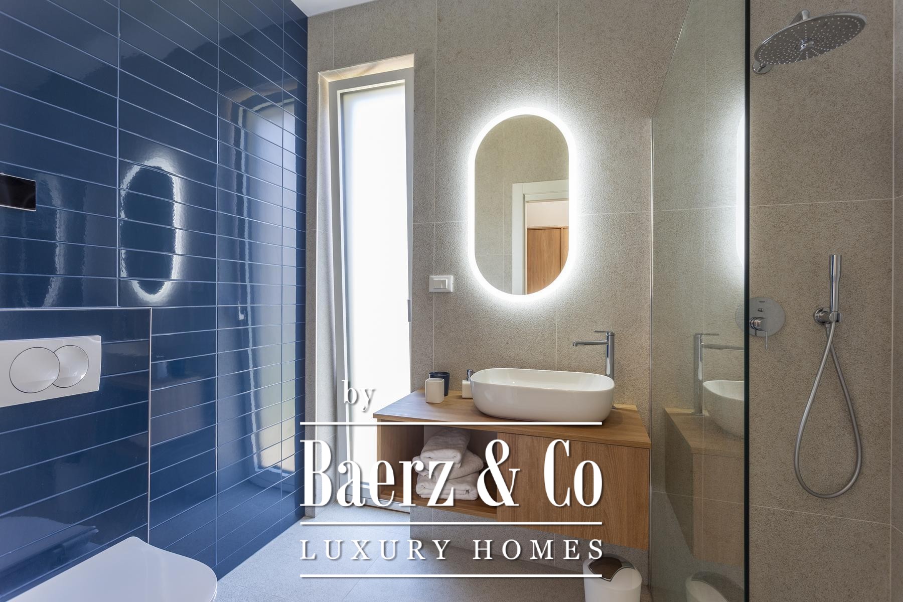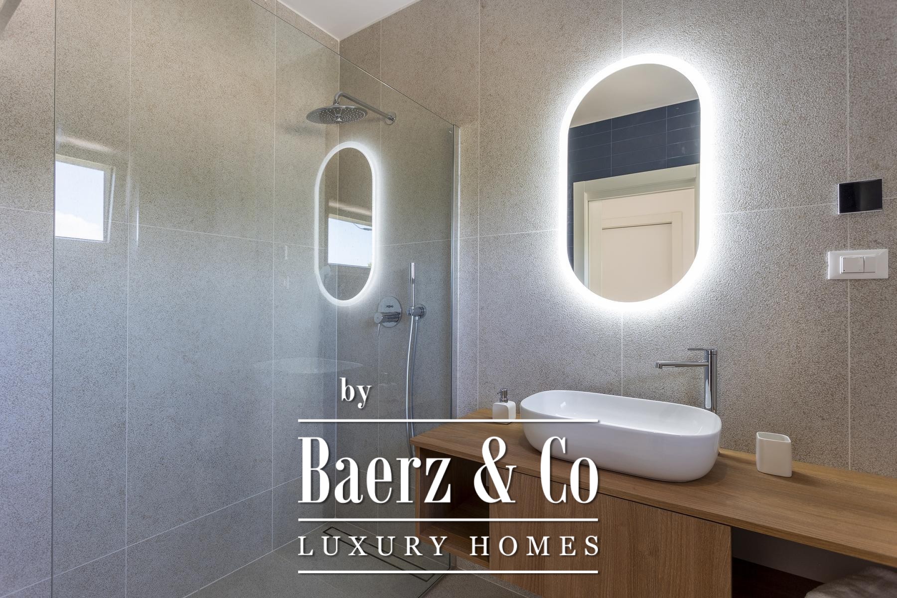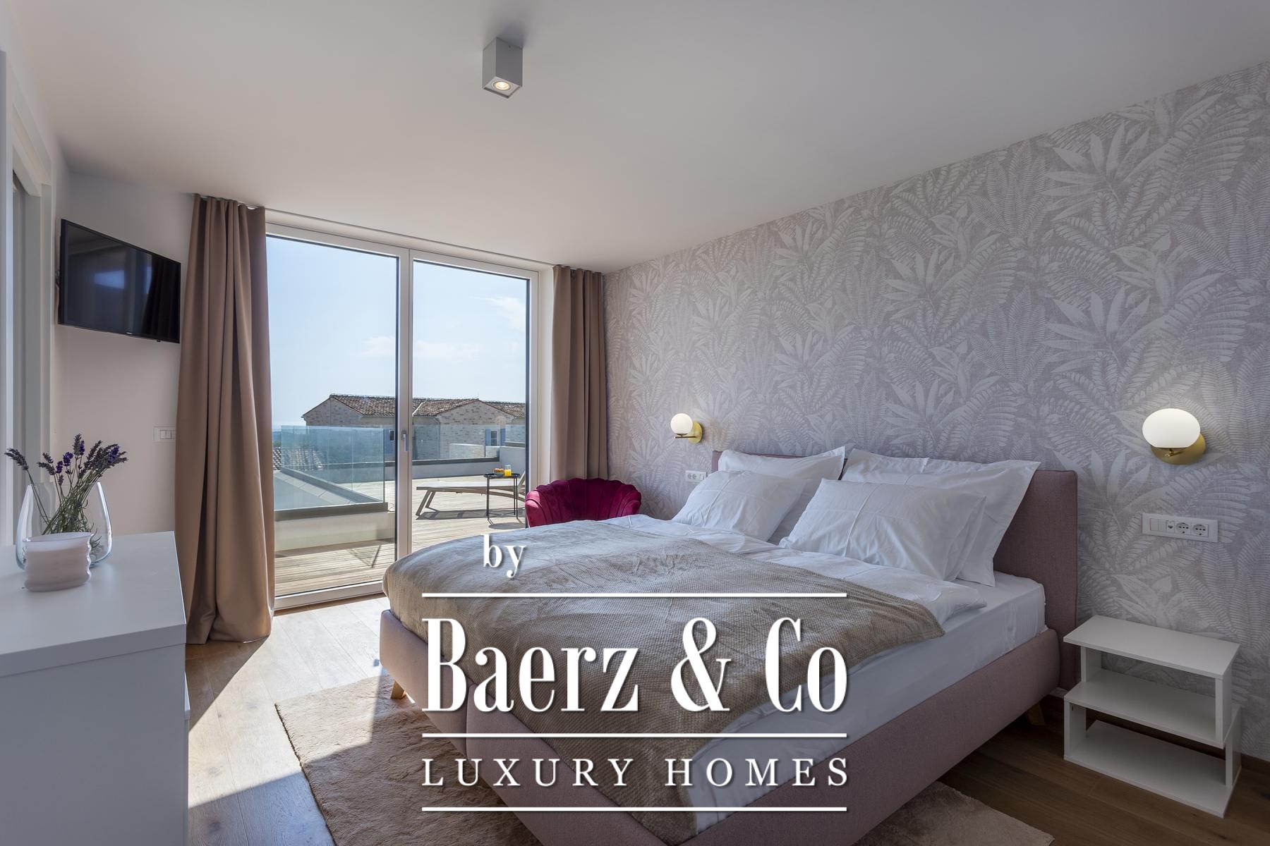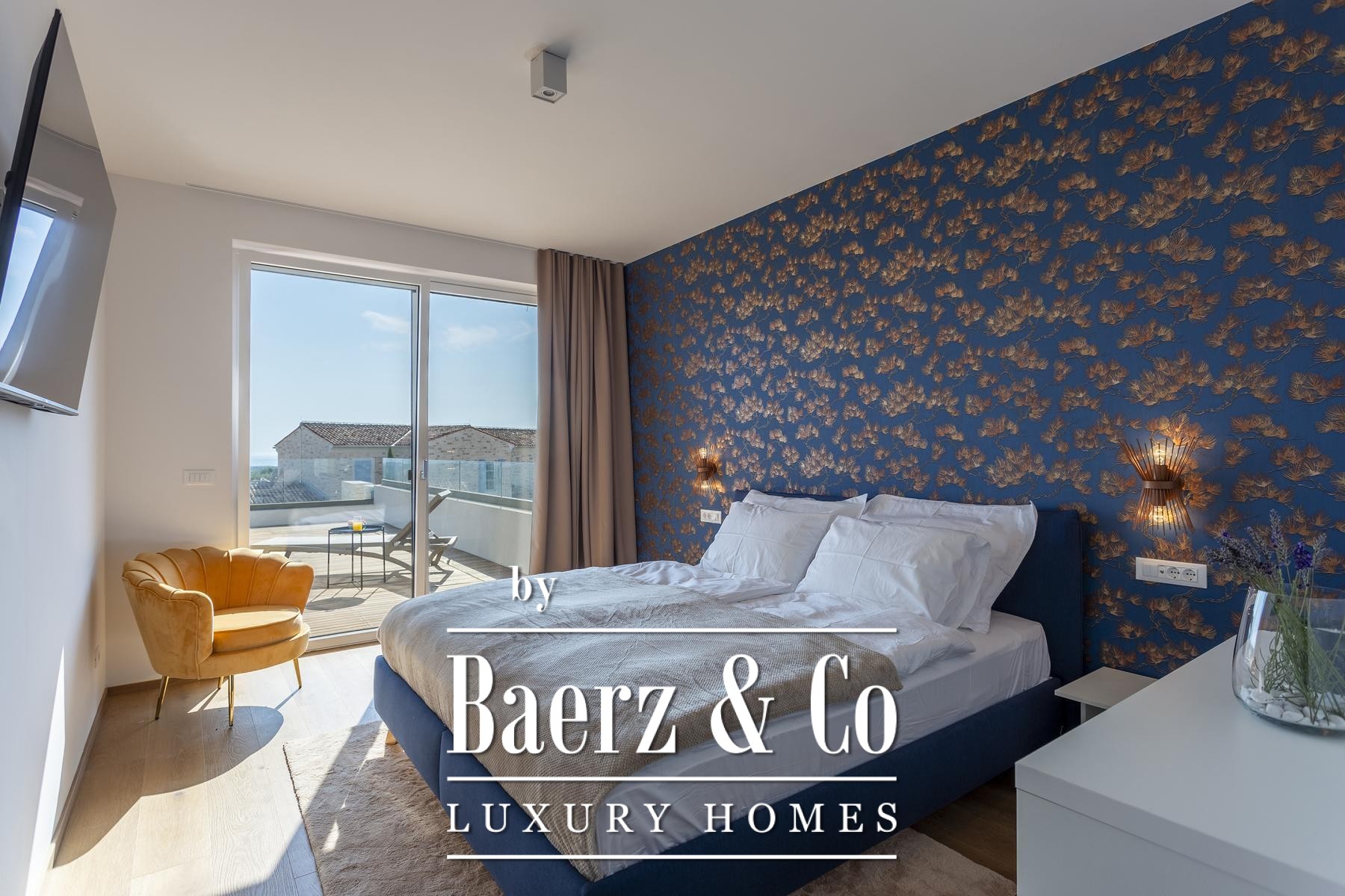 De privévertrekken op de begane grond bestaan uit een slaapkamer met en-suite badkamer, een technische ruimte en een berging. Via de binnentrap bereikt u de eerste verdieping met drie extra slaapkamers, elk met een eigen badkamer en toegang tot een ruim terras met uitzicht op de Adriatische Zee, voorbereid op een toekomstige jacuzzi. Vloerverwarming, hoogwaardig parket en luxe keramiek creëren een hoogwaardige woonomgeving, aangevuld met airconditioning in elke ruimte.