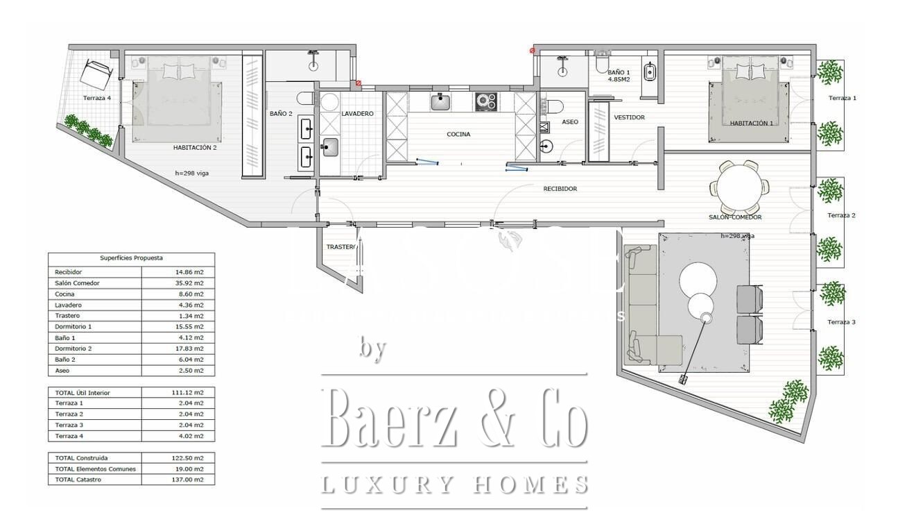 Twee dubbele slaapkamers bieden royale ontspanning, waarbij de principale suite extra allure krijgt door een geïntegreerde galerij die warmte en natuurlijk licht binnenbrengt. Er zijn twee complete badkamers, aangevuld met een gastentoilet; praktische elementen zoals inbouwkasten, een wasruimte en een aparte waskamer zorgen voor extra dagelijks comfort. Het appartement beschikt over een terras en is gemakkelijk bereikbaar per lift.