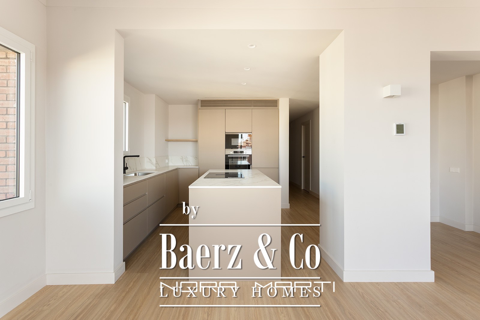 Het interieur omvat een royale woon- en eetkamer met directe toegang tot het terras. De keuken is volledig uitgerust, gecentreerd rond een kookeiland en voorzien van een aparte bijkeuken. Drie slaapkamers vormen het privévertrek: een exterieur suite met ingebouwde kasten, eigen badkamer en toegang tot een galerij van 16 m²; een middelgrote slaapkamer eveneens met toegang tot de galerij; en een eenpersoonskamer, die samen een complete badkamer delen.