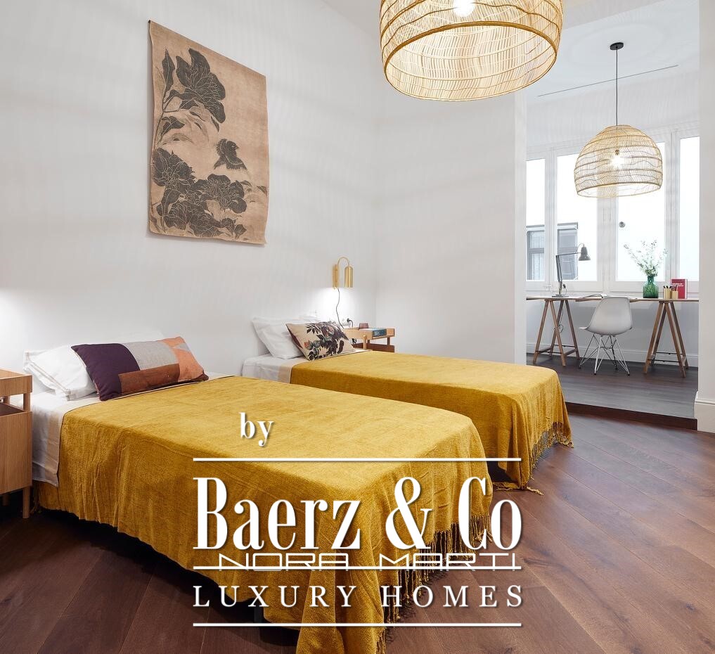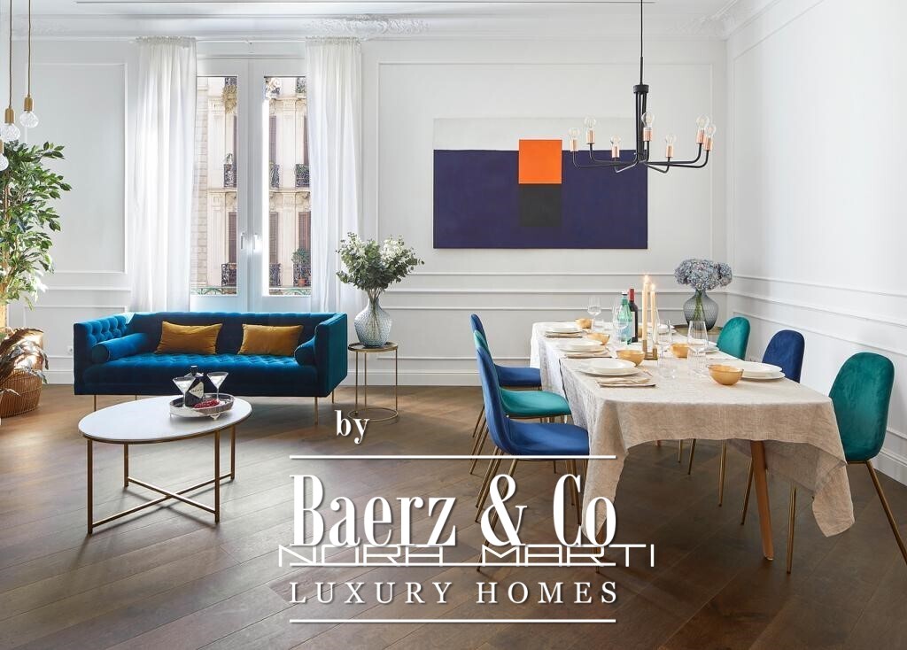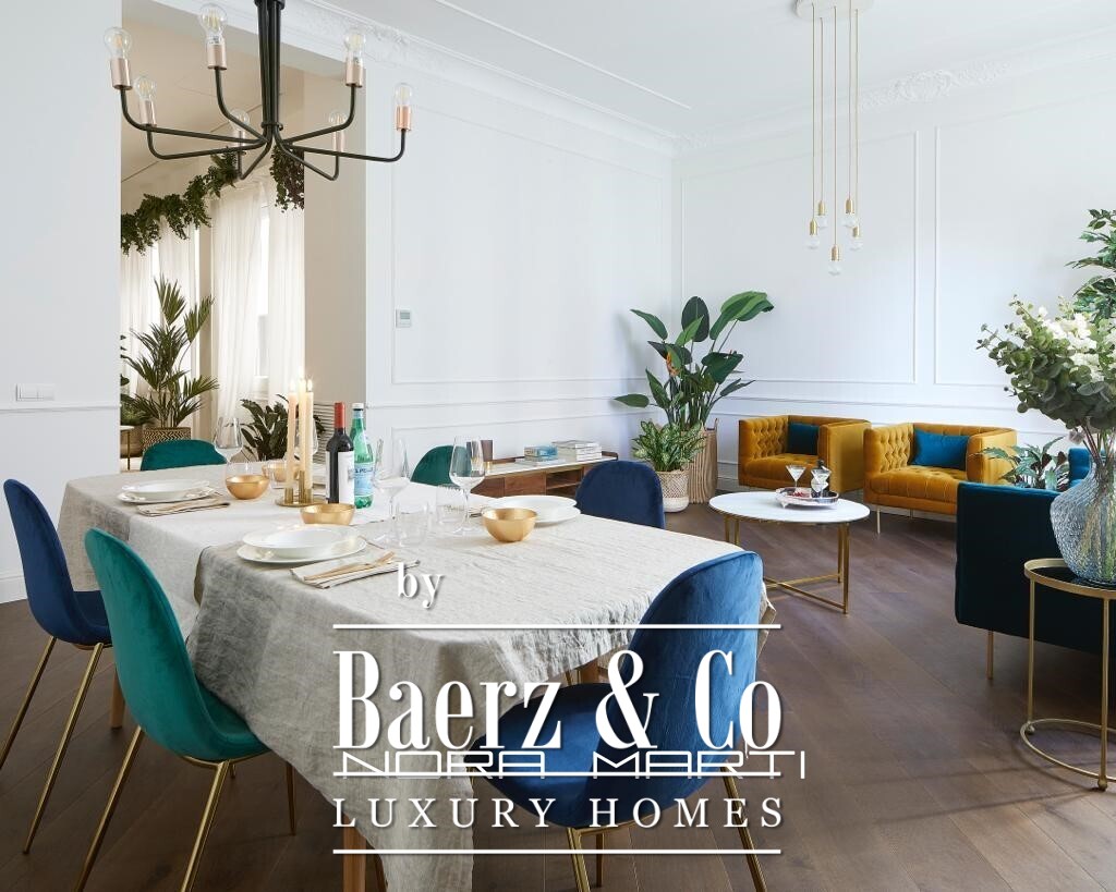 Het hart van het appartement is een royale woon- en eetkamer, gekenmerkt door hoge plafonds en originele ornamenten. Zorgvuldig geselecteerd meubilair en levendige accenten verwijzen naar het artistieke erfgoed van Barcelona, terwijl het gebruik van hoogwaardige materialen zowel warmte als verfijning toevoegt. De volledig uitgeruste keuken en de stijlvol afgewerkte badkamers weerspiegelen toewijding aan dagelijks comfort en ingetogen luxe.