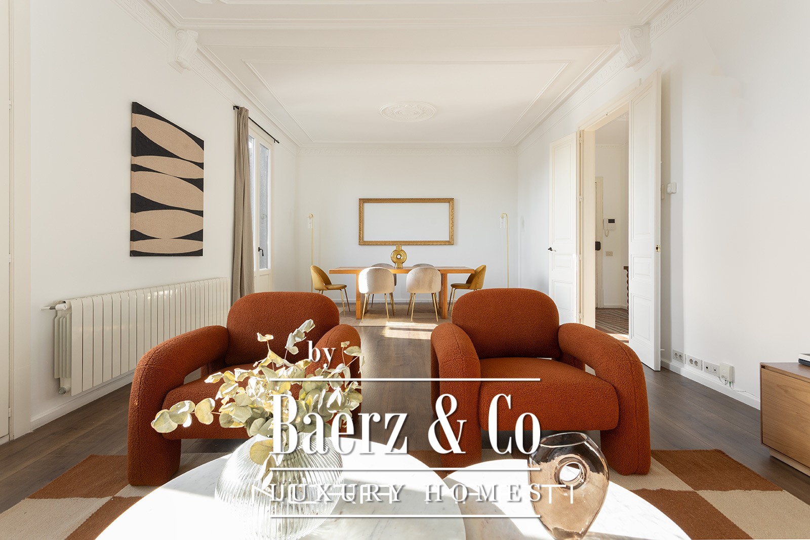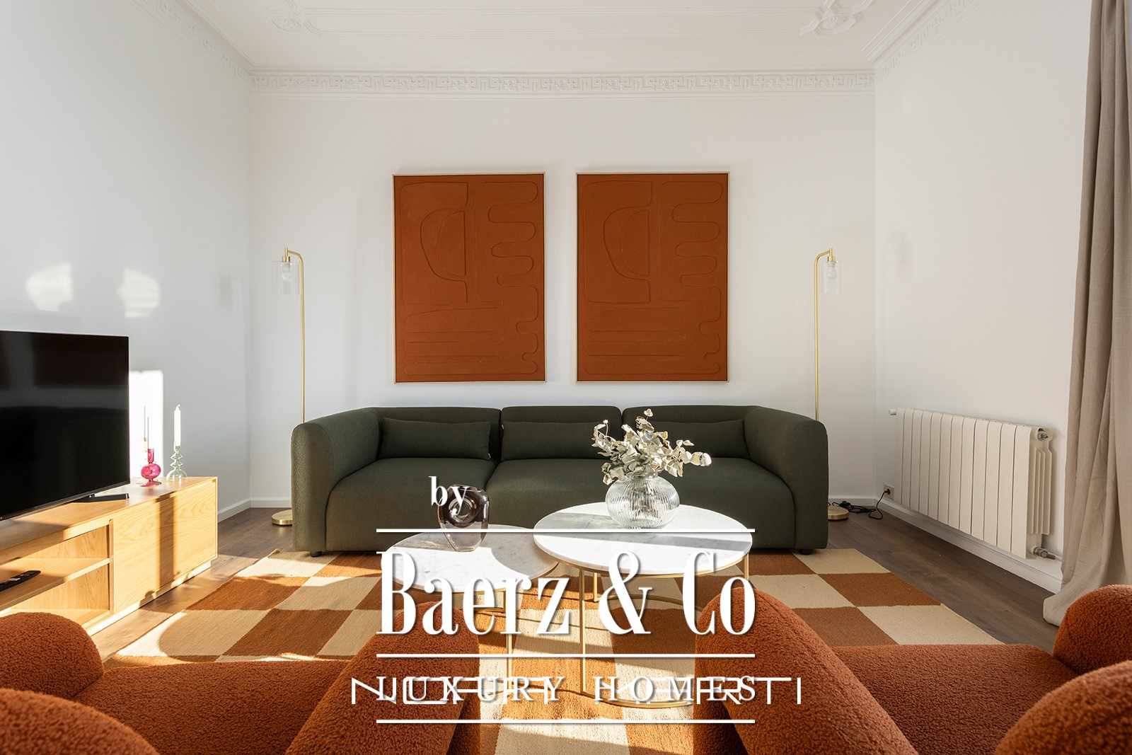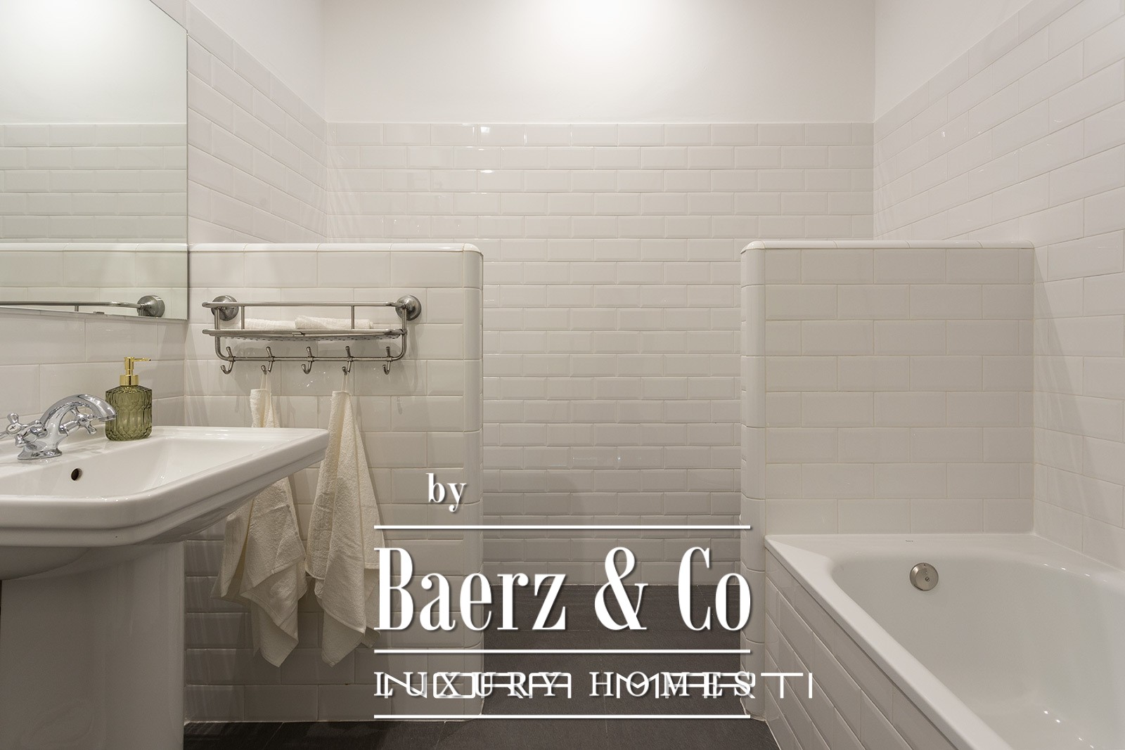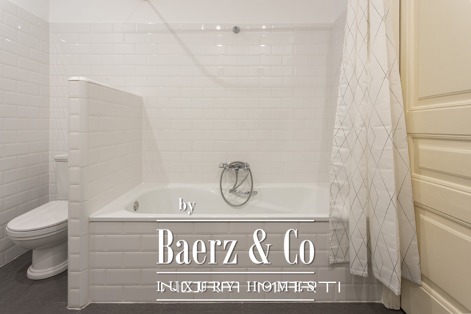 Het appartement van 152 m² is grondig gerenoveerd en combineert hedendaags comfort met authentieke elementen. Binnen zorgen verfijnde, moderne meubels voor een gevoel van helderheid en harmonie, passend bij een ingetogen stedelijke levensstijl. De indeling omvat drie slaapkamers — één tweepersoonskamer en twee eenpersoonskamers — en twee badkamers, wat een mooie balans brengt tussen privacy en gezamenlijke ruimtes. De hoge ramen in de woonkamer, kenmerkend voor de bouwperiode, vullen het interieur met natuurlijk licht; de ideale ligging en het warme parket versterken dit effect. Een volledig uitgeruste keuken met ontbijthoek verhoogt het dagelijks wooncomfort.