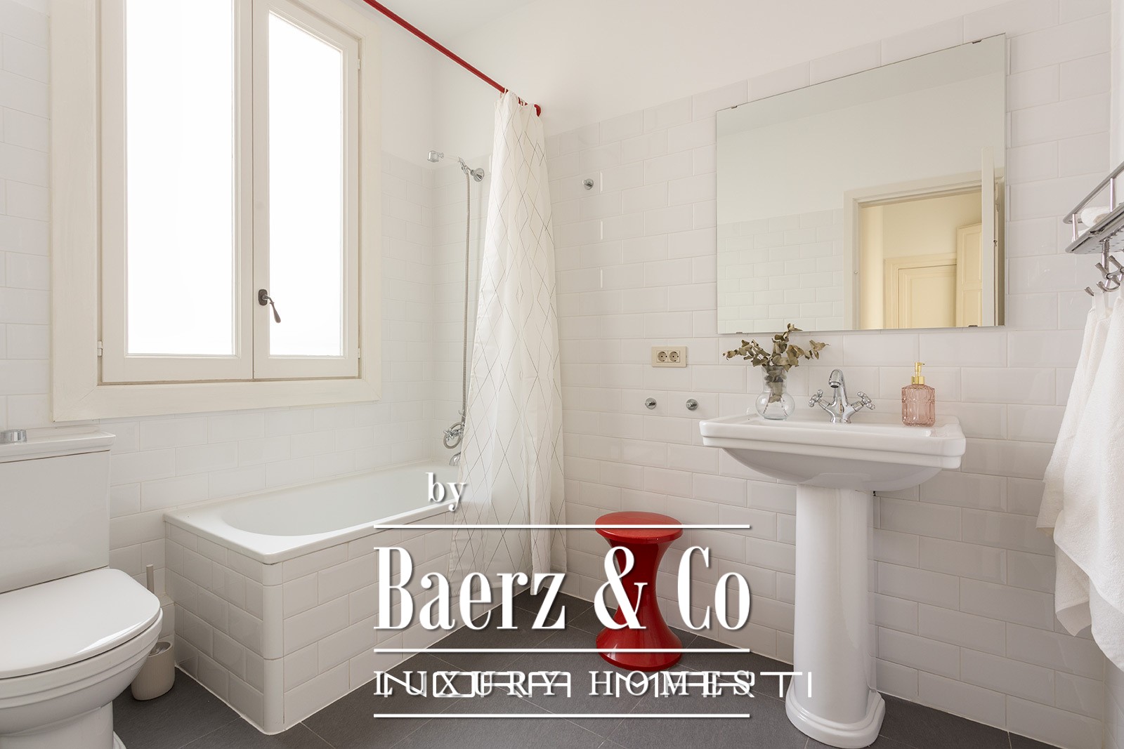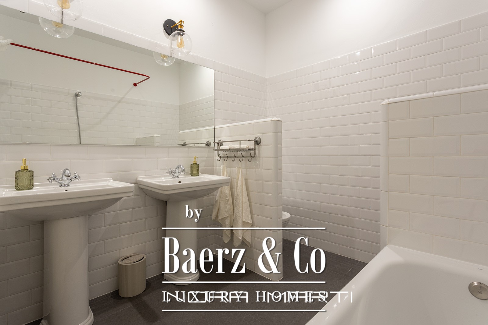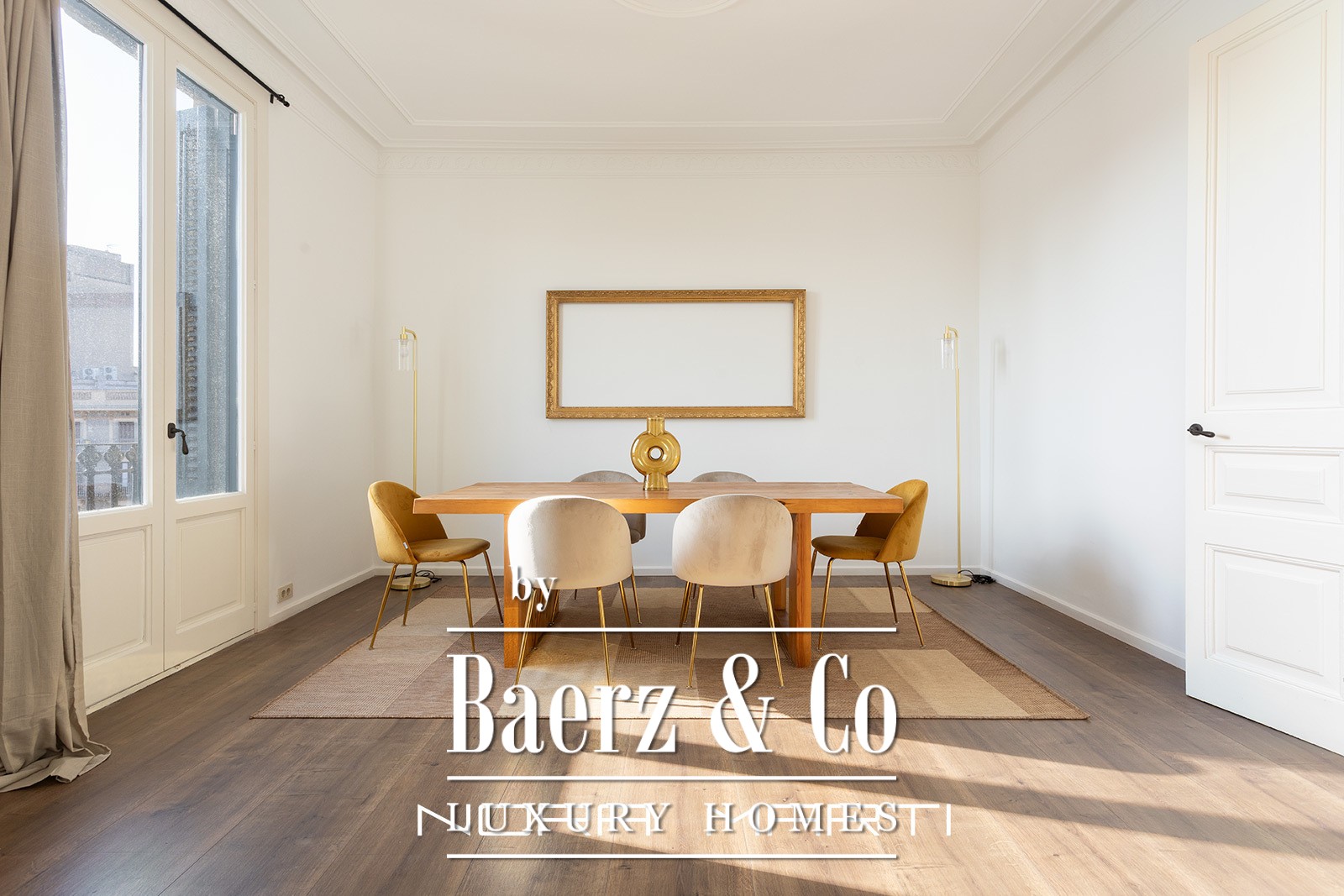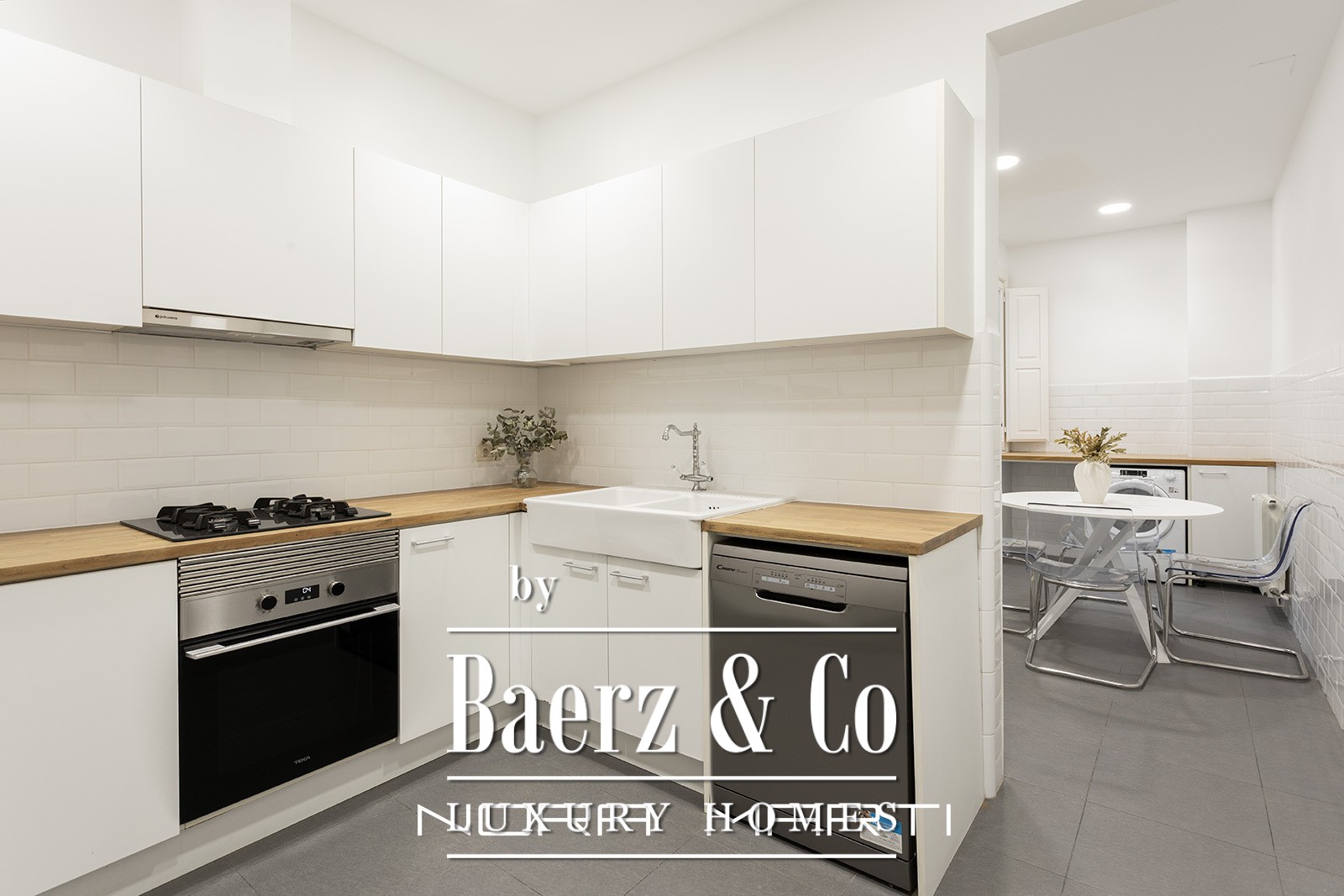 Het appartement van 152 m² is grondig gerenoveerd en combineert hedendaags comfort met authentieke elementen. Binnen zorgen verfijnde, moderne meubels voor een gevoel van helderheid en harmonie, passend bij een ingetogen stedelijke levensstijl. De indeling omvat drie slaapkamers — één tweepersoonskamer en twee eenpersoonskamers — en twee badkamers, wat een mooie balans brengt tussen privacy en gezamenlijke ruimtes. De hoge ramen in de woonkamer, kenmerkend voor de bouwperiode, vullen het interieur met natuurlijk licht; de ideale ligging en het warme parket versterken dit effect. Een volledig uitgeruste keuken met ontbijthoek verhoogt het dagelijks wooncomfort.