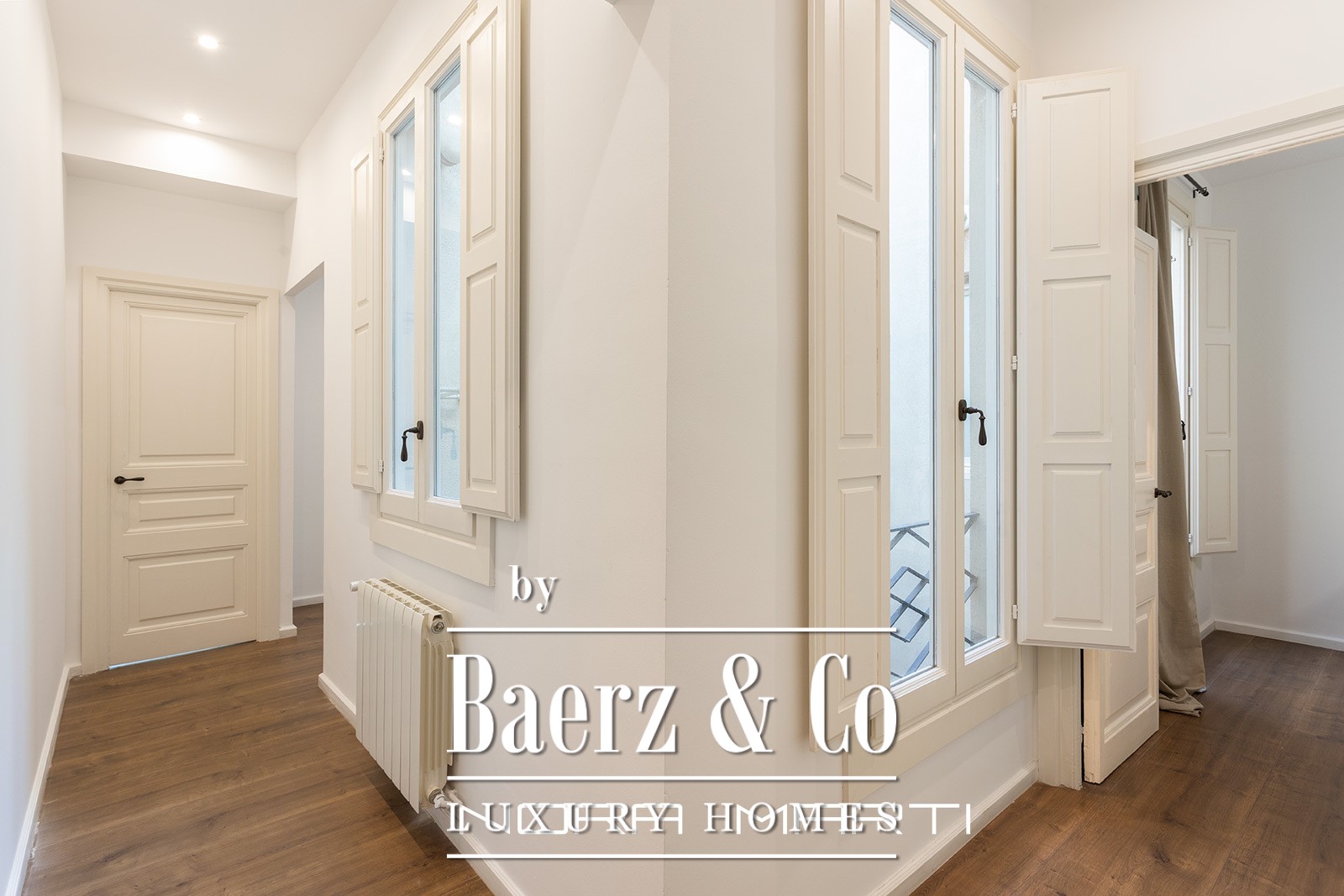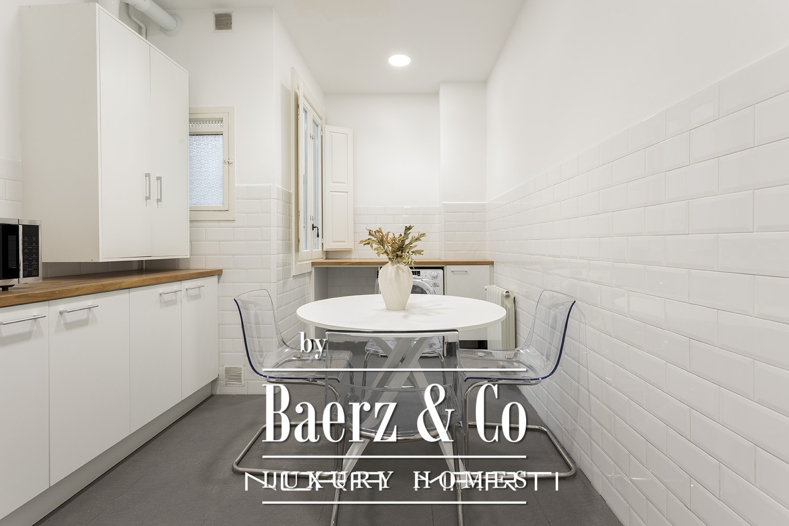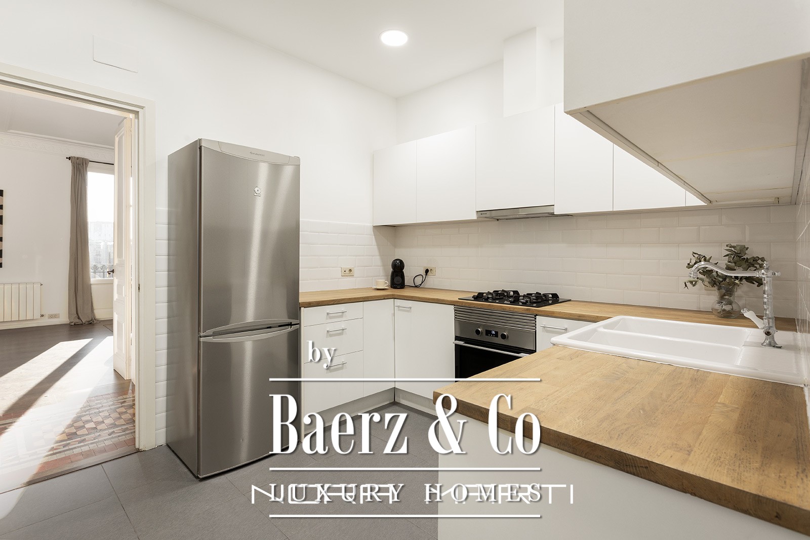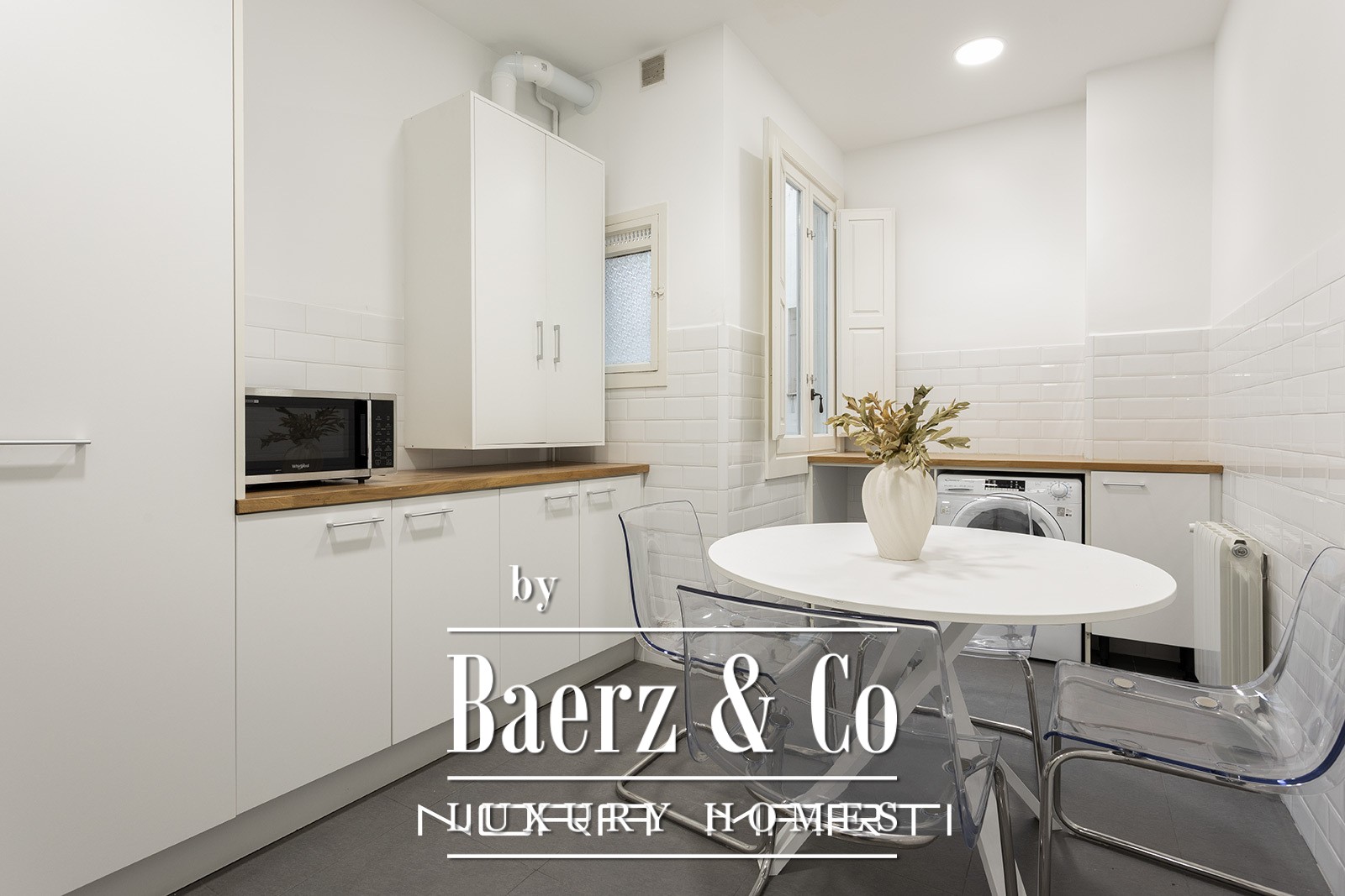 Het appartement van 152 m² is grondig gerenoveerd en combineert hedendaags comfort met authentieke elementen. Binnen zorgen verfijnde, moderne meubels voor een gevoel van helderheid en harmonie, passend bij een ingetogen stedelijke levensstijl. De indeling omvat drie slaapkamers — één tweepersoonskamer en twee eenpersoonskamers — en twee badkamers, wat een mooie balans brengt tussen privacy en gezamenlijke ruimtes. De hoge ramen in de woonkamer, kenmerkend voor de bouwperiode, vullen het interieur met natuurlijk licht; de ideale ligging en het warme parket versterken dit effect. Een volledig uitgeruste keuken met ontbijthoek verhoogt het dagelijks wooncomfort.