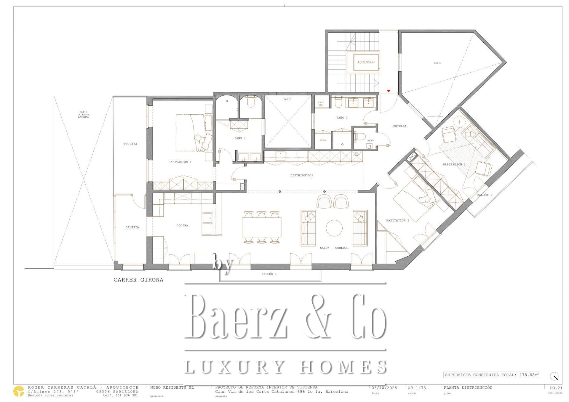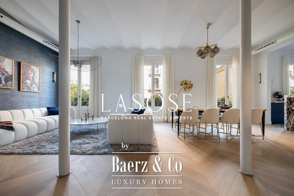 Appartement Barcelona nodigt uit tot verfijnd stedelijk wonen. Deze woning van 199 m² op de derde verdieping is recent gerenoveerd en zorgvuldig ontworpen om optimaal gebruik te maken van het natuurlijke licht; vier balkondeuren aan de Calle Girona en royale ramen versterken de lichte sfeer. De indeling verloopt vloeiend van de open keuken en eetruimte naar een woonkamer, voorzien van een maatwerkbar en bijkeuken met twee wijnklimaatkasten en een tweede vaatwasser.