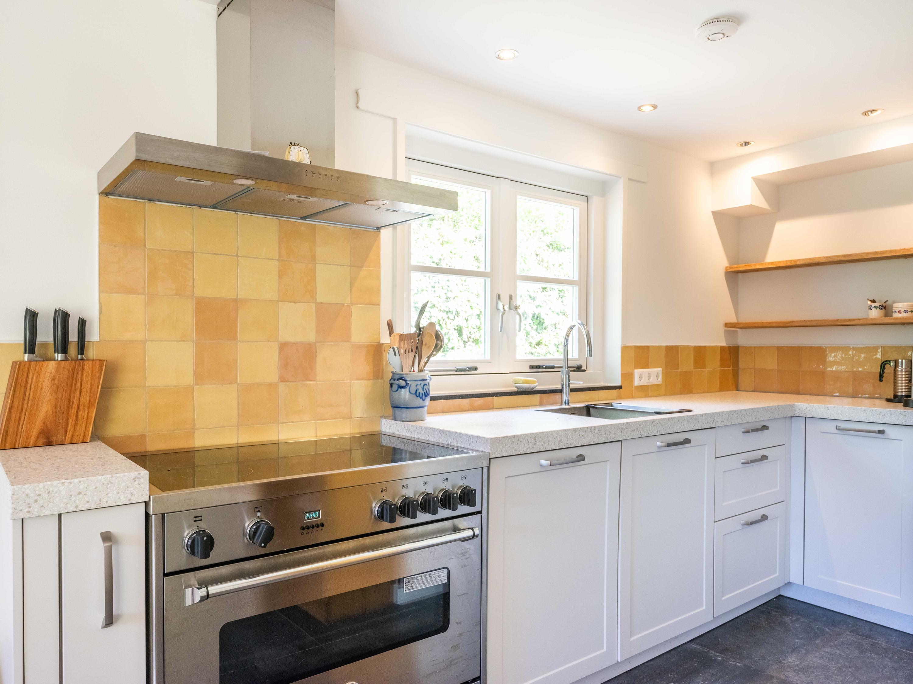 De woonkeuken is een fijne plek voor het hele gezin, voorzien van alle gemakken: een quooker, vaatwasser, afzuigkap, grote oven met inductiekookplaat en een losse koel-vriescombinatie. Vanuit de keuken is ook toegang tot de meterkast.