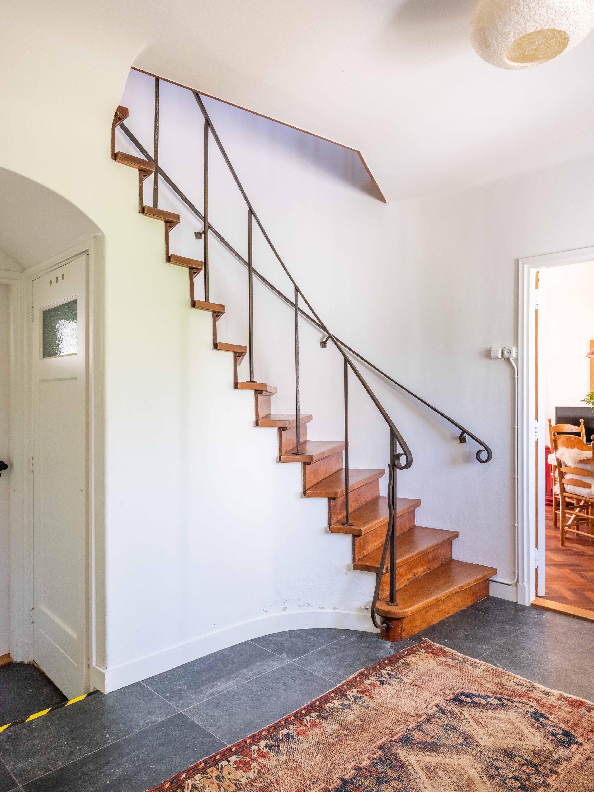 We nemen u mee naar binnen. Bij binnenkomst valt direct de fraaie entreehal op met een stijlvolle trapopgang met smeedijzeren leuning, een moderne toiletruimte en een handige kelderkast. De woonkamer is licht en sfeervol met een originele houten parketvloer, een houtkachel en openslaande tuindeuren naar de groene tuin. Ingebouwde houten maatwerkkasten zorgen voor extra charme én bergruimte.
