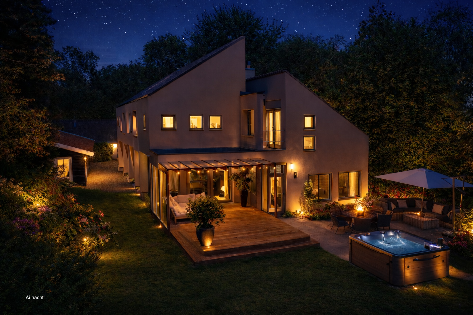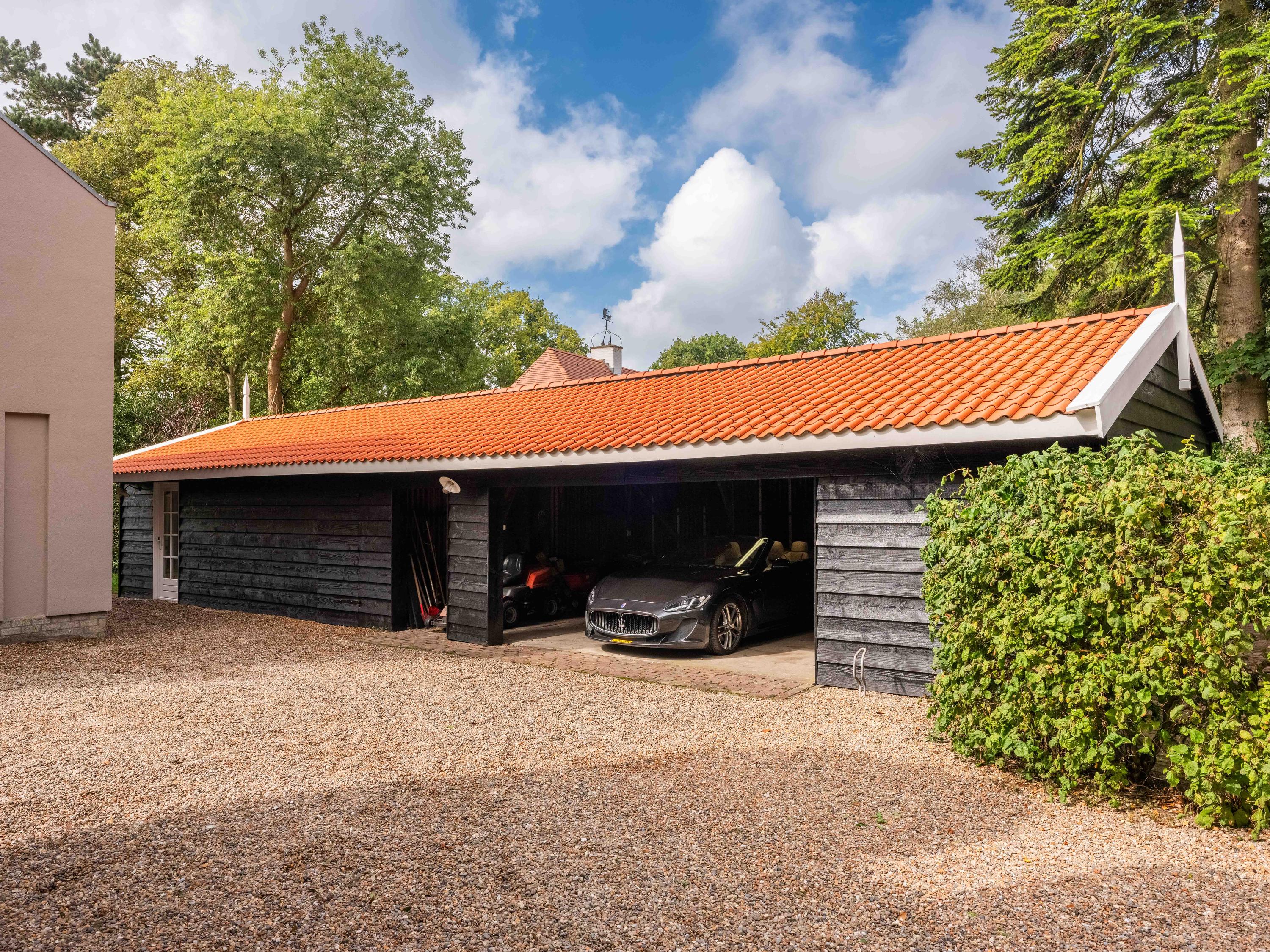 Naast de villa staat een mooie houten carport voor meerdere auto's, deze carport loopt door in een werkplaats voorzien van water en elektra en is voorbereid op een wellnessruimte.