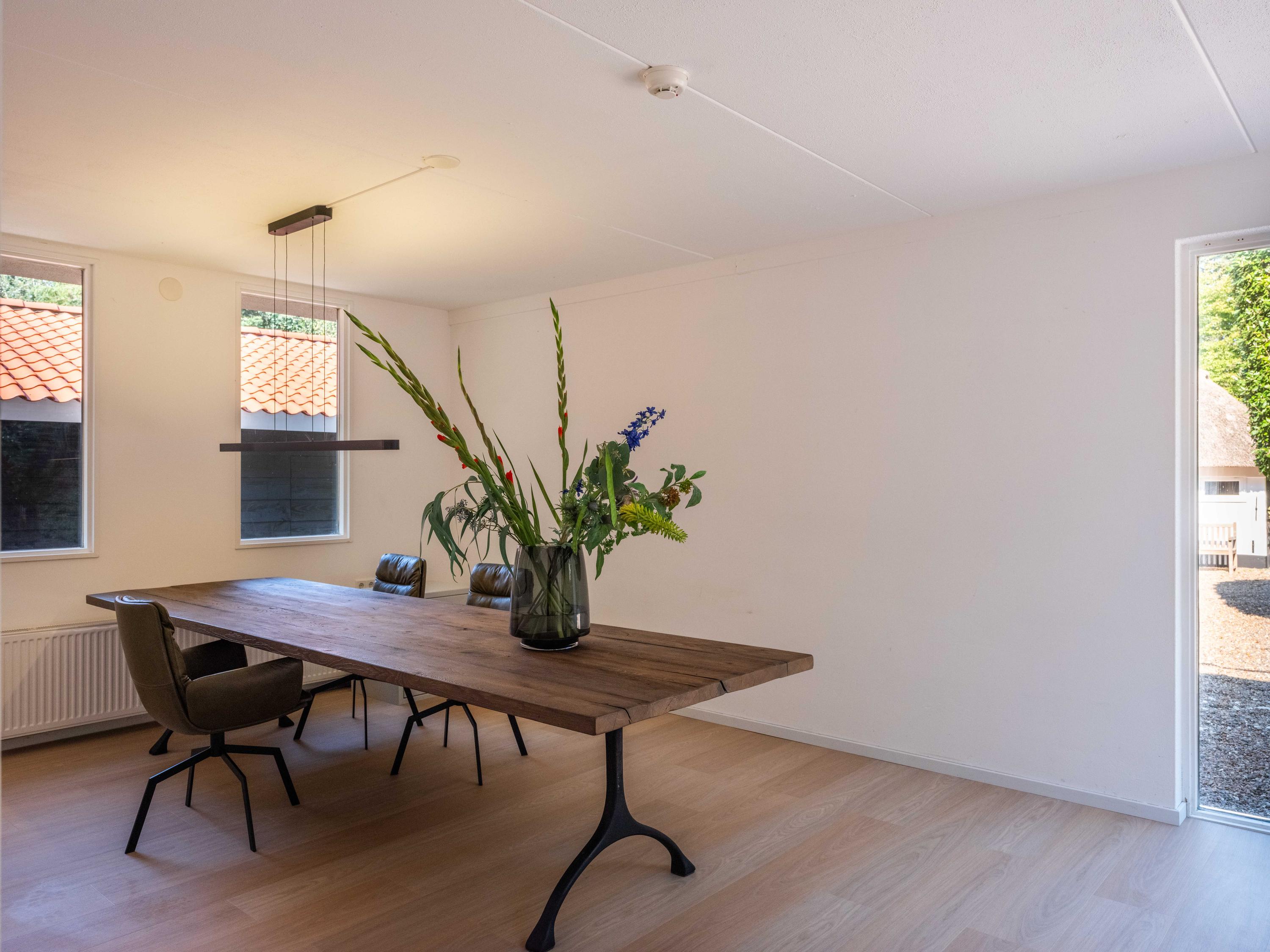 Op de begane grond bevinden zich nog 2 kamers waarvan 1 met deur naar buiten, nu in gebruik als kastenkamer/bergruimte voor schoenen en jassen. De andere royale kamer is op het noorden gelegen en dient nu als kantoor. Ook dit is een mooie lichte ruimte, met openslaande deuren, voor diverse doeleinden te gebruiken.