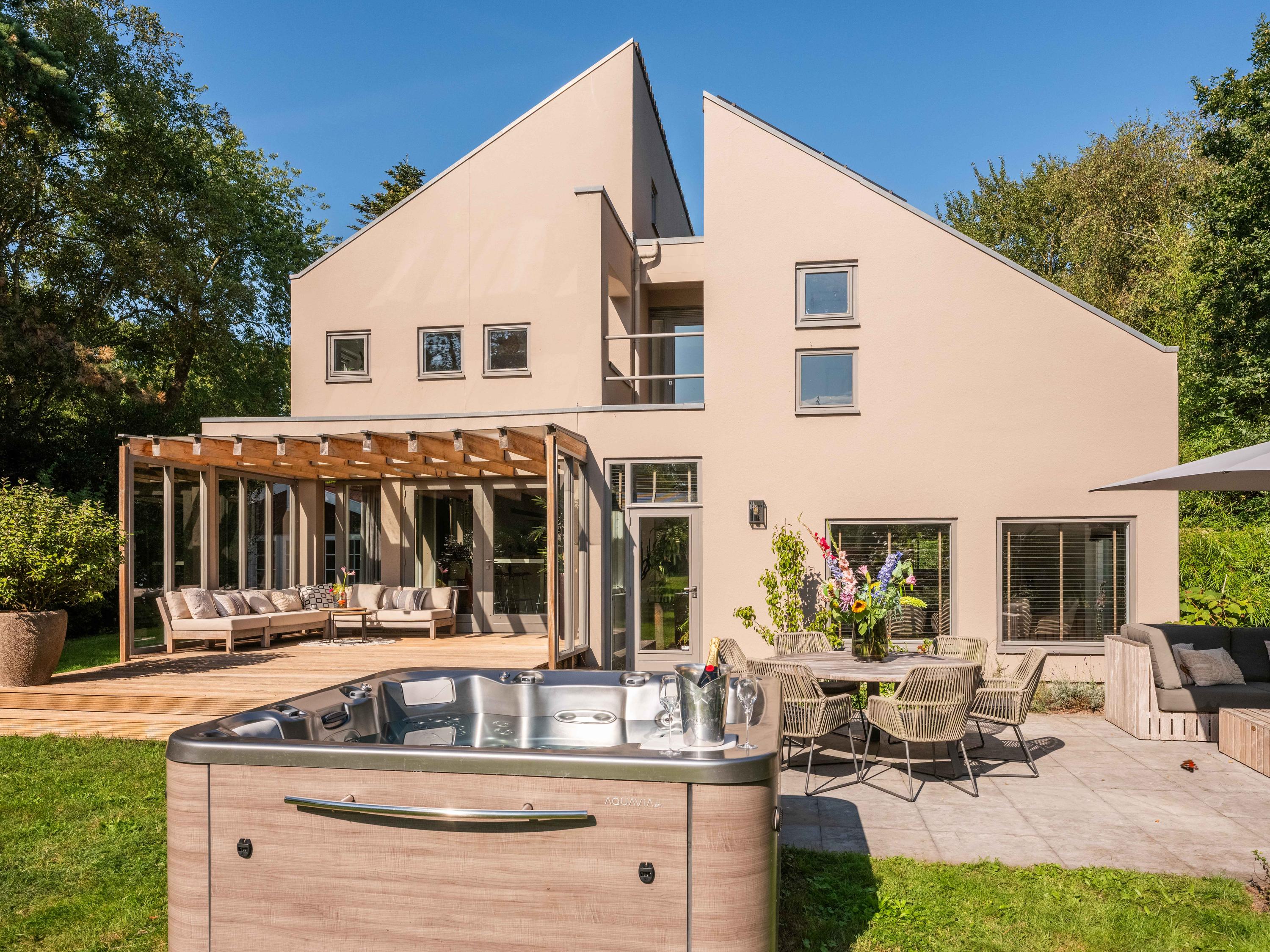 Aan de voorzijde is voldoende ruimte voor het parkeren van diverse auto's op eigen terrein. Aan de achterzijde van de villa treft men een mooie royale tuin met diverse terrassen waar men heerlijk kan genieten van zon, natuur en het prachtige uitzicht op het achtergelegen weiland.