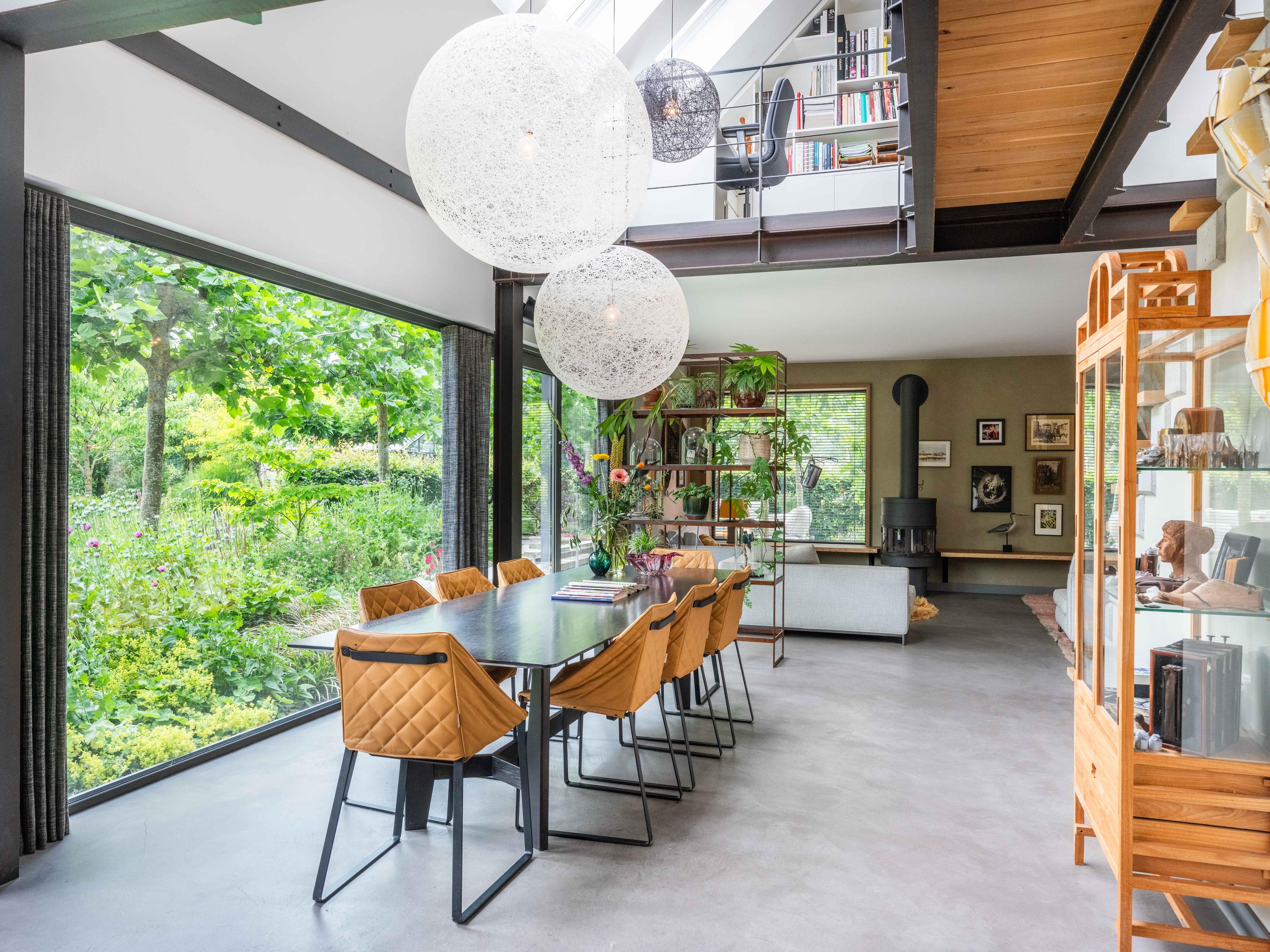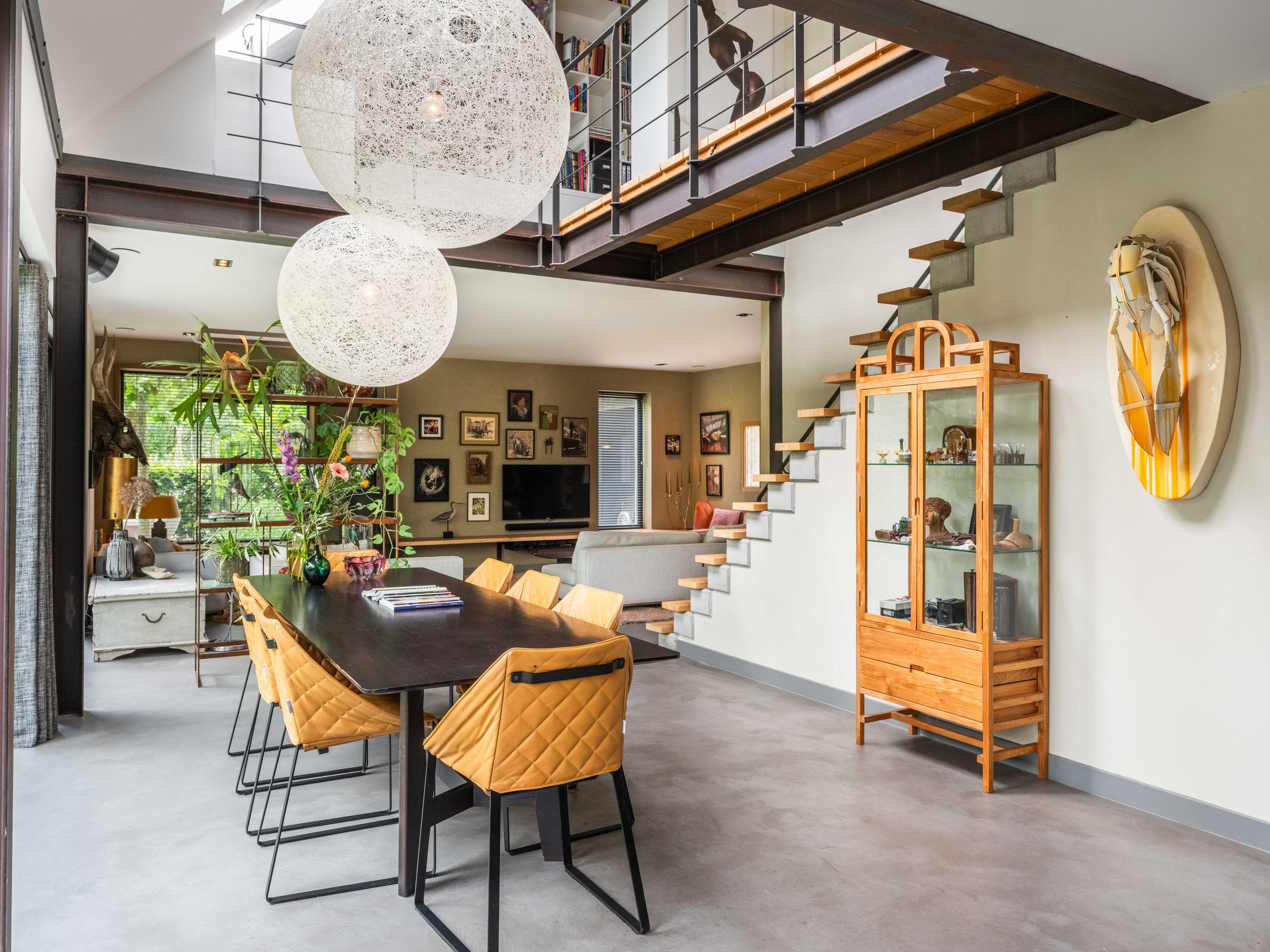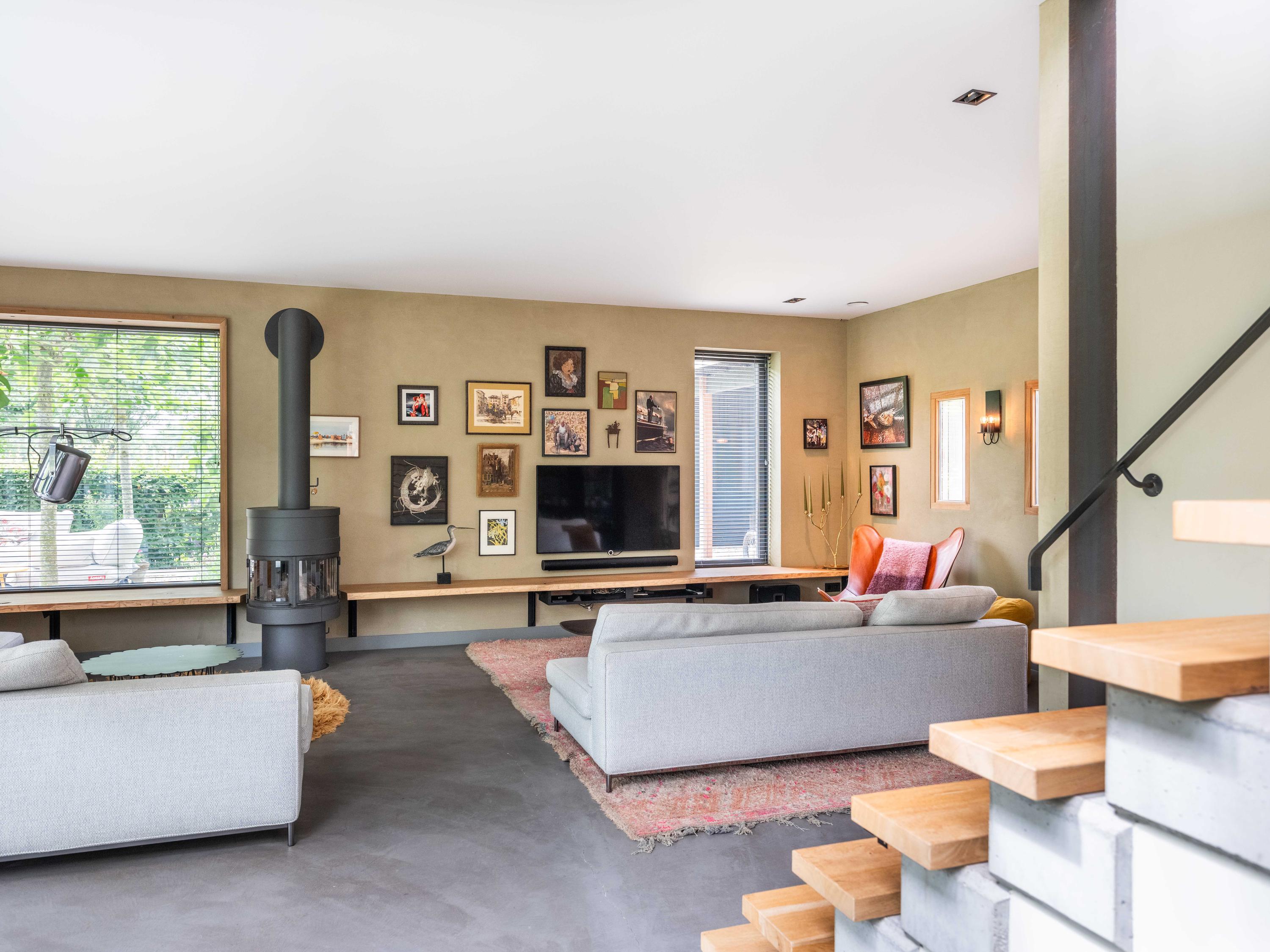 We nemen u graag mee naar binnen. Via de entree betreden we de sfeervolle woonkamer met open keuken. De keuken is volledig uitgerust en biedt alles wat het hart van de kookliefhebber begeert. Wat direct opvalt, zijn de grote raampartijen die zorgen voor een prachtige lichtinval en een weids uitzicht op de groene tuin en de omliggende weilanden. Ook de trap naar de verdieping is een ware blikvanger – een architectonisch hoogstandje dat karakter toevoegt aan de ruimte. Het huis is als een loft opgezet met volledig open karakter.