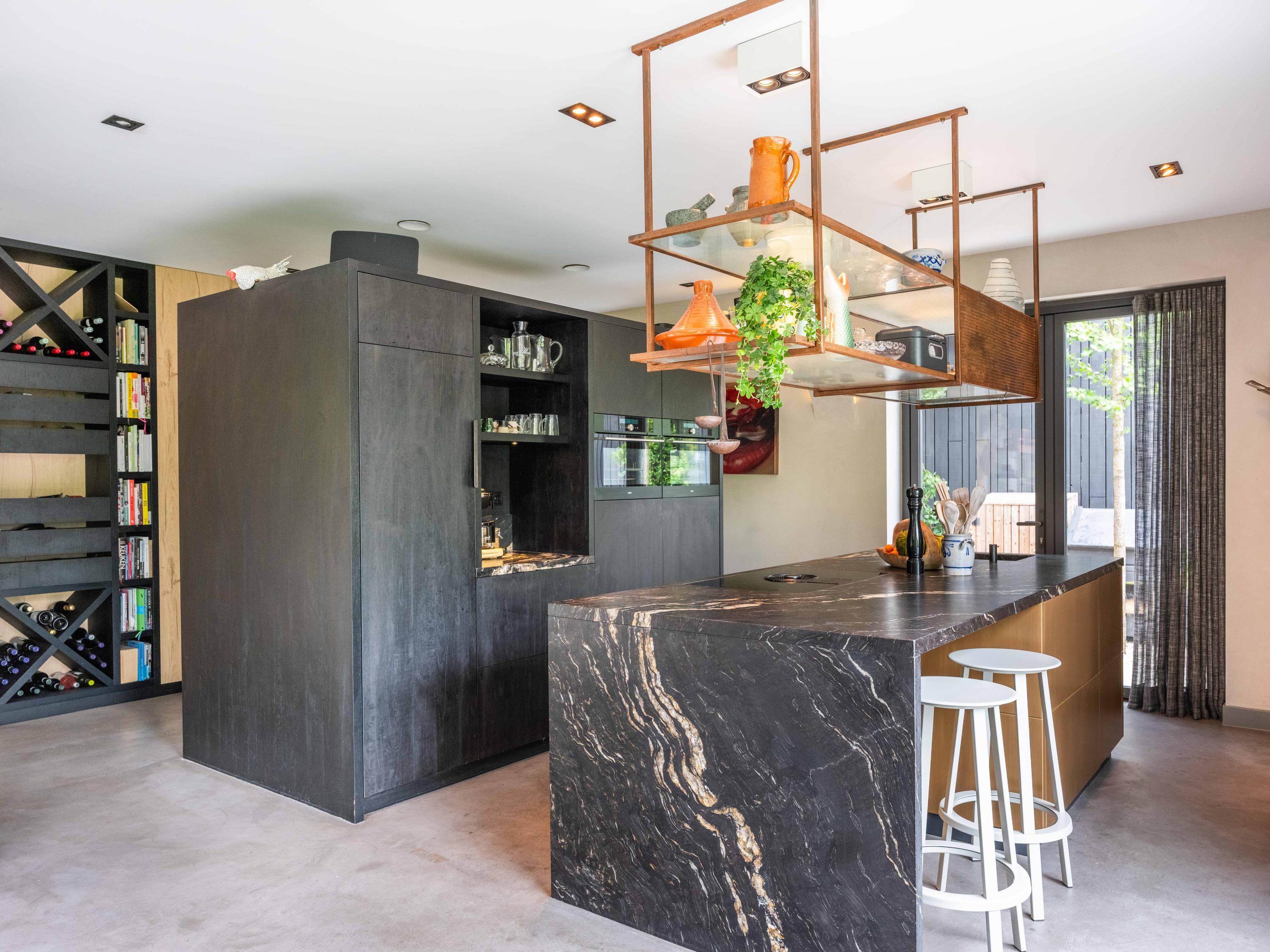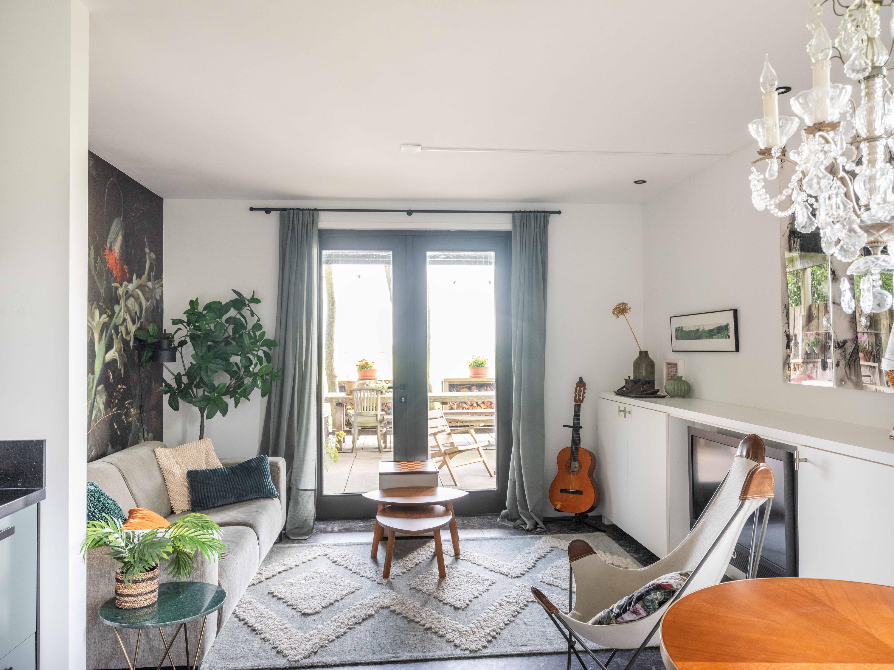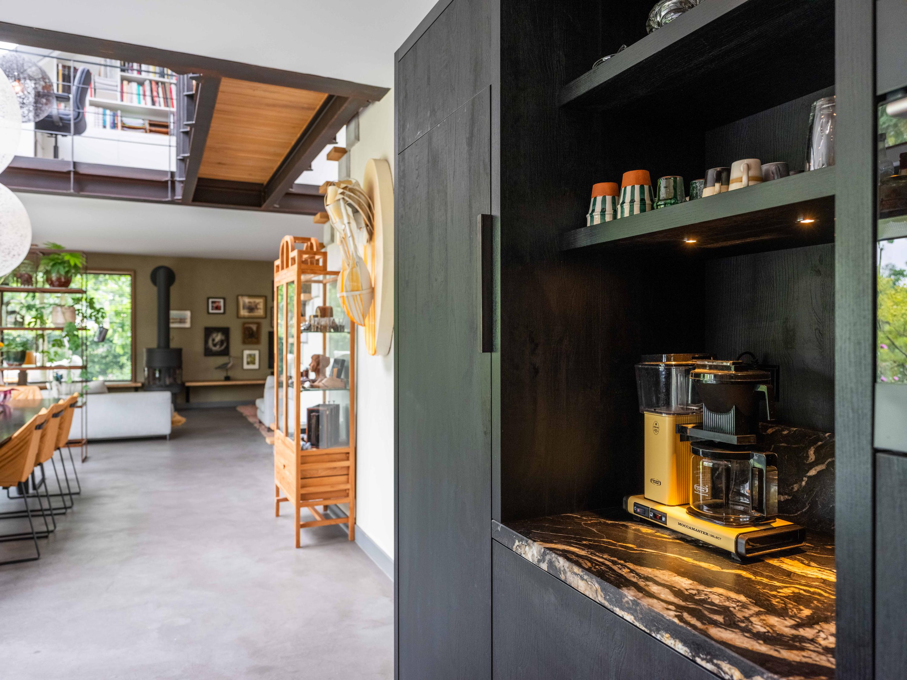We nemen u graag mee naar binnen. Via de entree betreden we de sfeervolle woonkamer met open keuken. De keuken is volledig uitgerust en biedt alles wat het hart van de kookliefhebber begeert. Wat direct opvalt, zijn de grote raampartijen die zorgen voor een prachtige lichtinval en een weids uitzicht op de groene tuin en de omliggende weilanden. Ook de trap naar de verdieping is een ware blikvanger – een architectonisch hoogstandje dat karakter toevoegt aan de ruimte. Het huis is als een loft opgezet met volledig open karakter.