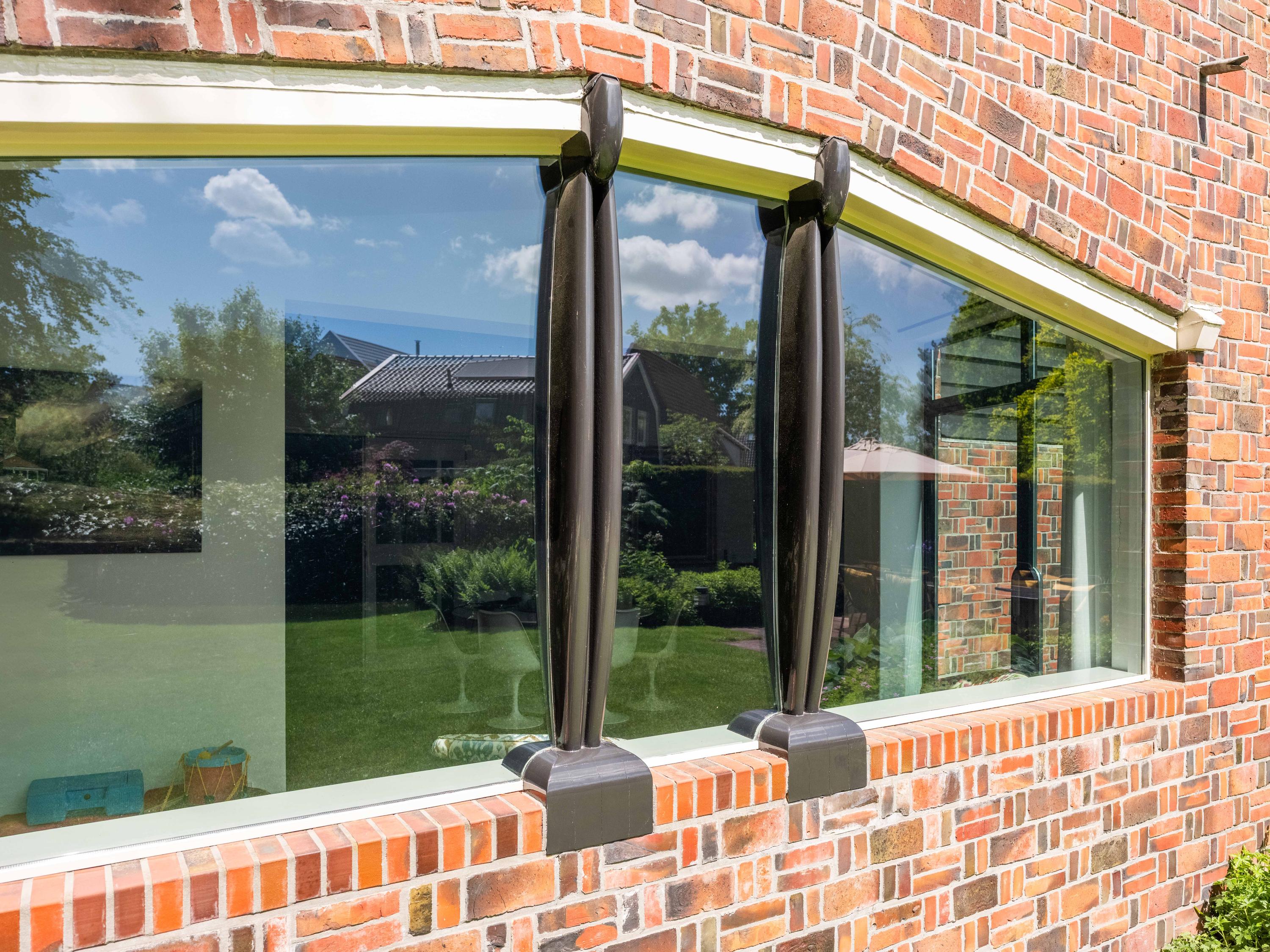 Openslaande deuren leiden naar de royale woonkamer met open haard, een eetgedeelte en serre. Opvallend is het verhoogde gedeelte "de stuurhut". Een mooie parketvloer met bies, de ronde vormen van de open haard , de "kompasbollen" bij de verhoging en het trapeziumvormige raam met kolommen geven het geheel een bijzondere uitstraling.