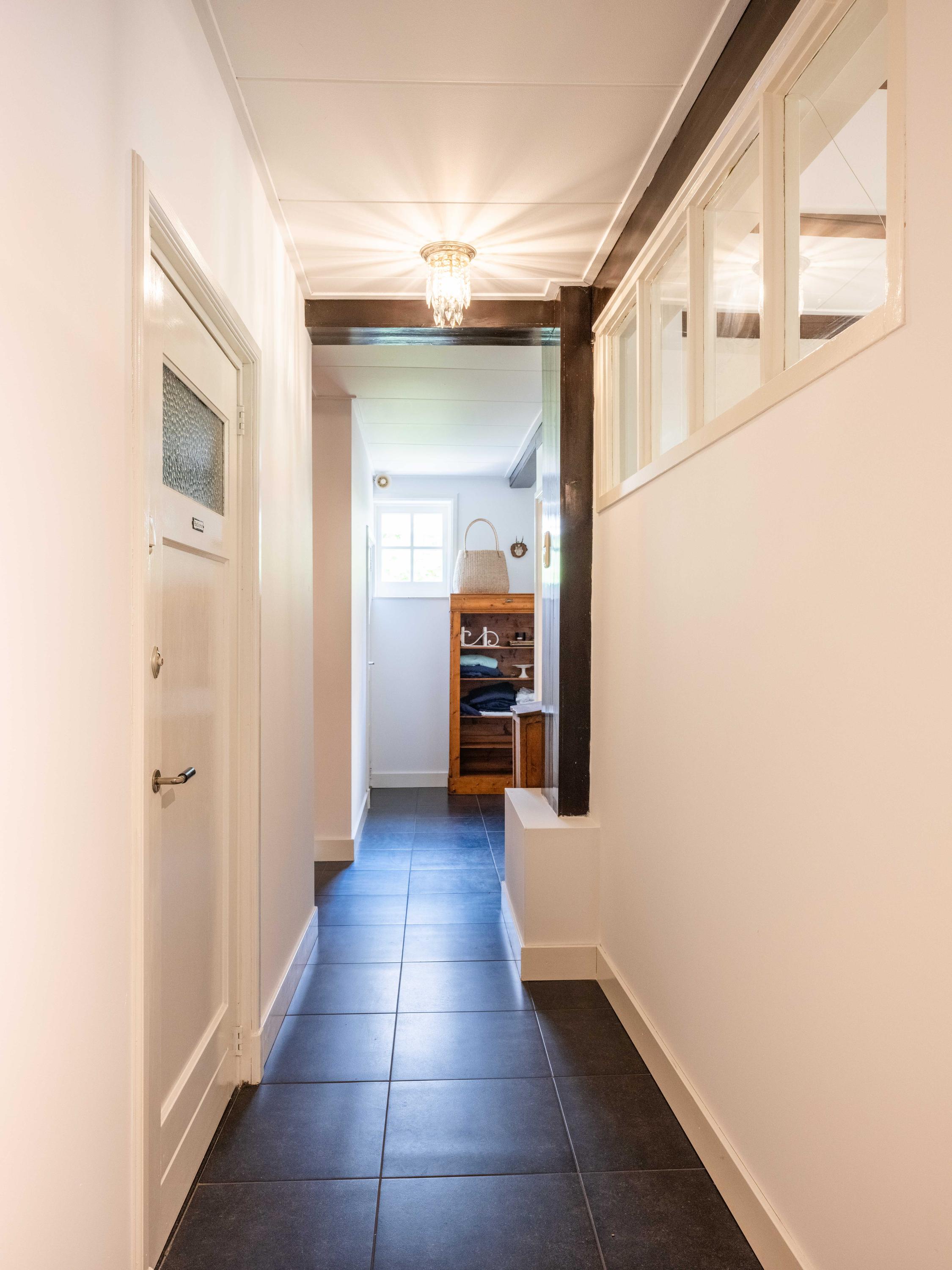 Via de entree komen we in de hal waar meteen de fraaie vloer van Italiaans getrommelde boerderijstenen opvallen. Links komen we in de master bedroom met wastafel en vaste kastenwand. Verder vinden we in de hal een separaat toilet met fontein en een badkamer met toilet, ligbad, inloopdouche en dubbele wastafel.