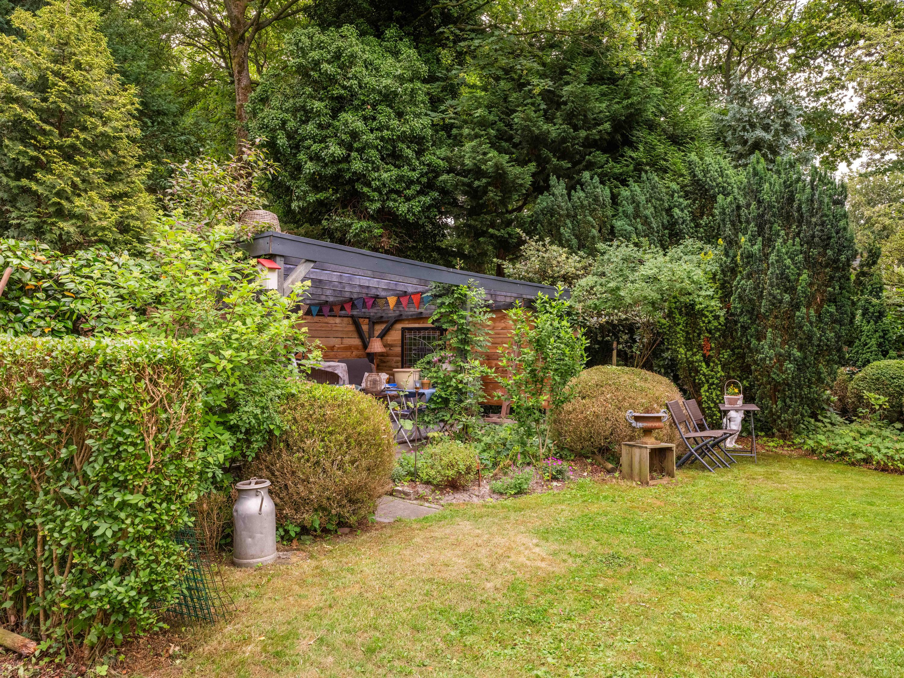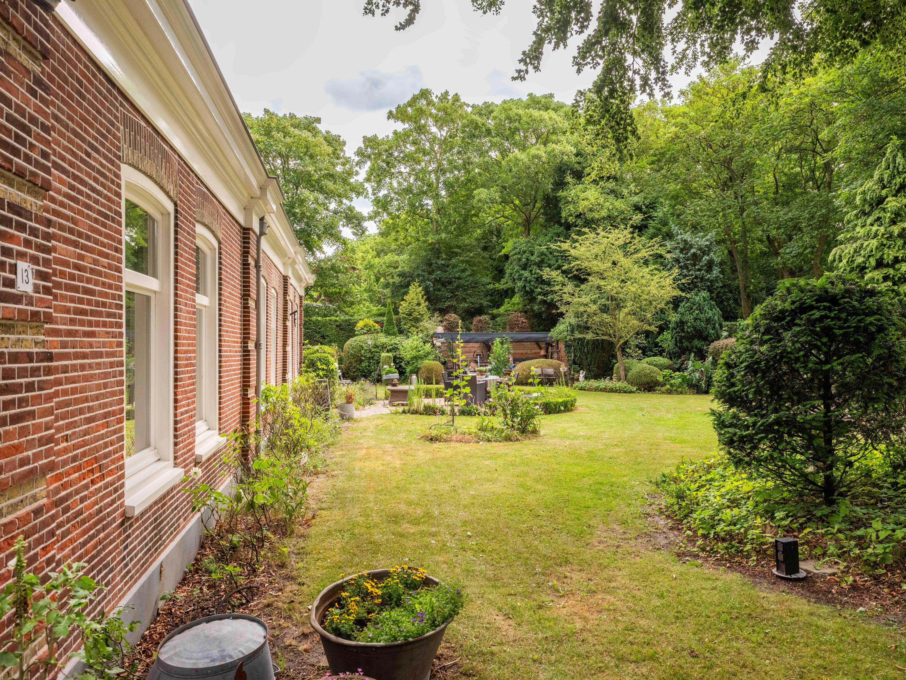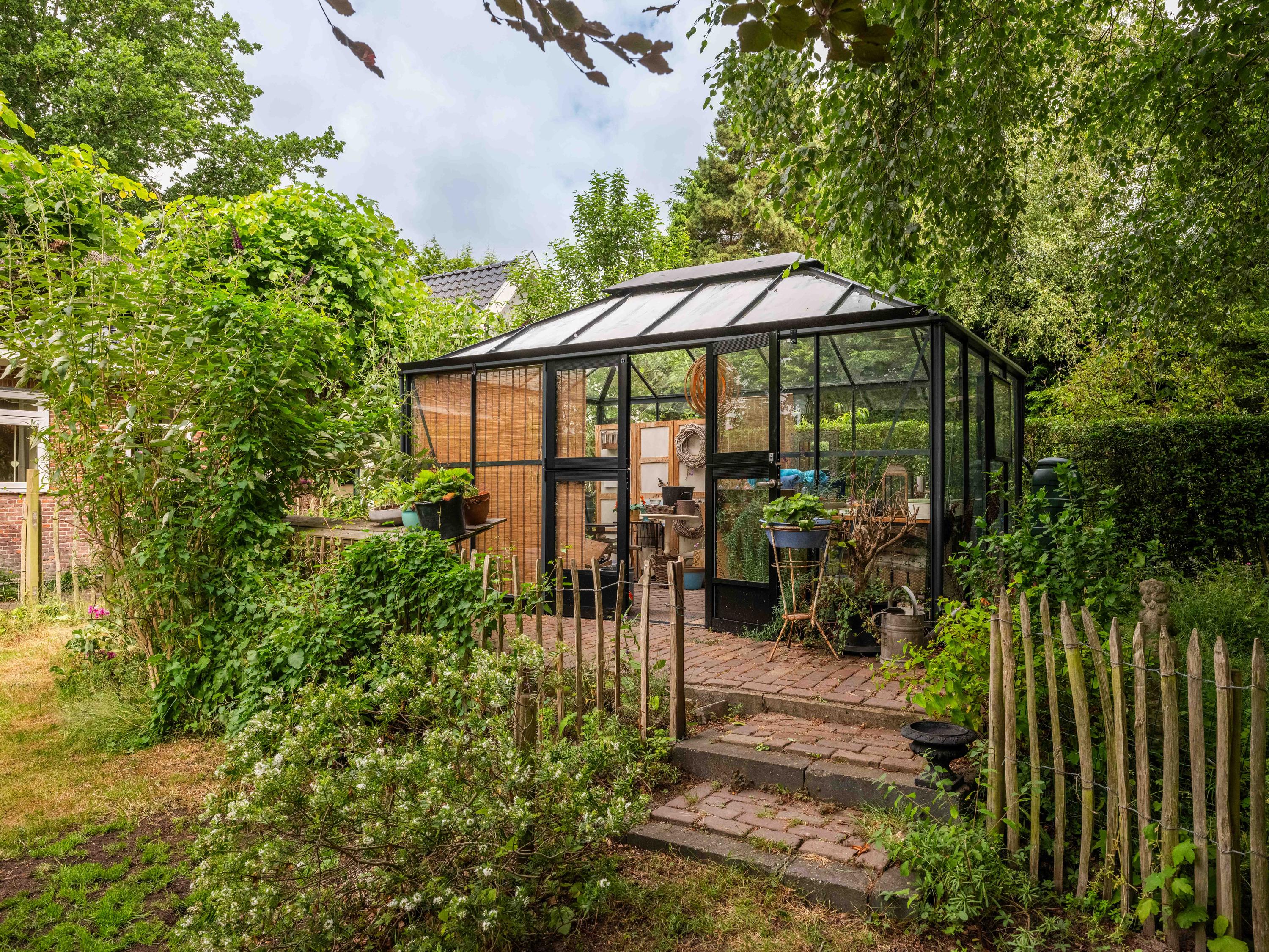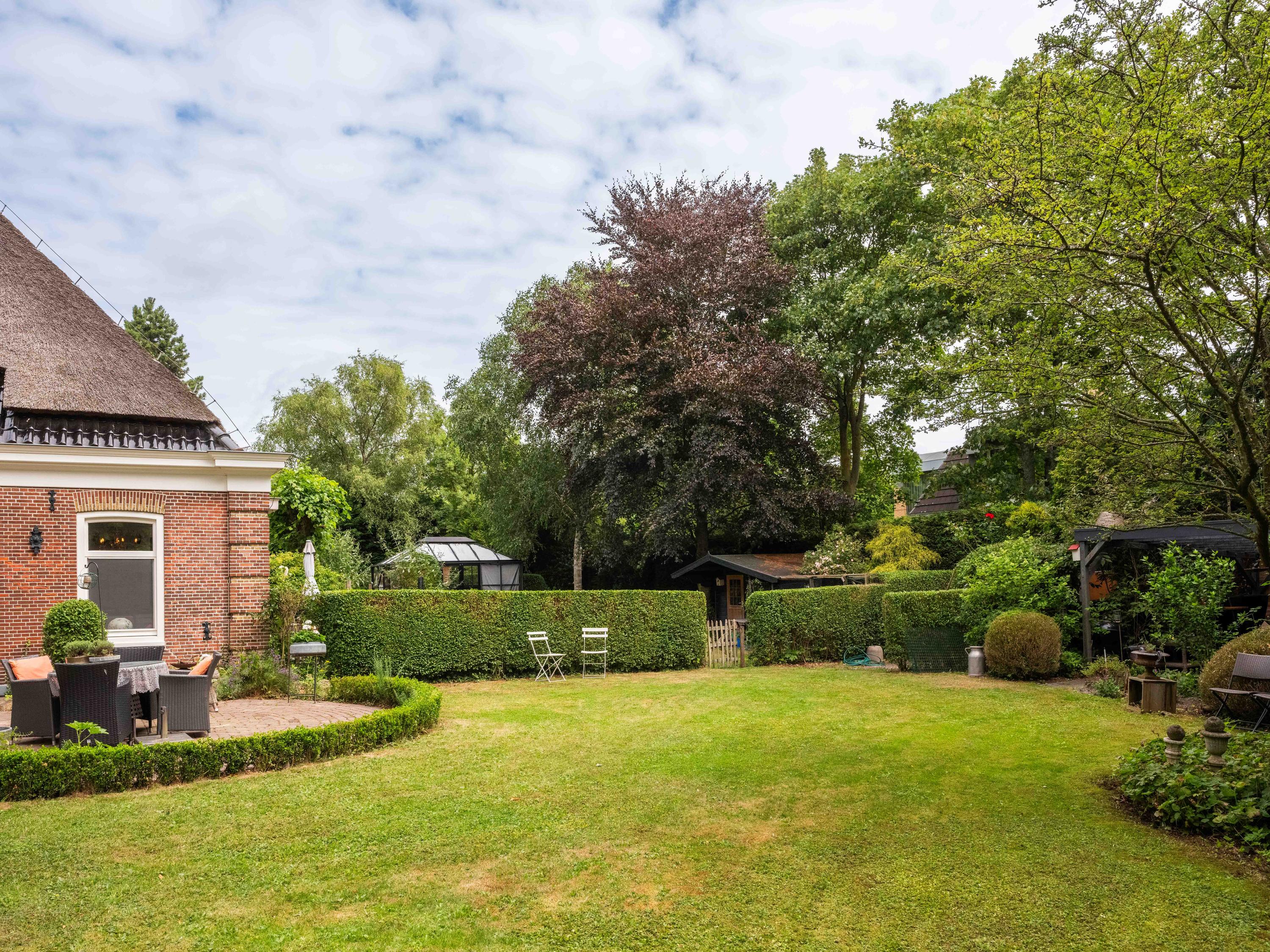 De tuin: Veel rust en privacy vindt u in de vol begroeide tuin rondom de woning. Het is een weelde om er doorheen te lopen. Zo vinden we er meerdere terrassen, een luxe plantenkas/orangerie, een kippenhok, een ruime houten garage met vide ( voor meerdere auto’s) en voldoende parkeergelegenheid daarnaast voor 2 auto’s. Tevens is de tuin voorzien van een bron en een bewateringssysteem.