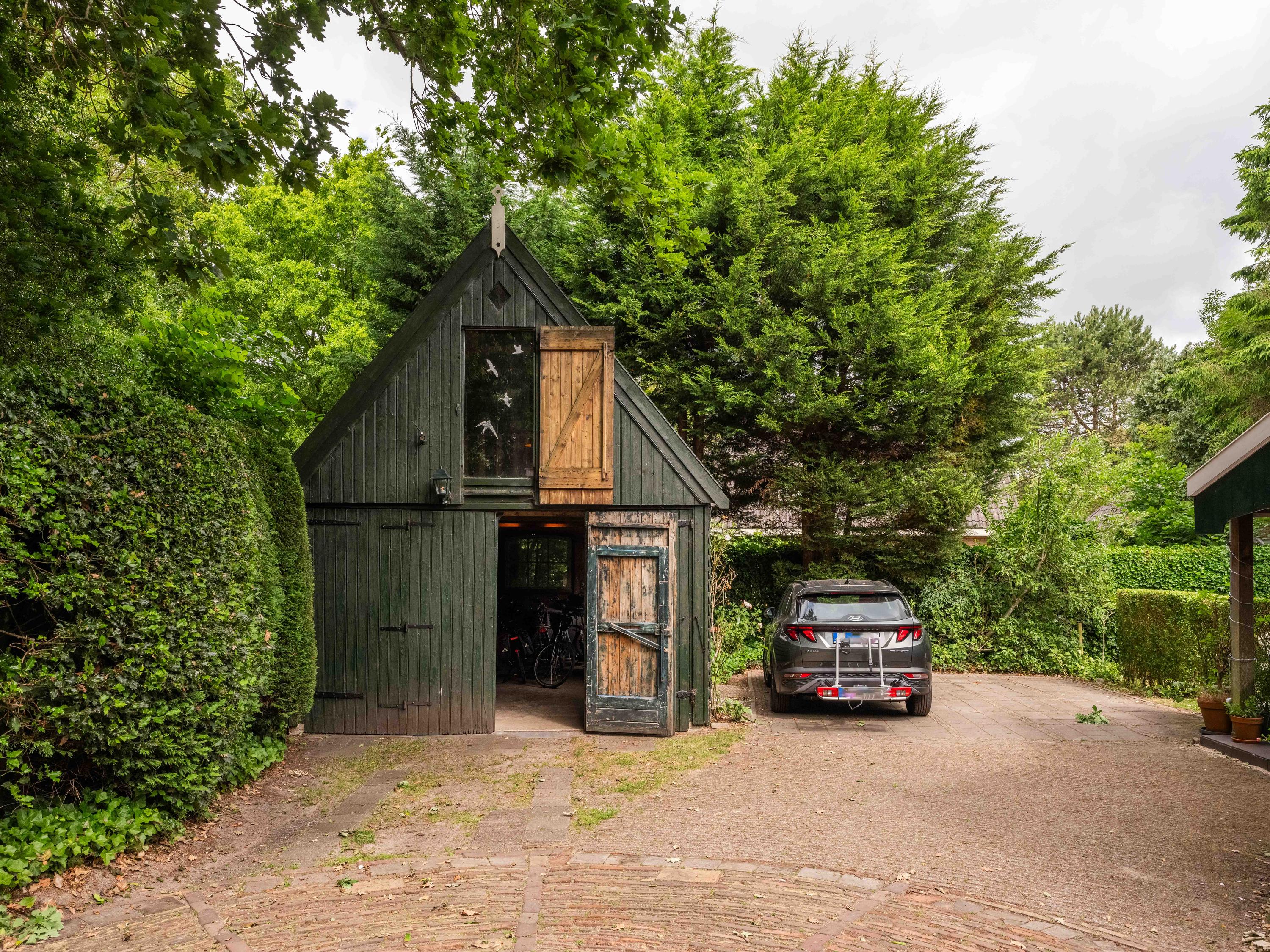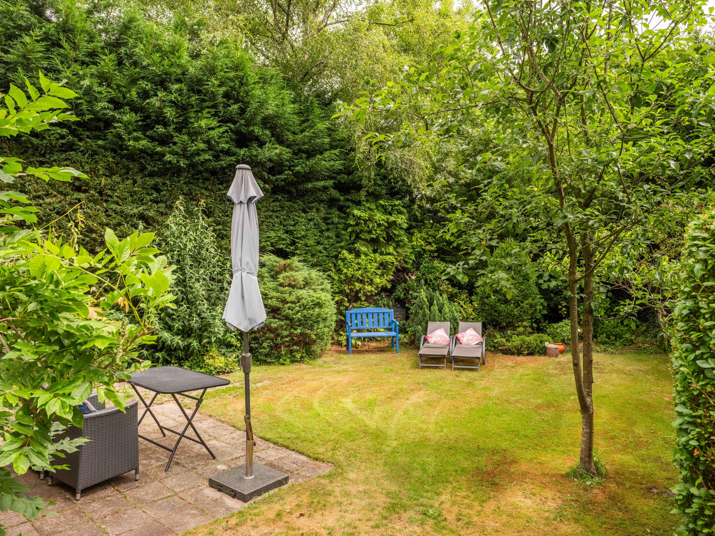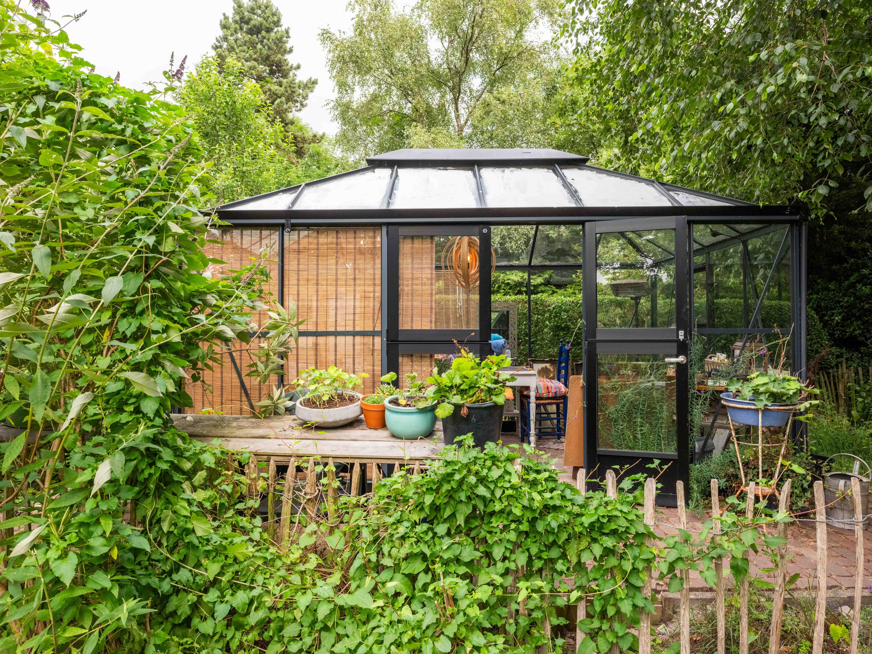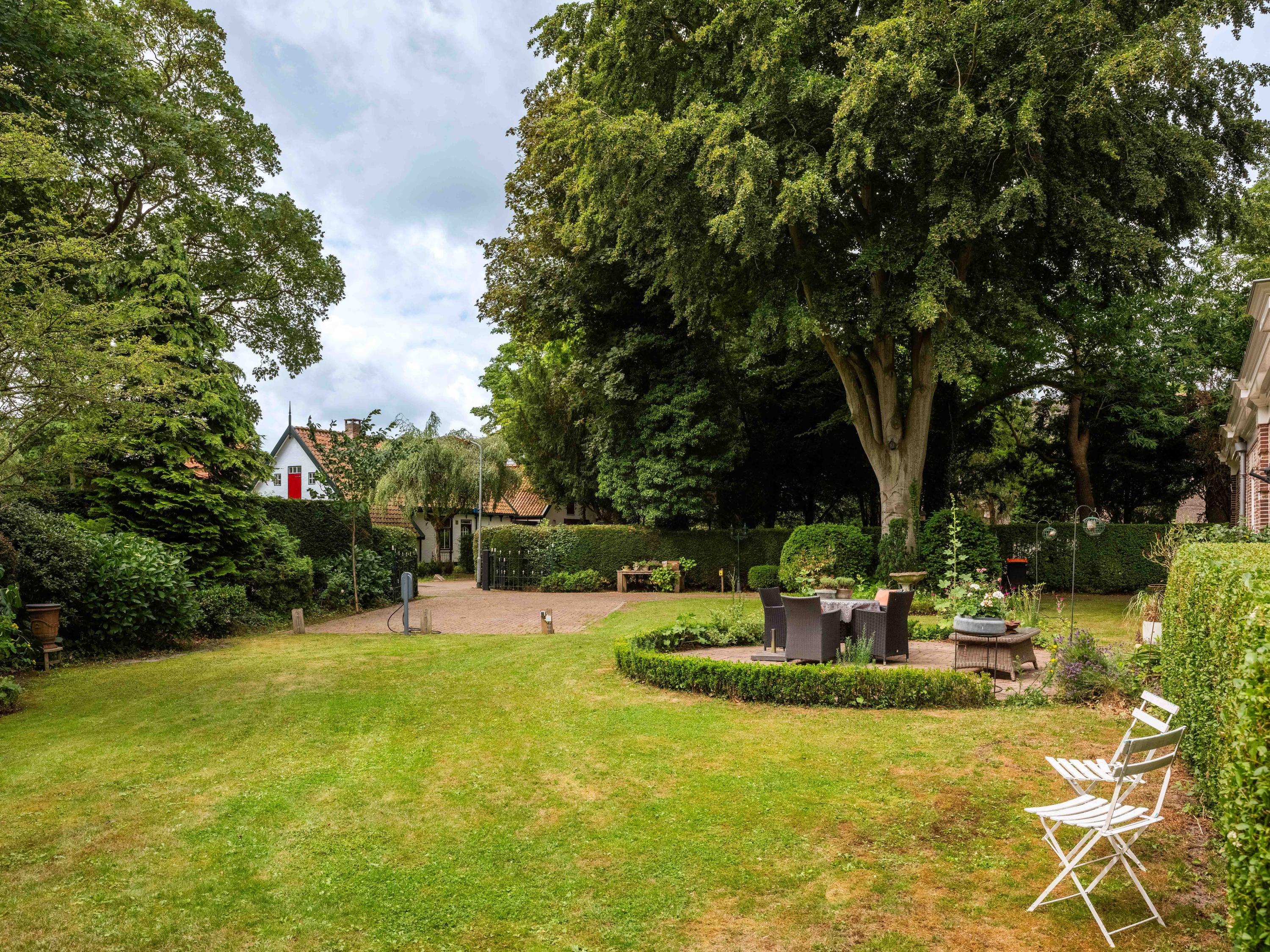 De tuin: Veel rust en privacy vindt u in de vol begroeide tuin rondom de woning. Het is een weelde om er doorheen te lopen. Zo vinden we er meerdere terrassen, een luxe plantenkas/orangerie, een kippenhok, een ruime houten garage met vide ( voor meerdere auto’s) en voldoende parkeergelegenheid daarnaast voor 2 auto’s. Tevens is de tuin voorzien van een bron en een bewateringssysteem.