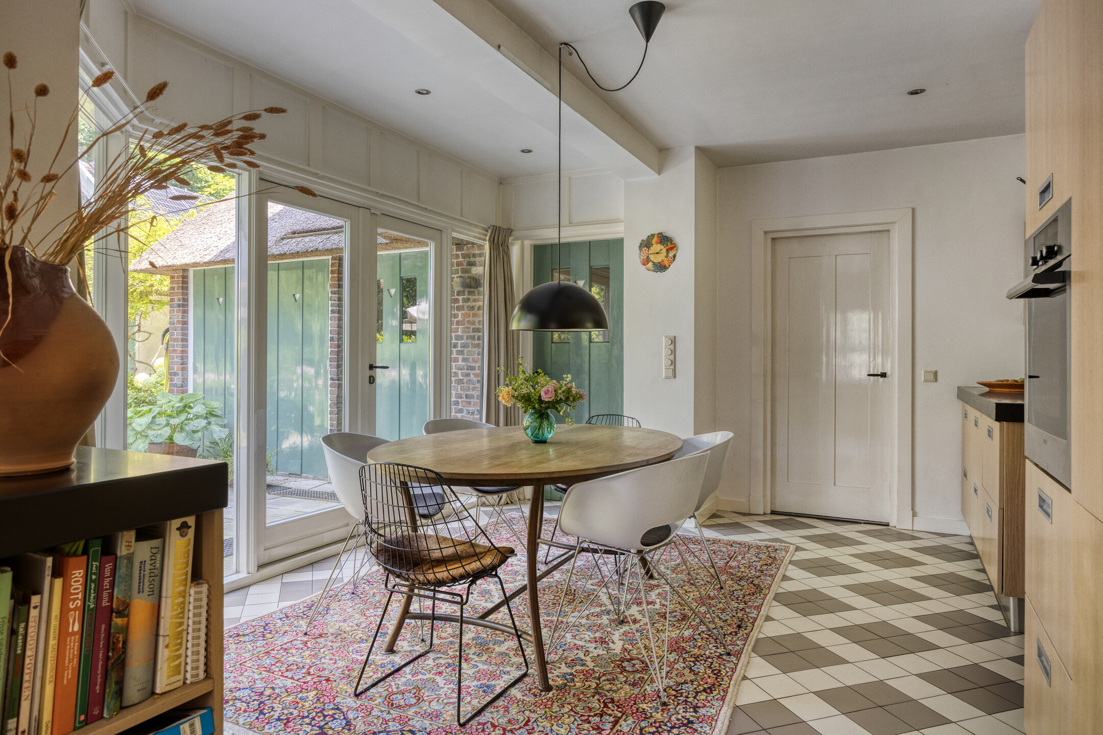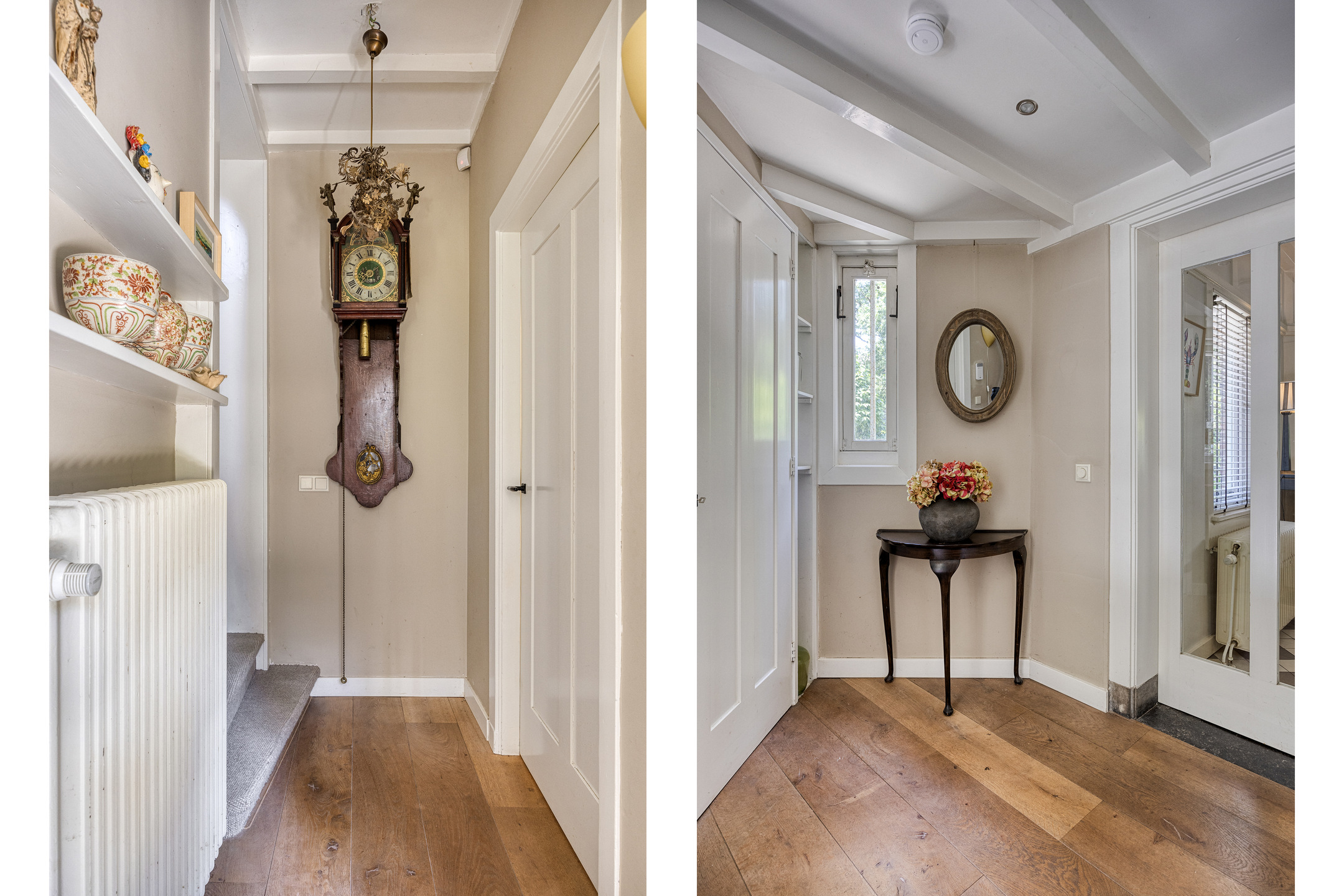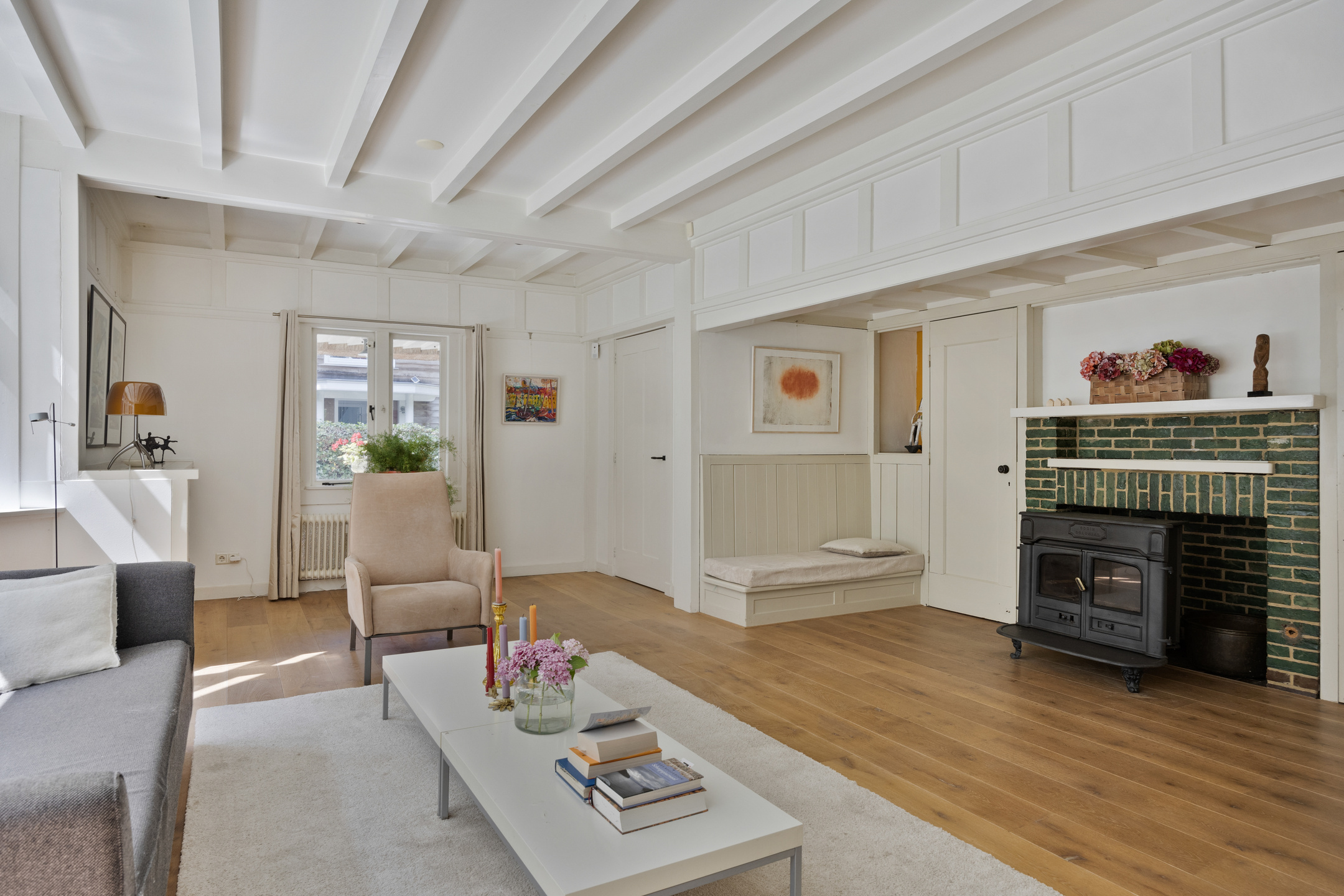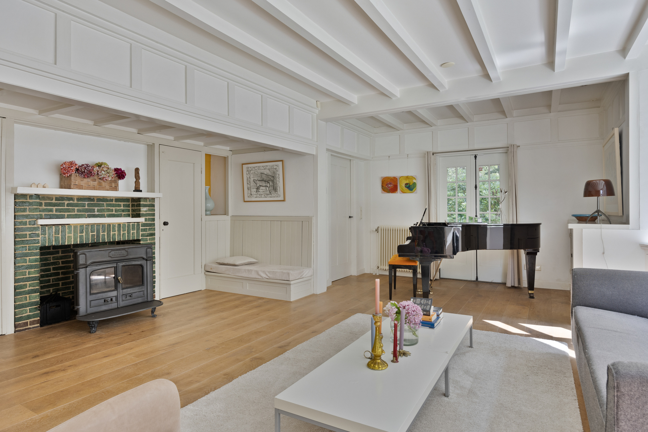 Vanuit de keuken bereikt u de TV-kamer met massief eiken vloer, ingebouwde kasten en grote raampartijen met monumentenglas. Aansluitend ligt de ruime woonkamer met erker, houtkachel en originele buffetkasten. Ook hier is de vloer van massief eikenhout. Het balkenplafond maakt de woonkamer tot een karakteristiek geheel! Zowel de woonkamer, de keuken als de TV-kamer hebben een originele schouw. Vanuit de hal bij de entree is de diepe en grote kelder bereikbaar, ideaal vooropslag van wijn e.d.