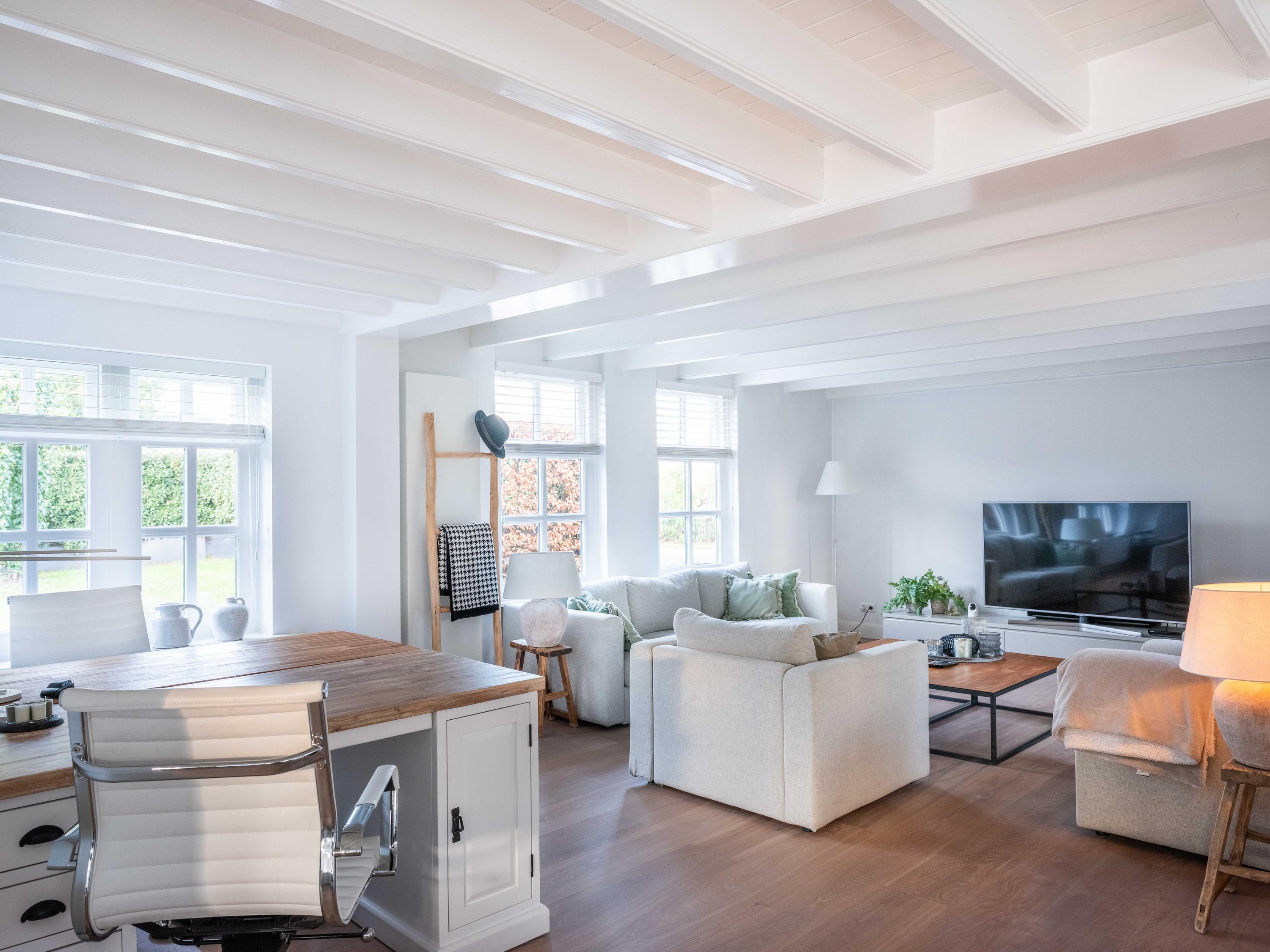 Bij binnenkomst valt direct de fijne sfeer op. De royale hal met trapopgang en modern toilet geeft toegang tot de praktische bijkeuken en leidt verder naar de eetkamer met open haard. Vanuit hier openen dubbele tuindeuren naar de fraai aangelegde tuin, waardoor binnen en buiten moeiteloos in elkaar overlopen. De woonkamer sluit naadloos aan op de designkeuken van Piet Jan van den Kommer – een echte blikvanger die perfect past bij de landelijke stijl van het huis. De houten vloeren en balkenplafonds versterken het gevoel van warmte en karakter.